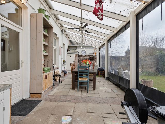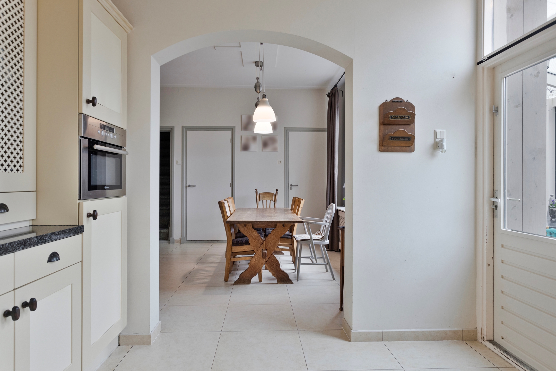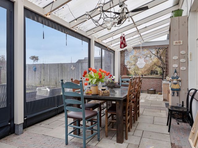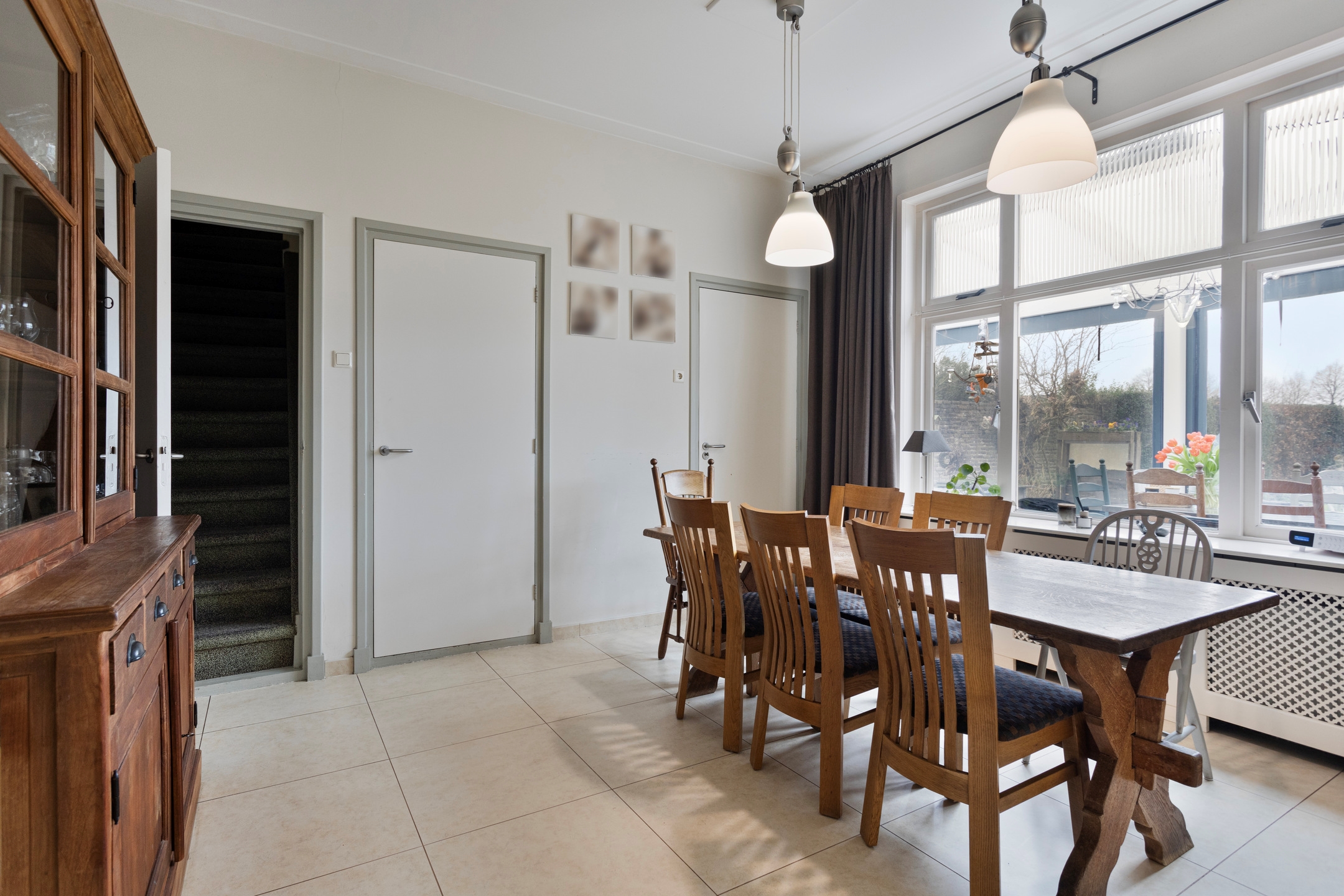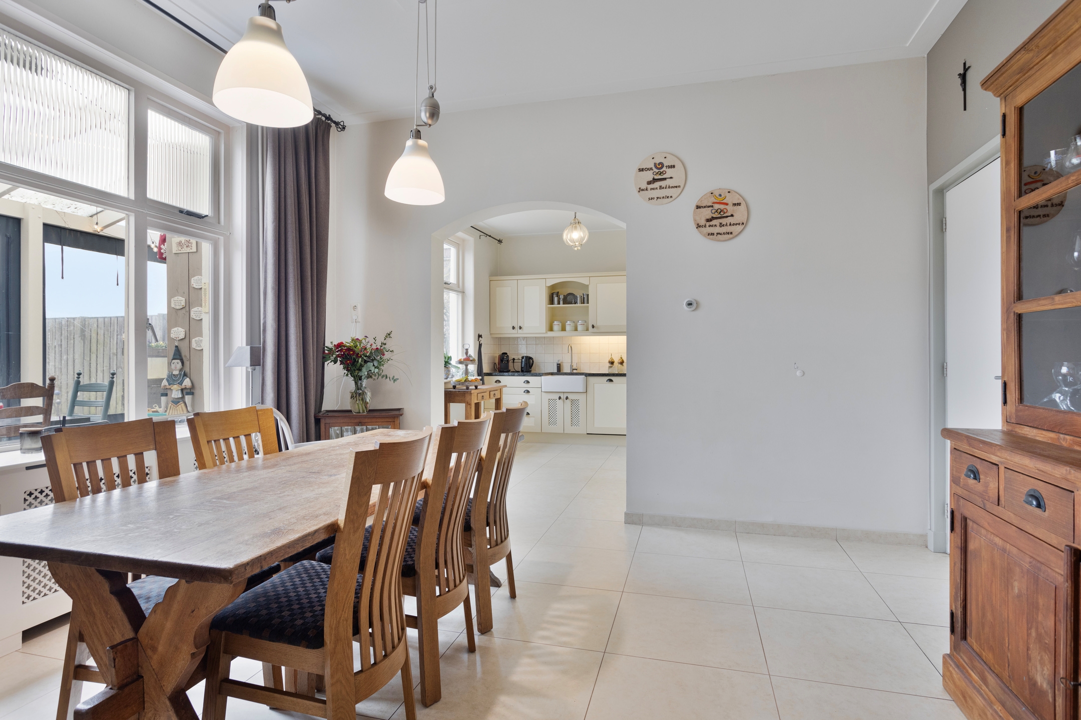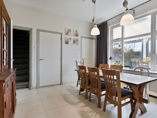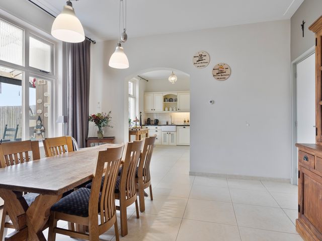 De eetkamer is een lichte en aangename ruimte met een mooie verbinding naar de tuin en keuken. De grote raampartijen zorgen voor veel natuurlijk licht, wat bijdraagt aan een open en sfeervolle uitstraling.