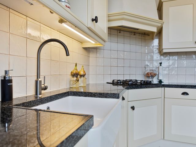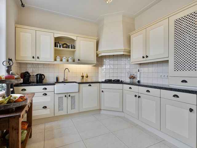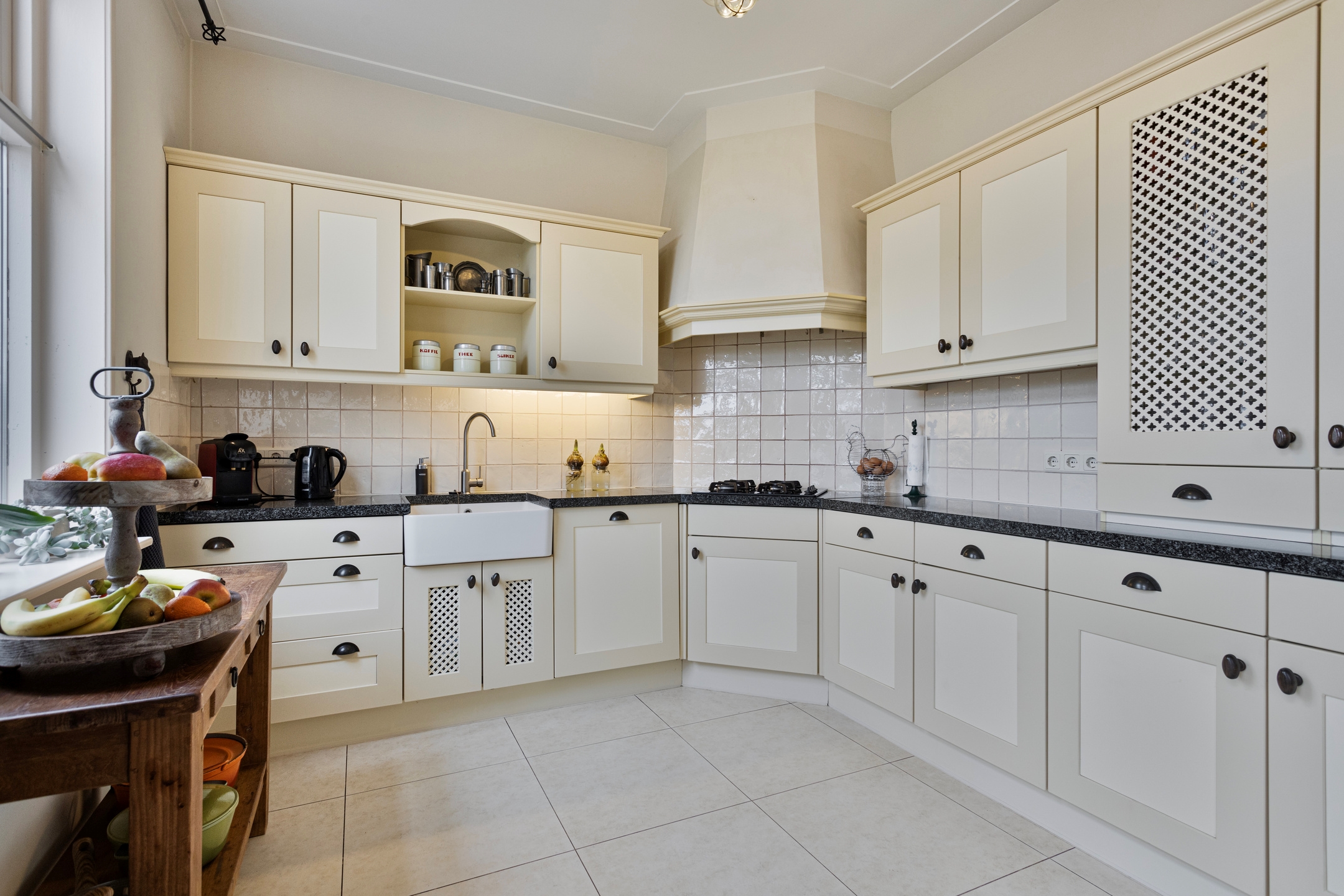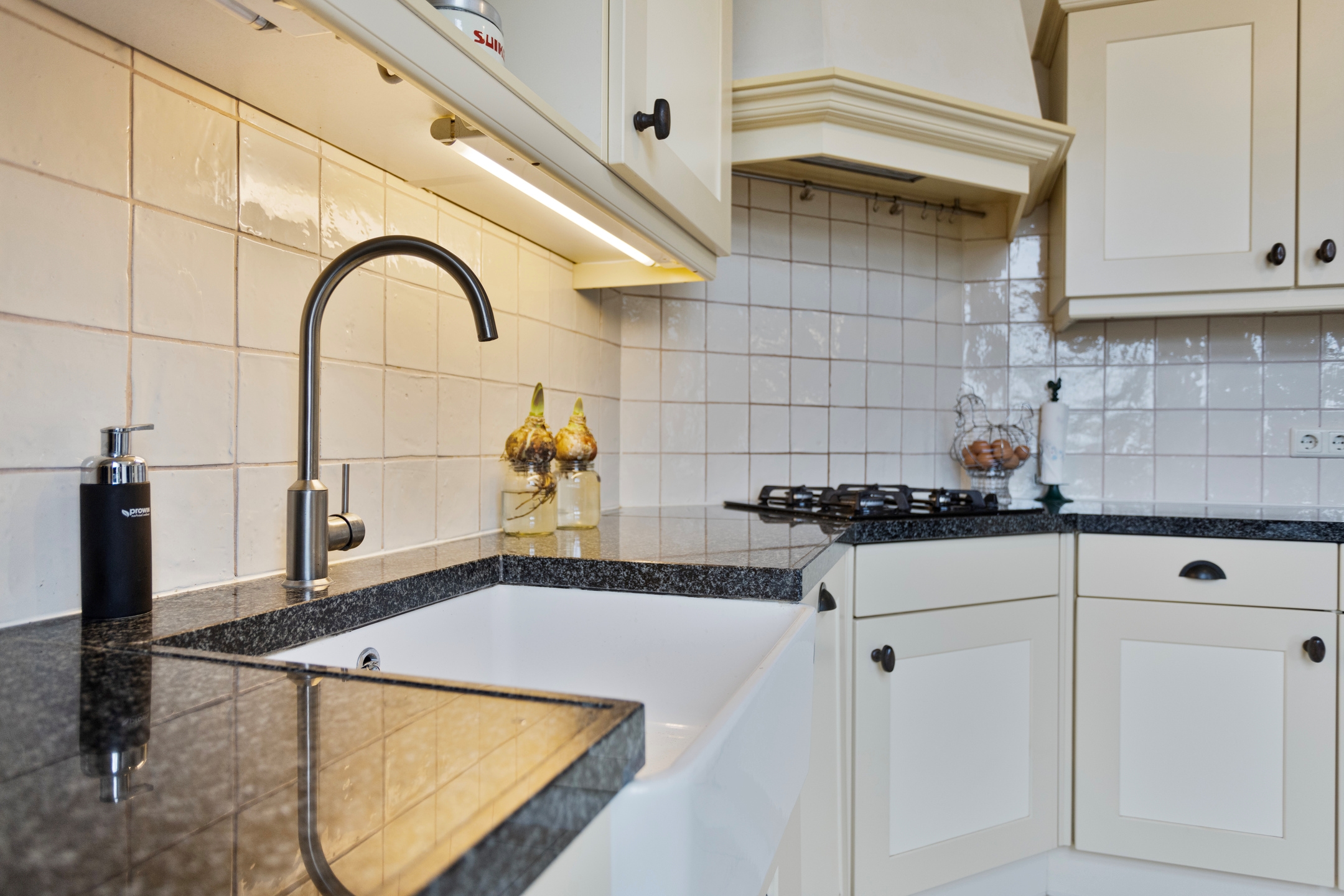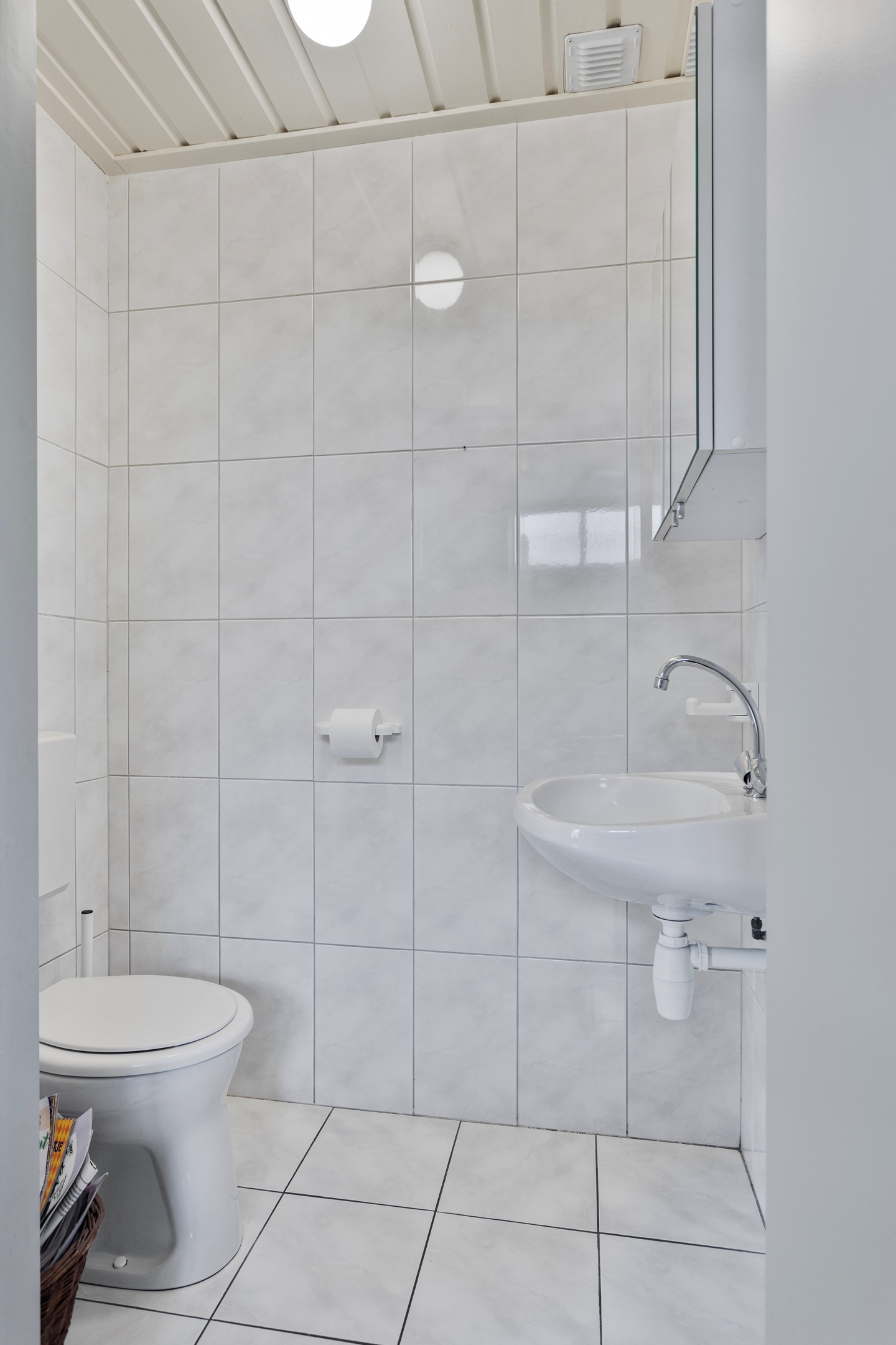 Vanuit de eetkamer bereikt u de keuken, voorzien van een stijlvol aanrechtblad en moderne apparatuur, waaronder een vaatwasser, 4-pits gaskookplaat, oven, ingebouwde koelkast en afzuigkap. De prachtig ingelegde wasbak springt direct in het oog. De vloer is voorzien van vloertegels met vloerverwarming en de wanden zijn deels strak gestuct en deels betegeld. Grote ramen zorgen voor veel natuurlijk licht en via de loopdeur heeft u directe toegang tot de overkapping.