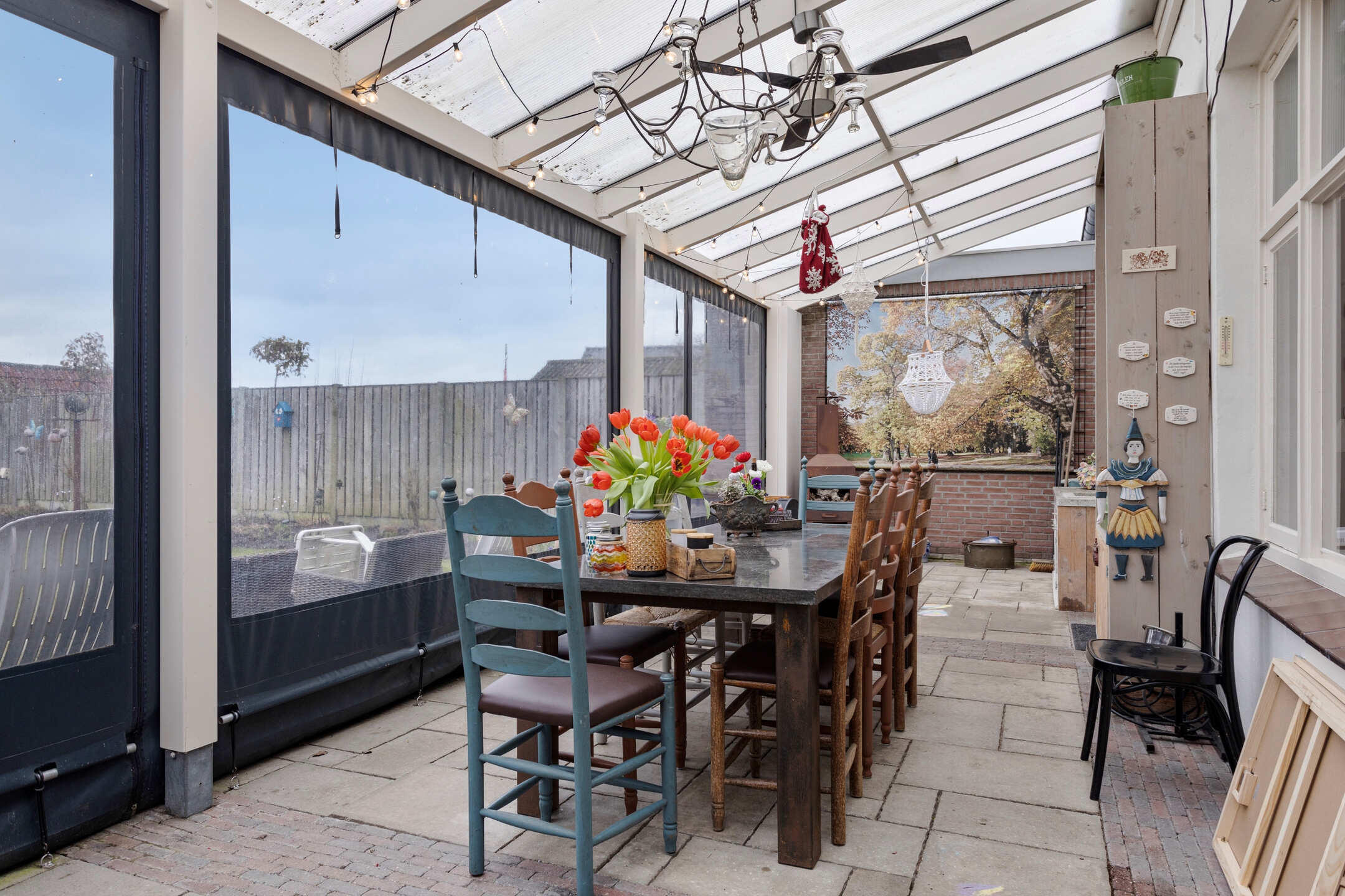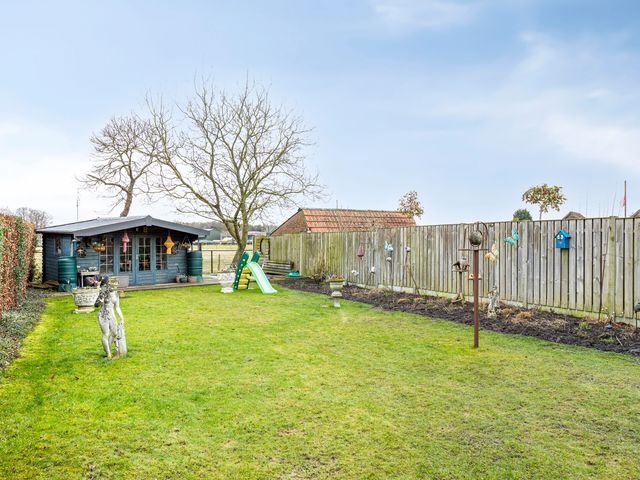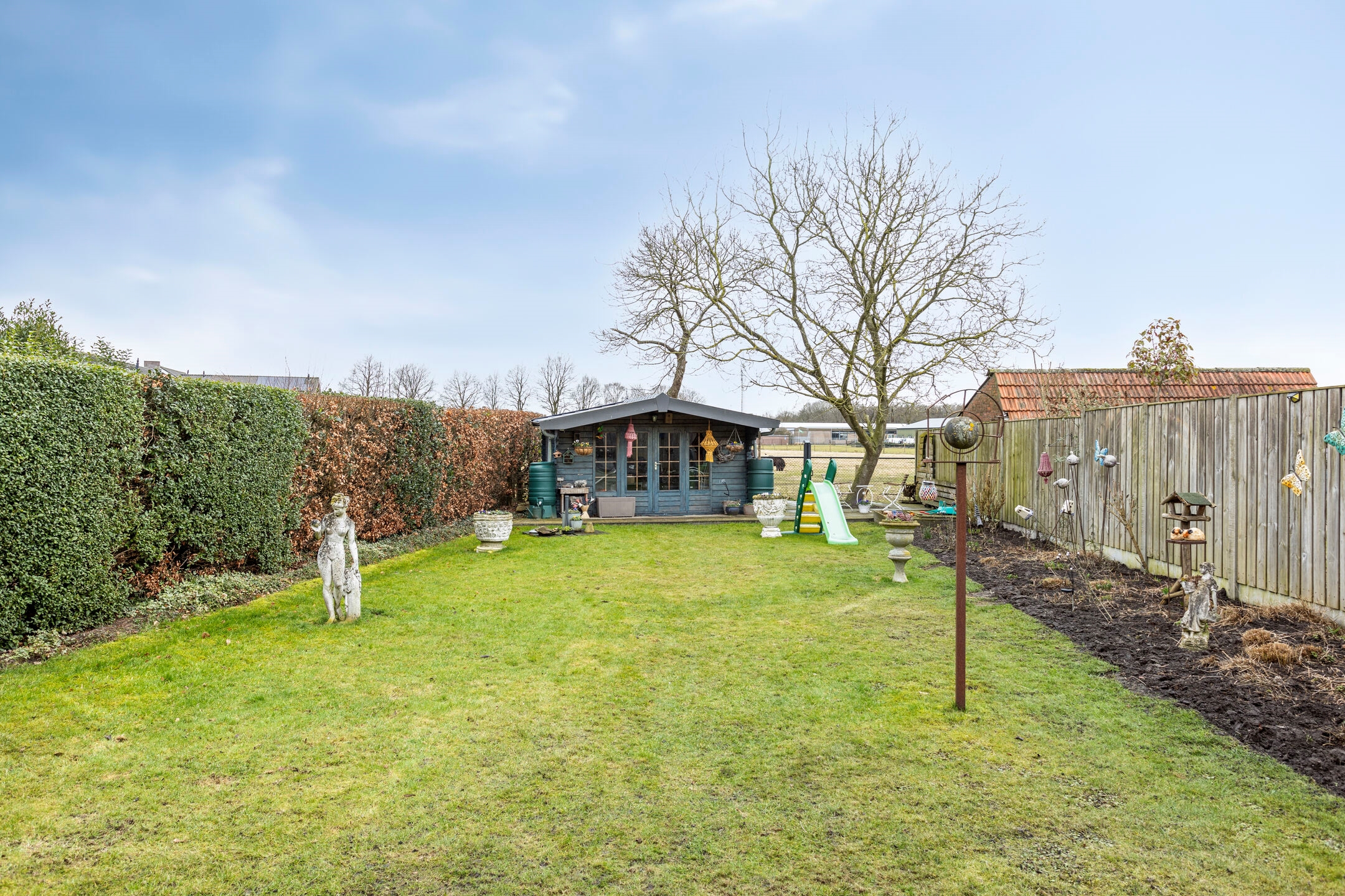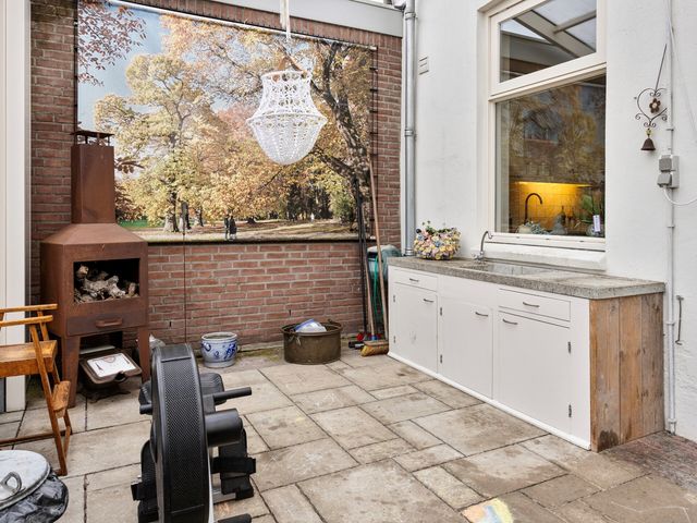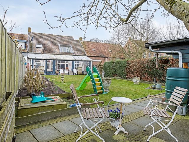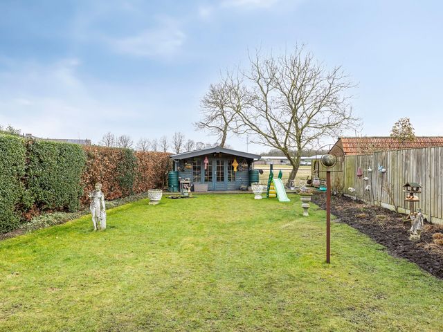 De achtertuin is ruim opgezet en verzorgd aangelegd, met een groot gazon dat perfect geschikt is voor ontspanning of activiteiten. Direct aan de woning bevindt zich een royale overkapping, compleet met verlichting, elektra en een buitenkeuken. Deze overkapping biedt een comfortabele plek om het hele jaar door van de tuin te genieten. Daarnaast geeft de tuin toegang tot een houten berging, die zorgt voor extra opbergruimte.