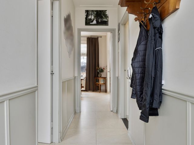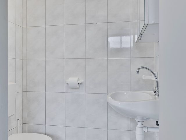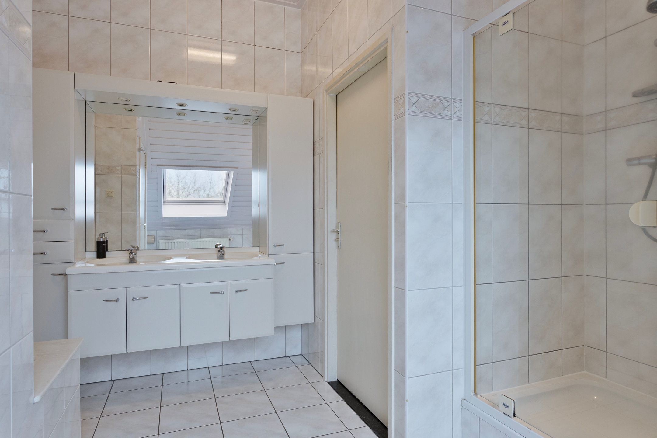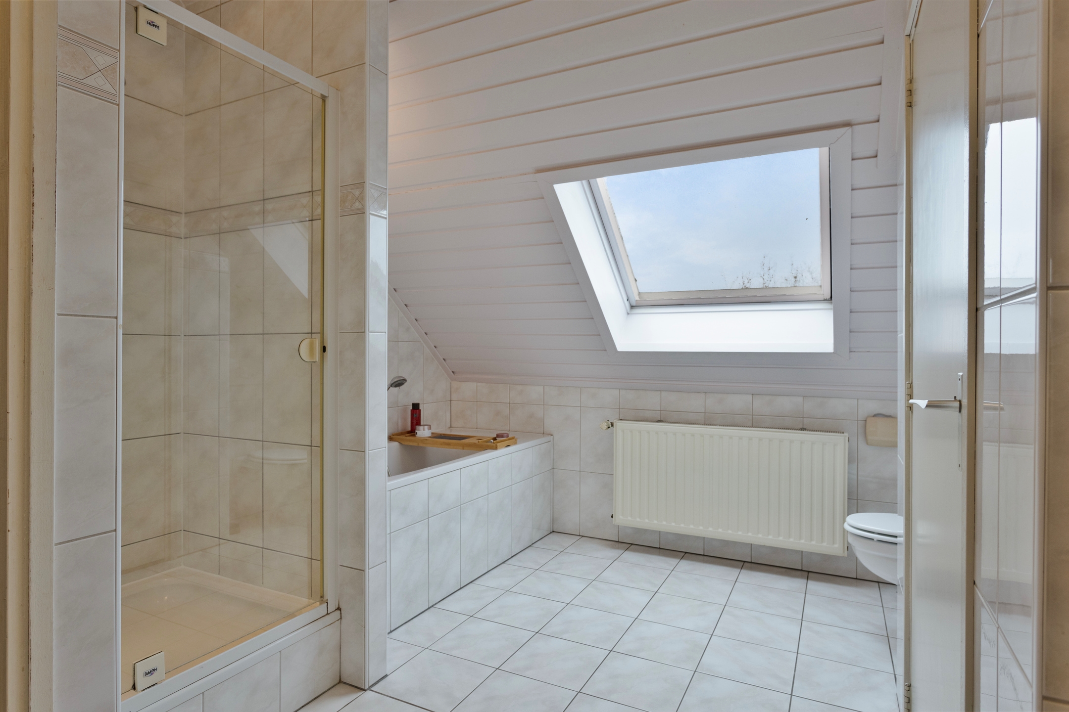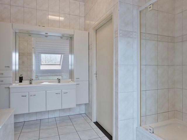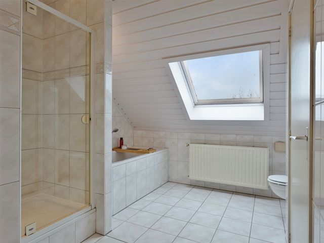 De badkamer is van alle gemakken voorzien, met een ligbad, aparte douche, dubbele wastafel met meubel en een toilet. De ruimte is volledig betegeld en uitgerust met comfortabele vloerverwarming. Het dakraam zorgt voor extra ventilatie en een prettige lichtinval, wat de badkamer een frisse en ruime uitstraling geeft.