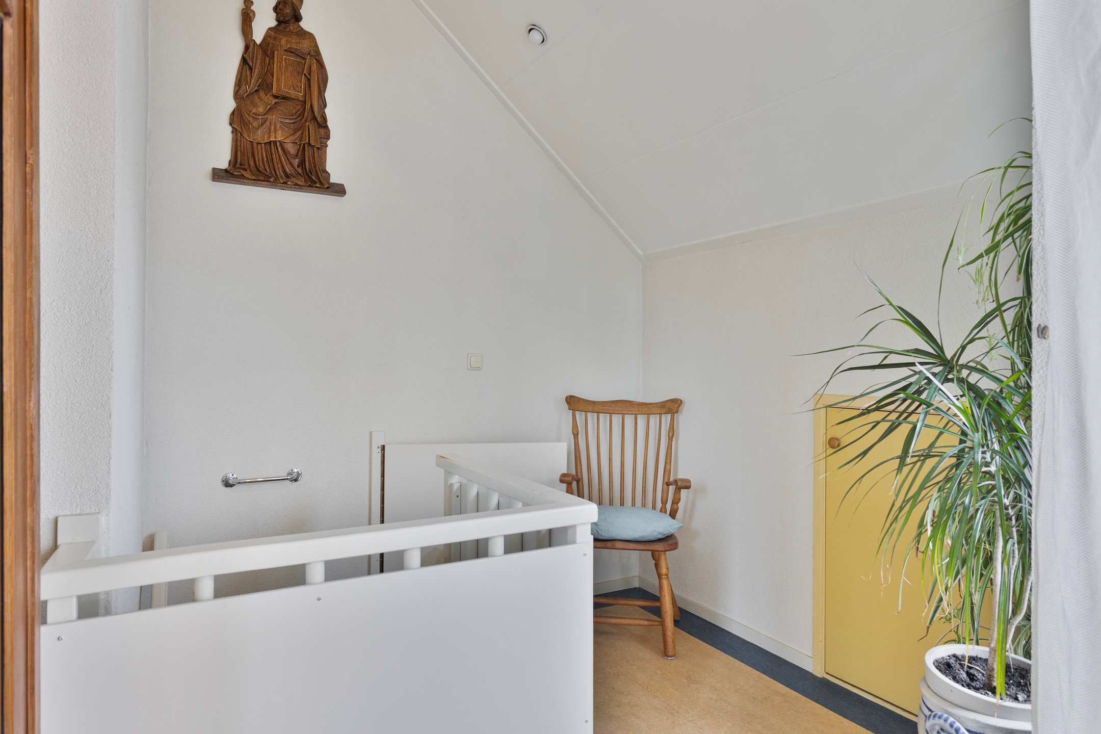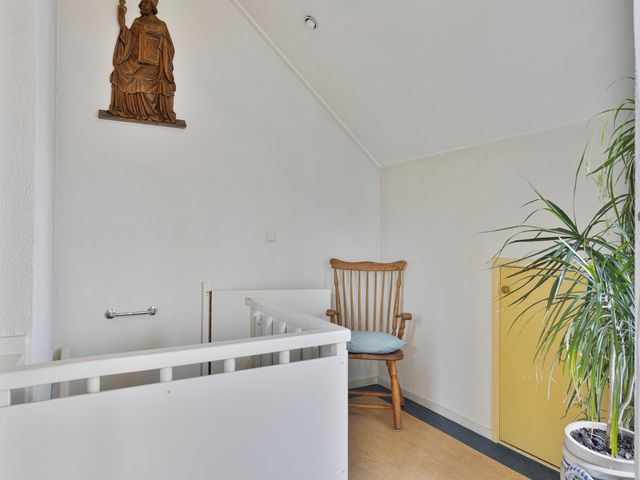 Vanuit de eetkamer leidt de trap naar de eerste verdieping. Op de overloop heeft u toegang tot drie slaapkamers, een ruime badkamer, extra bergruimte en het balkon. De gehele verdieping, met uitzondering van de badkamer, is voorzien van een fraaie linoleumvloer.