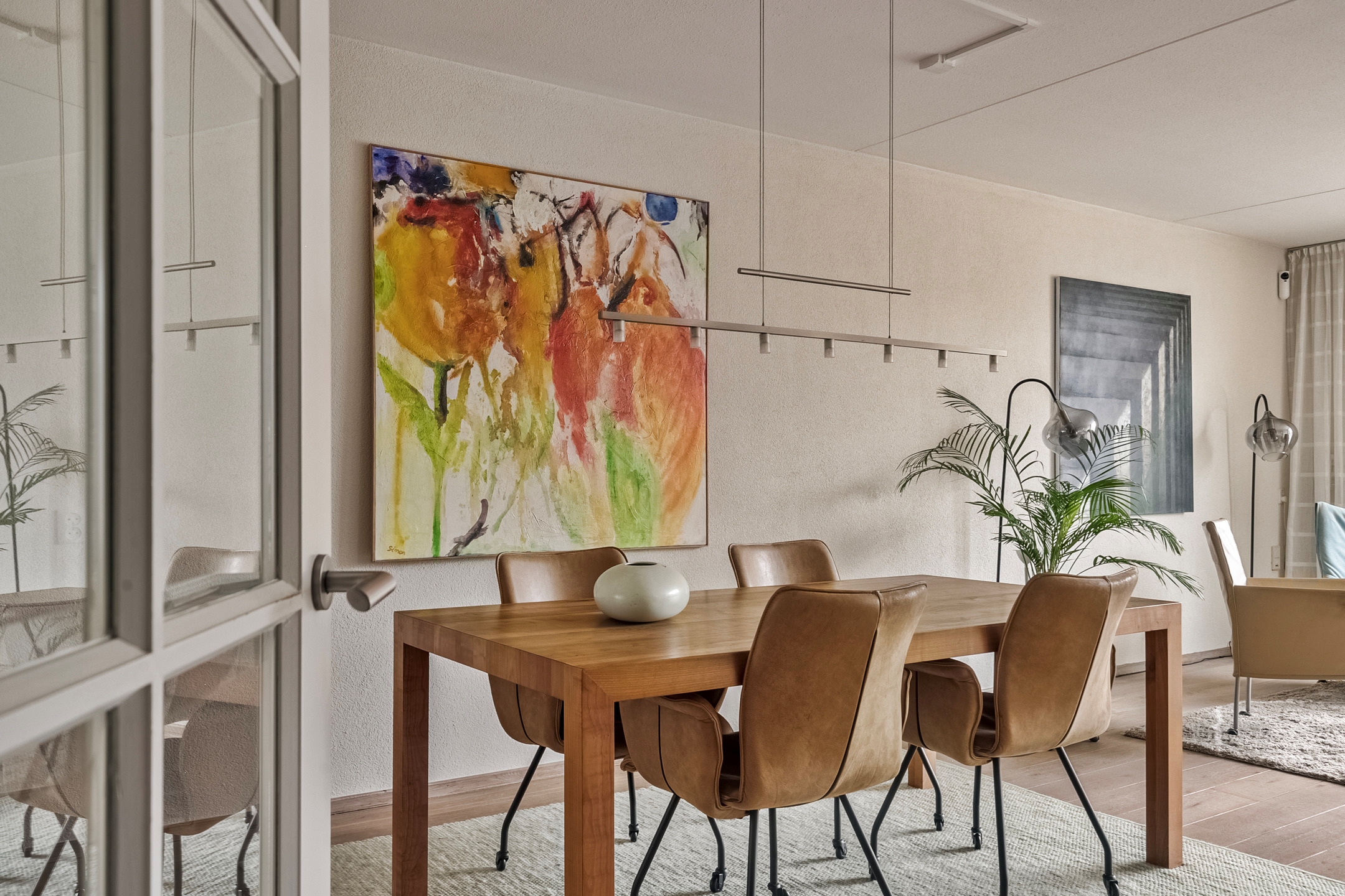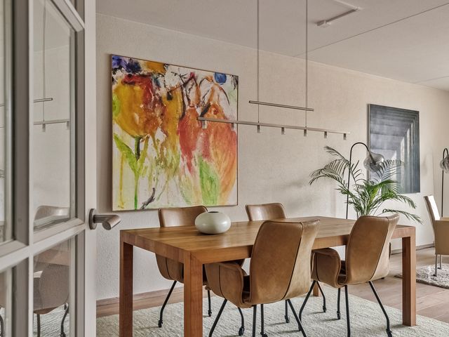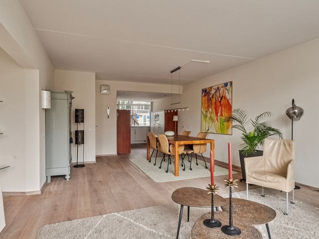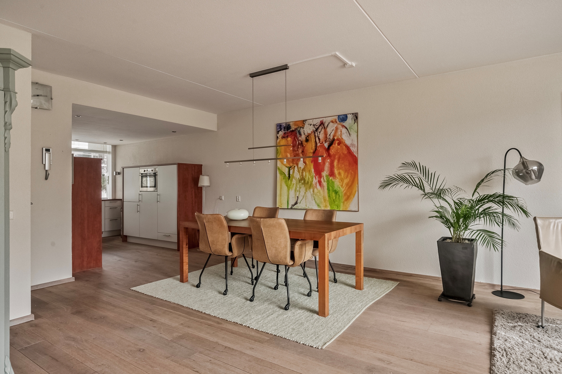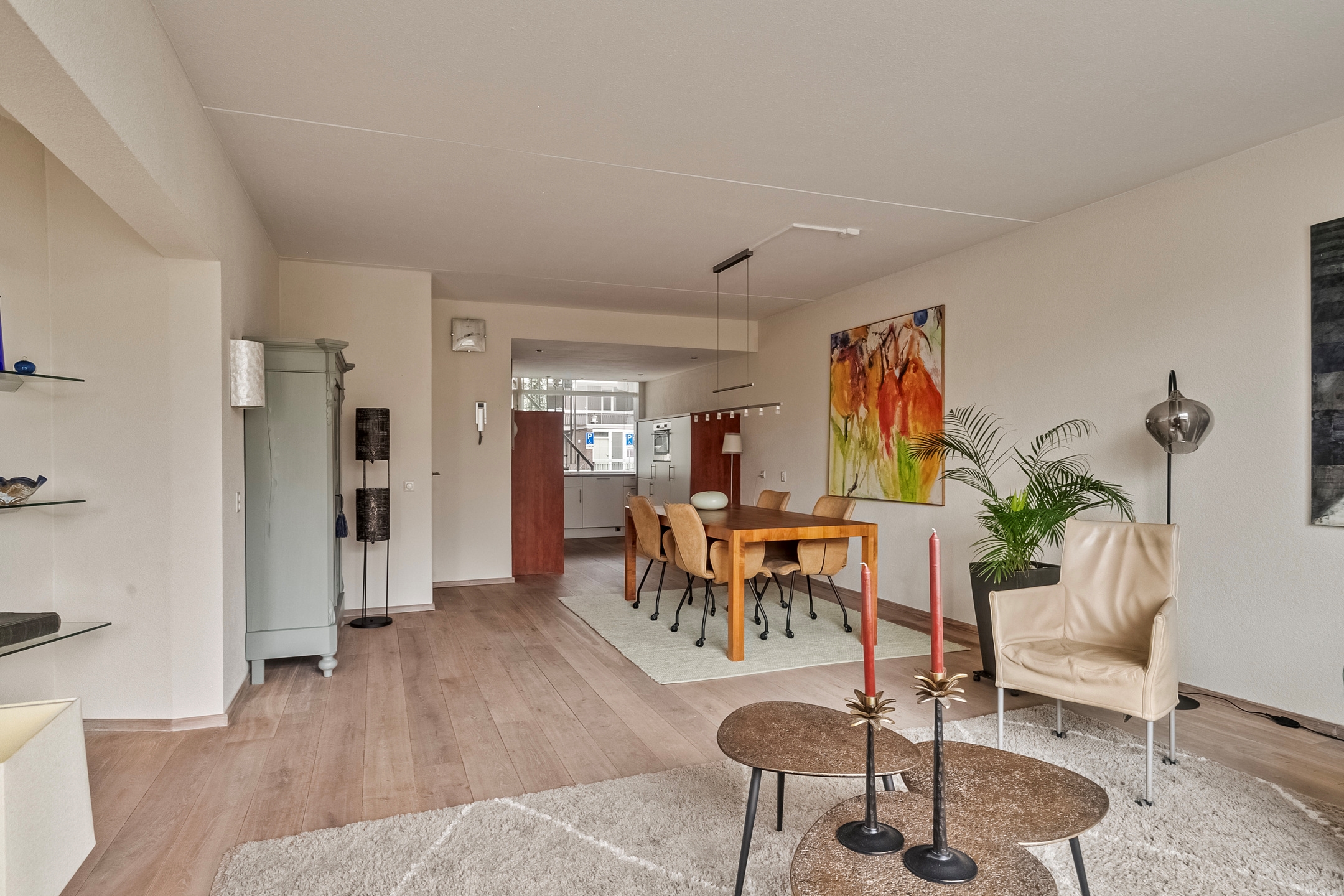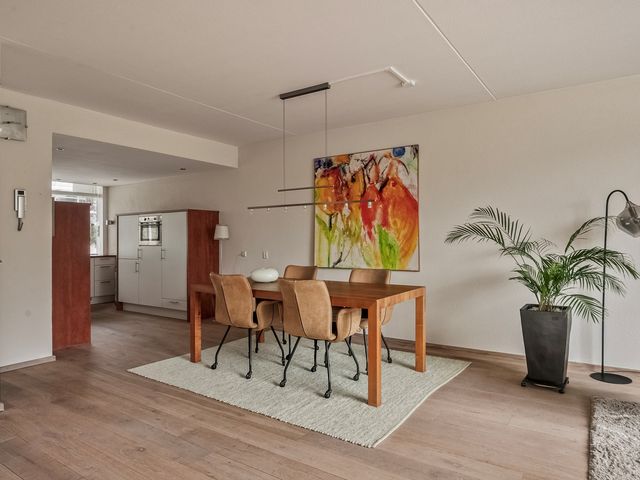De ruime woonkamer biedt veel lichtinval dankzij de brede raampartijen. De strakke afwerking van het plafond en de wanden en de houten vloer zorgen voor een luxe uitstraling.