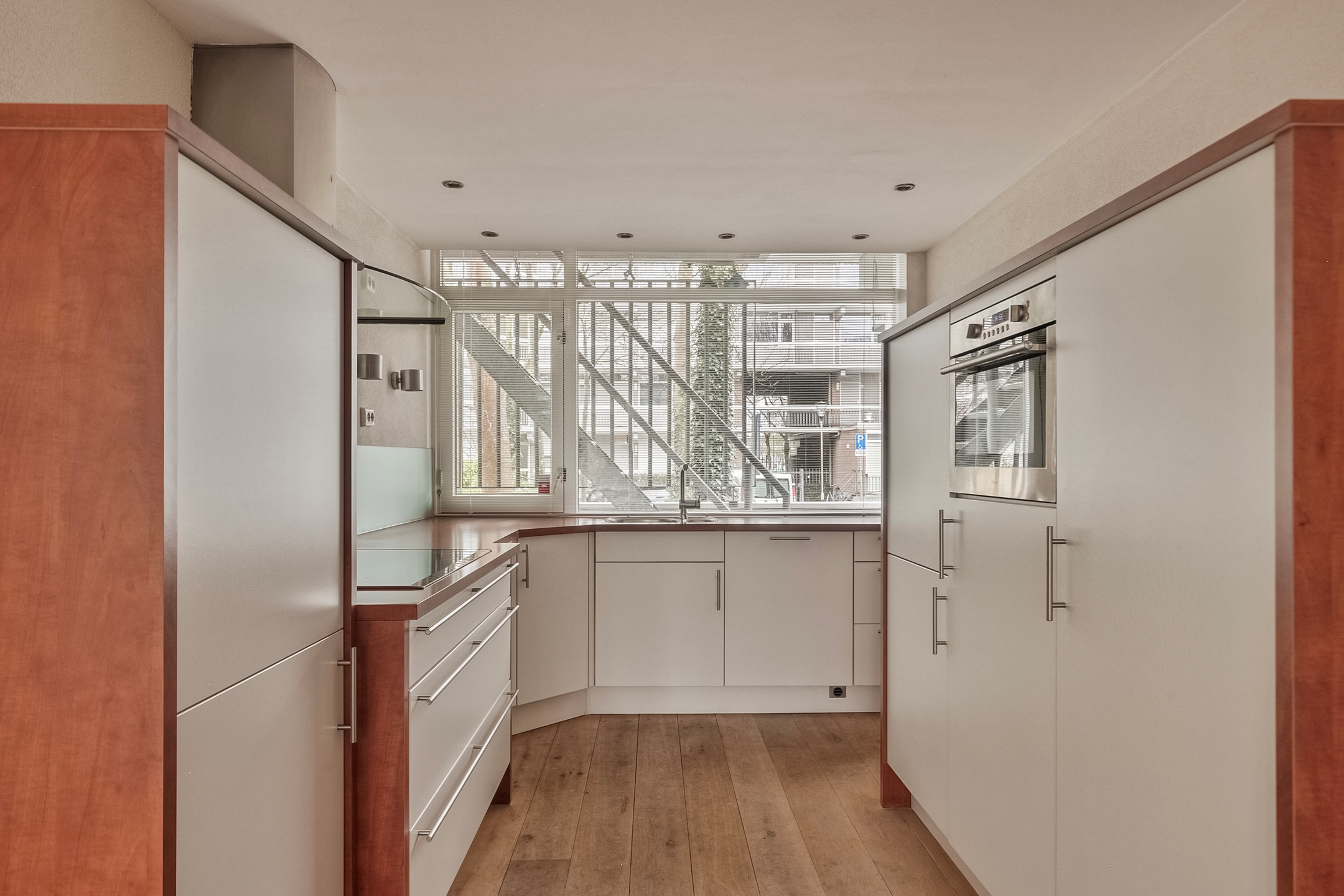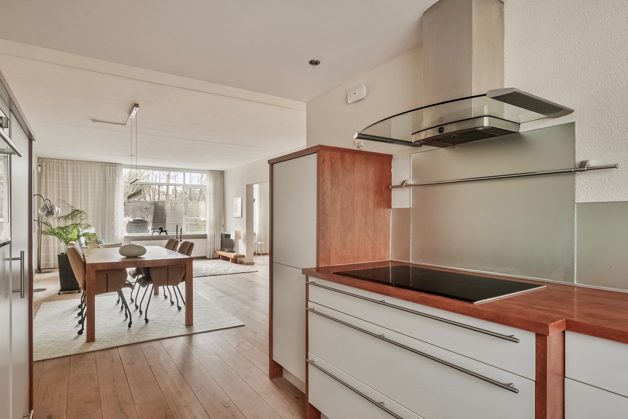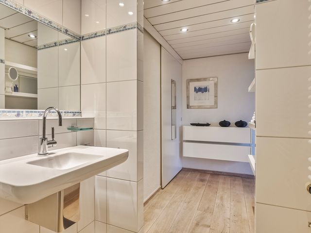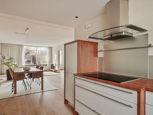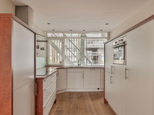 De keuken is uitgerust met een fraai keukenblok, een losse kastenwand en sfeervolle inbouwspots. De inbouwapparatuur bestaat uit een kookplaat, een afzuigkap, een combi-oven, een vaatwasser en een koel-/vriescombinatie.