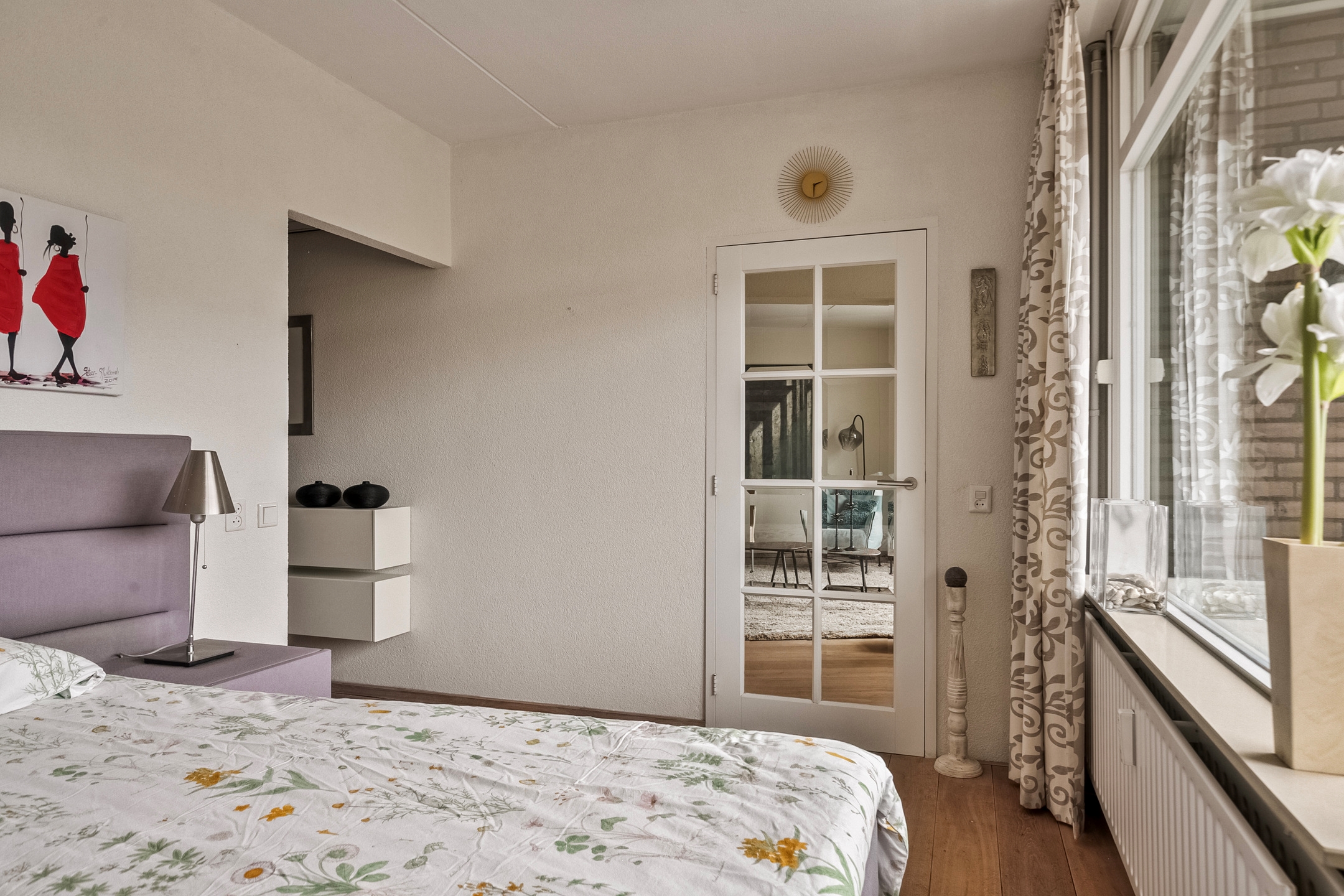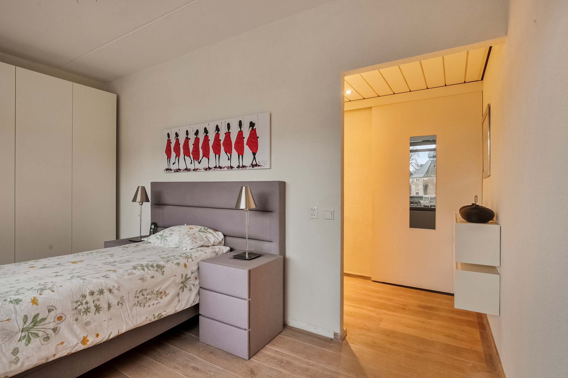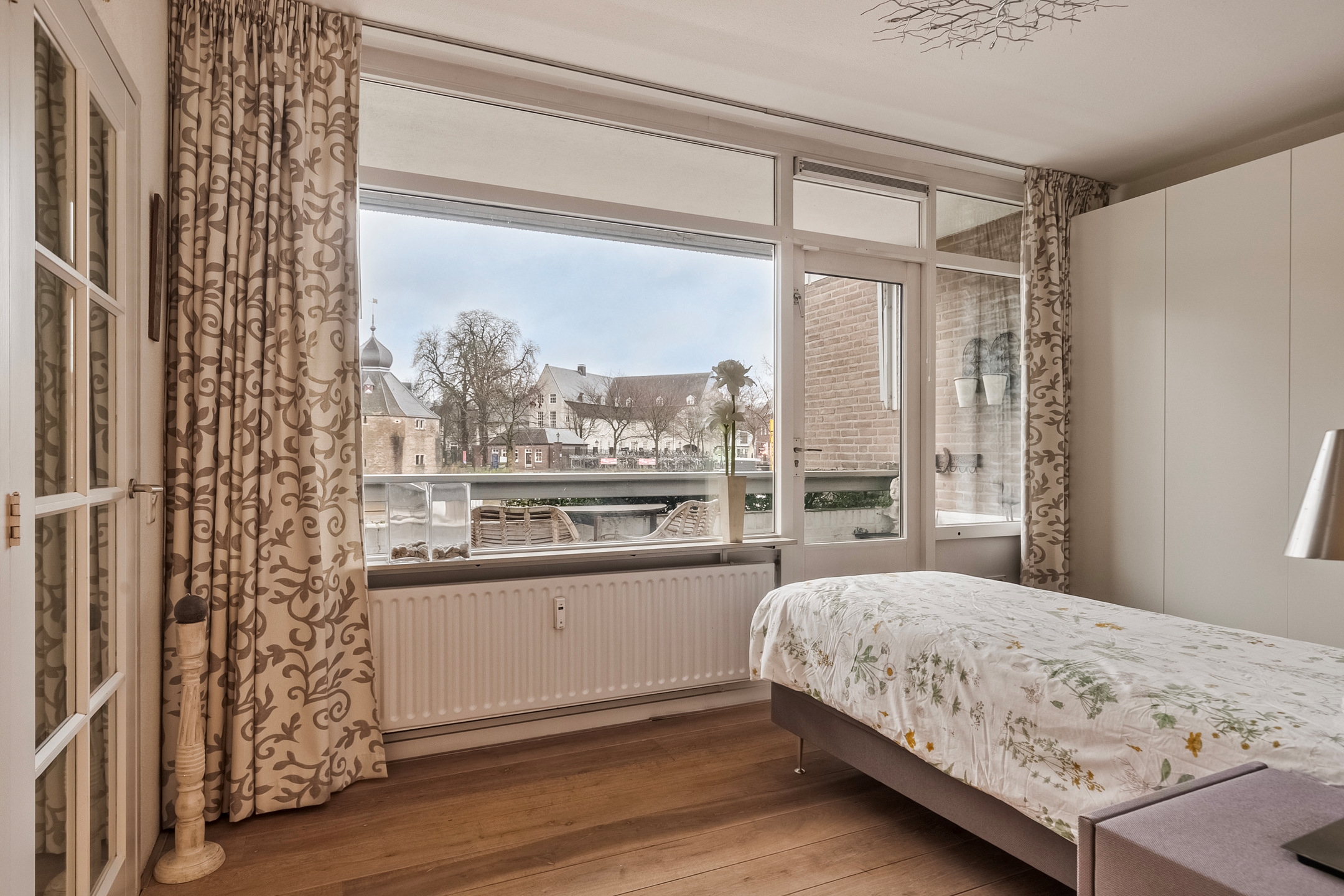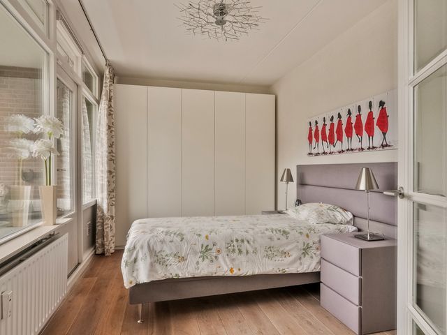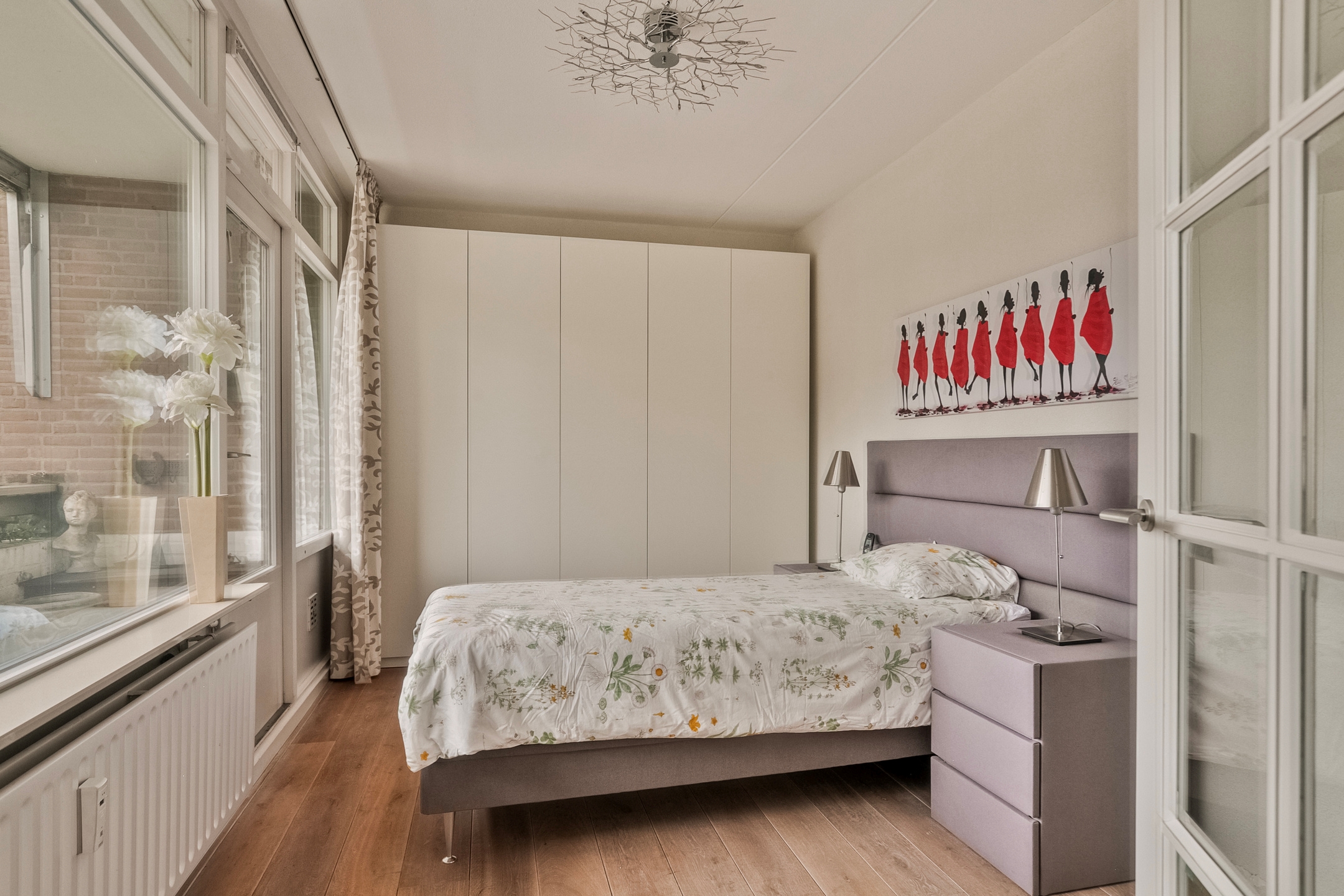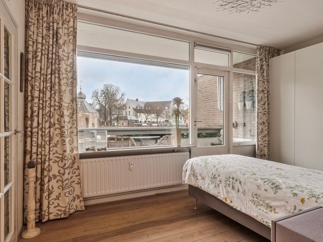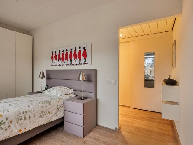 De eerste slaapkamer is voorzien van een nette houten vloer. Vanuit deze slaapkamer heeft u toegang tot het balkon met een prachtig uitzicht op de Grote Kerk en de historische binnenstad van Breda.