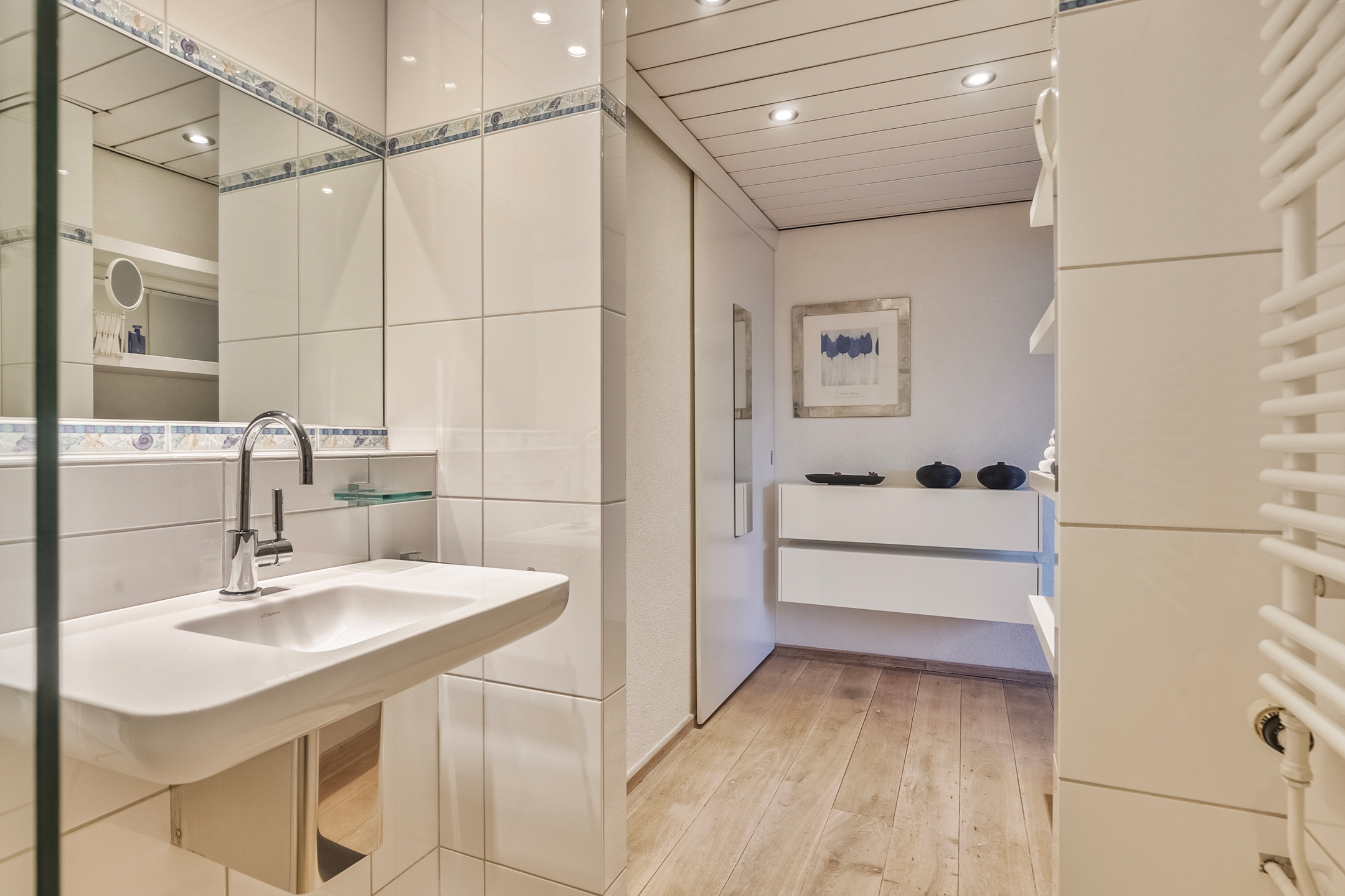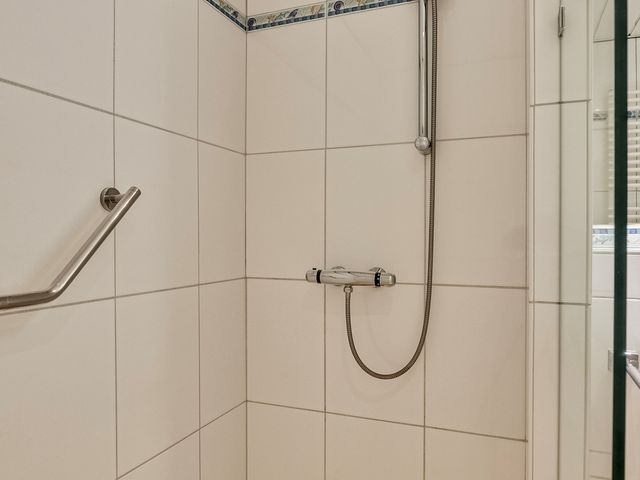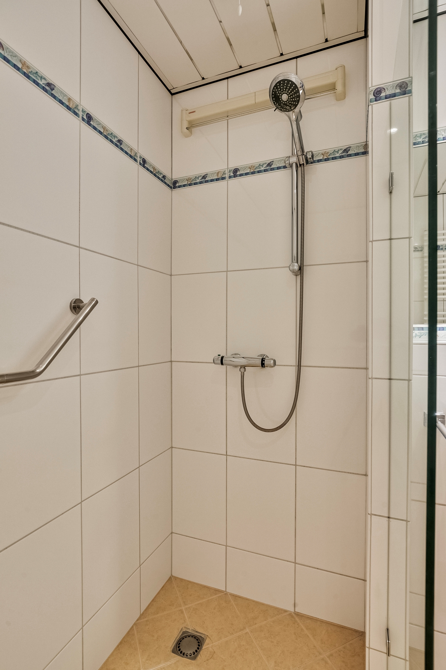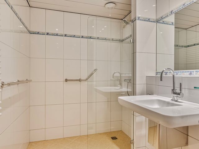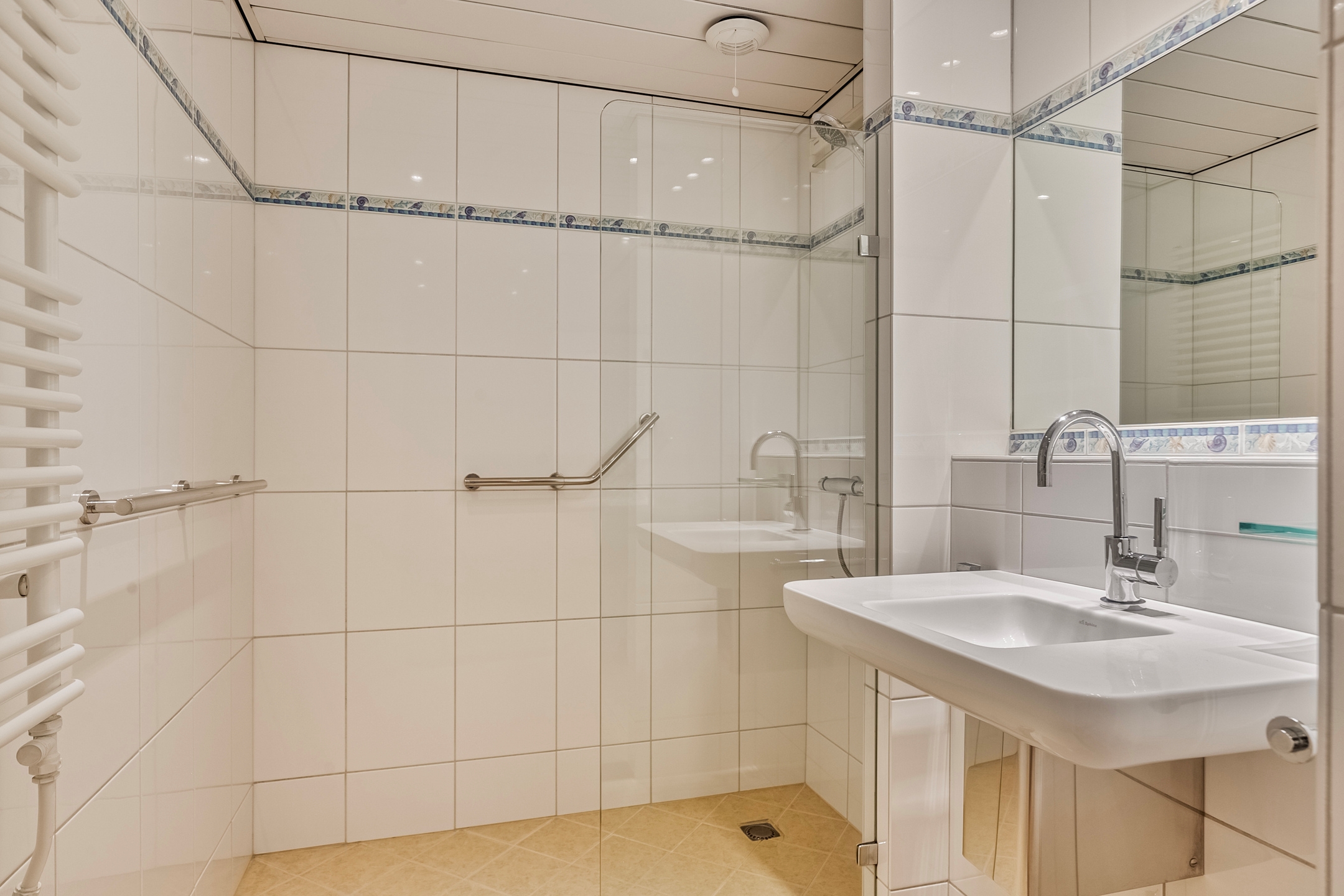 De geheel betegelde badkamer beschikt over een inloopdouche en een wastafel.