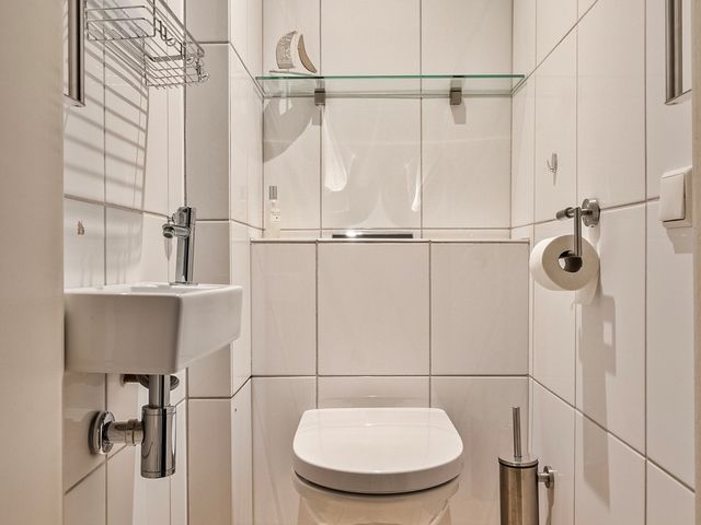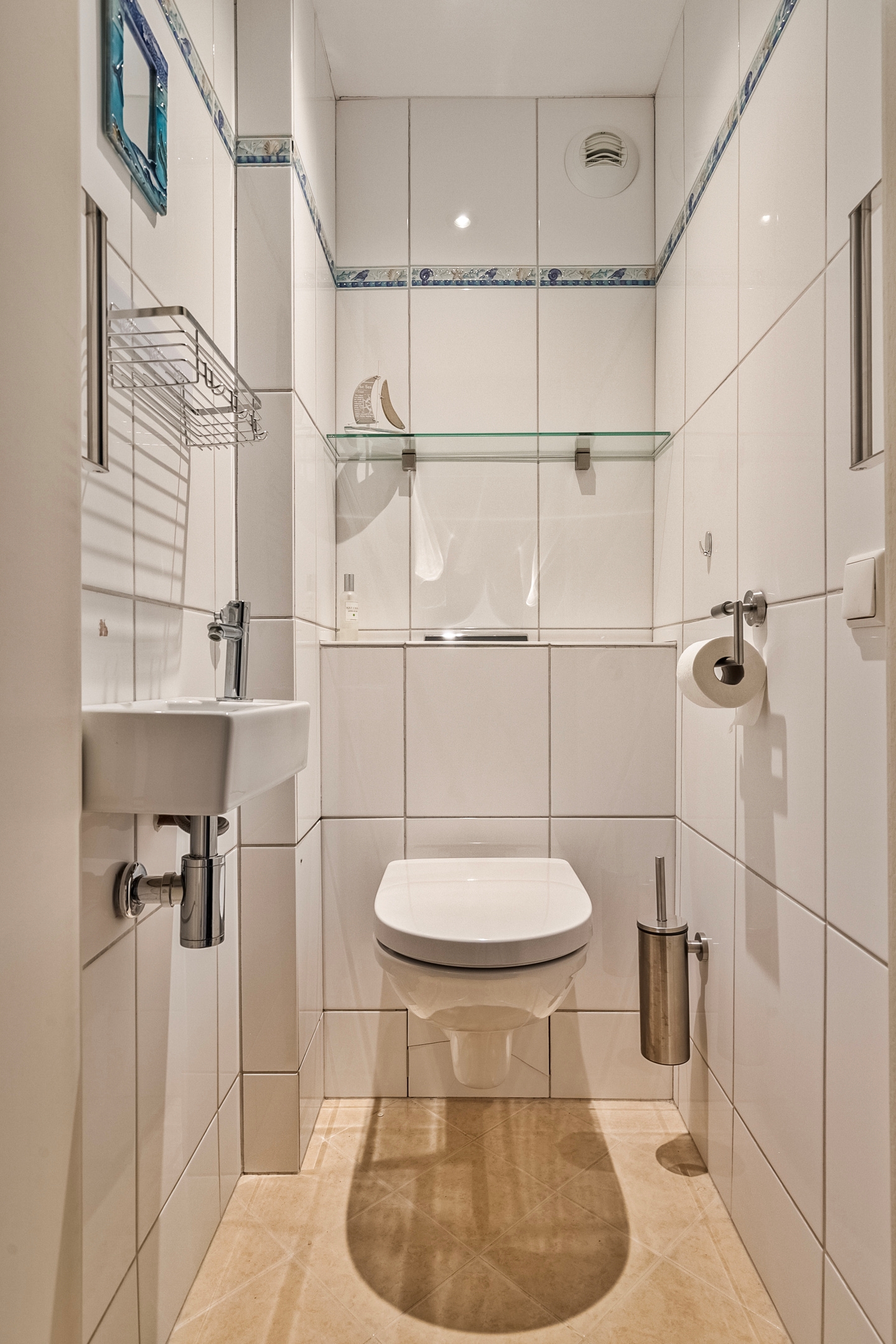 Het separate toilet is geheel betegeld en voorzien van een wandcloset en een fonteintje.