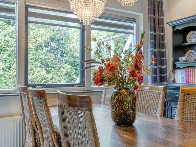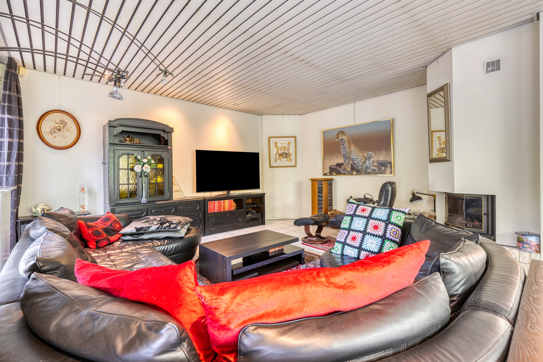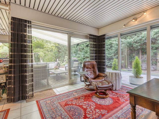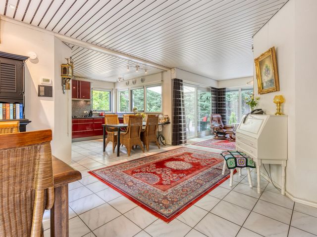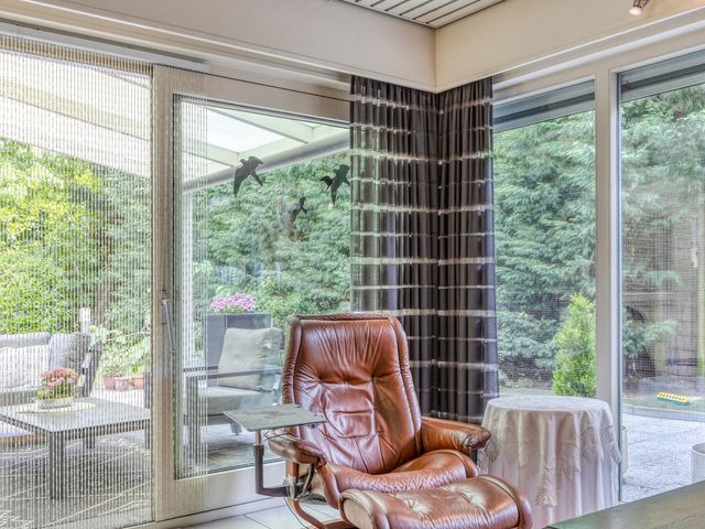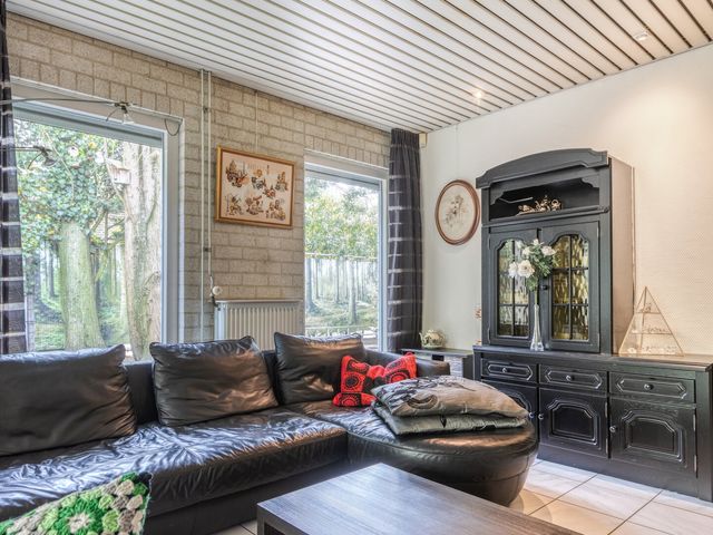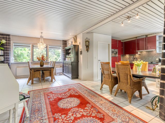 De woonkamer bevindt zich aan de achterzijde van de woning, in een prettige L-vorm, en kijkt uit over de fraai aangelegde tuin. Grote raampartijen en een schuifpui zorgen voor veel lichtinval en een directe verbinding met buiten. In de tuin vindt u een jacuzzi (bubbelbad) voor ultieme ontspanning.