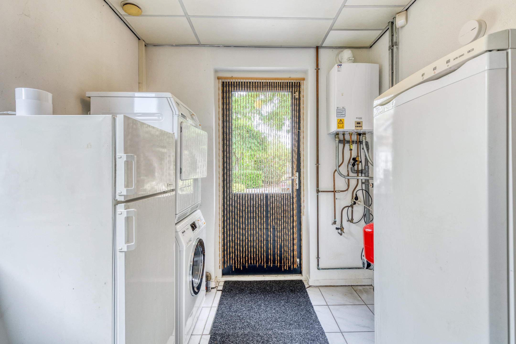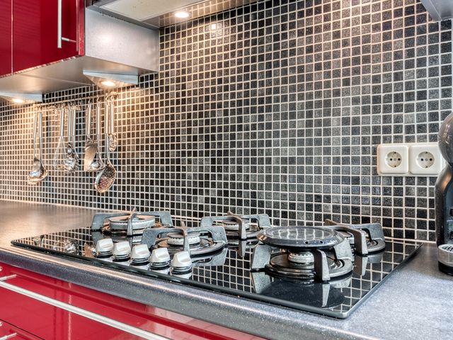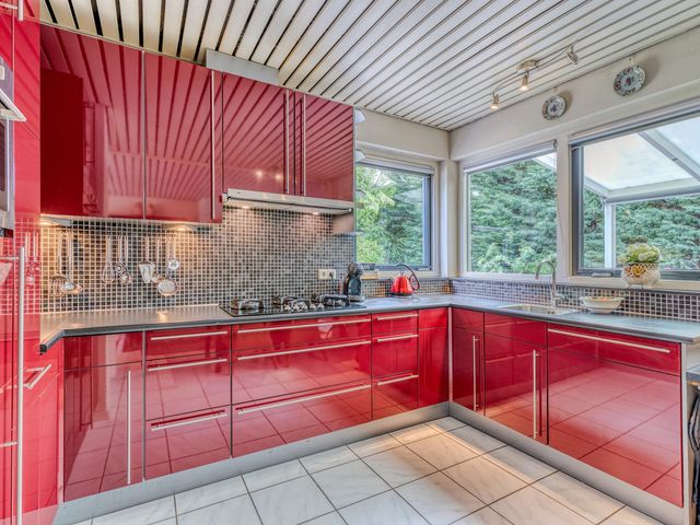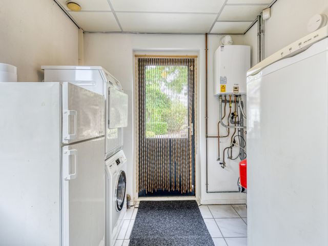 De moderne keuken (ca. 2013) is functioneel ingericht en sluit aan op een bijkeuken. De bijkeuken is uitgerust met een wasmachine-/drogeraansluiting en extra koeling/vriezer, en biedt eveneens toegang tot de tuin.