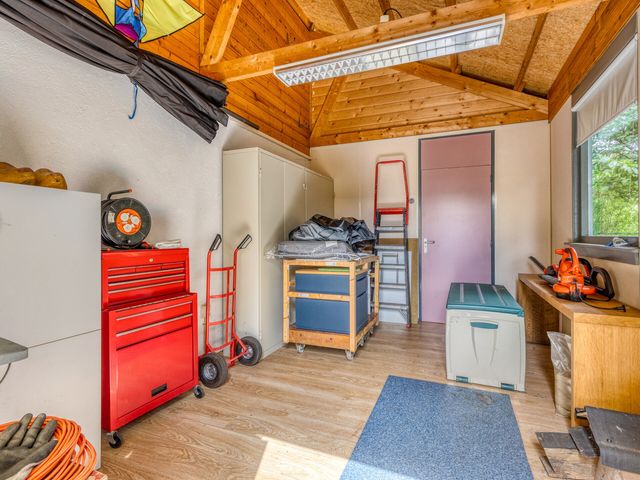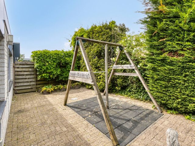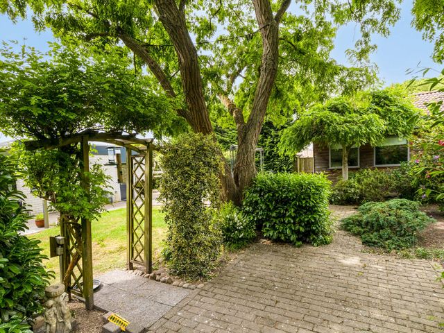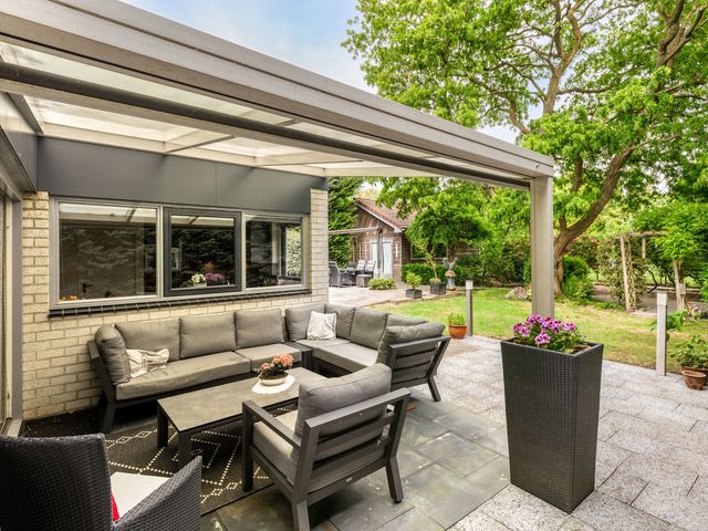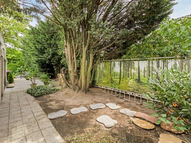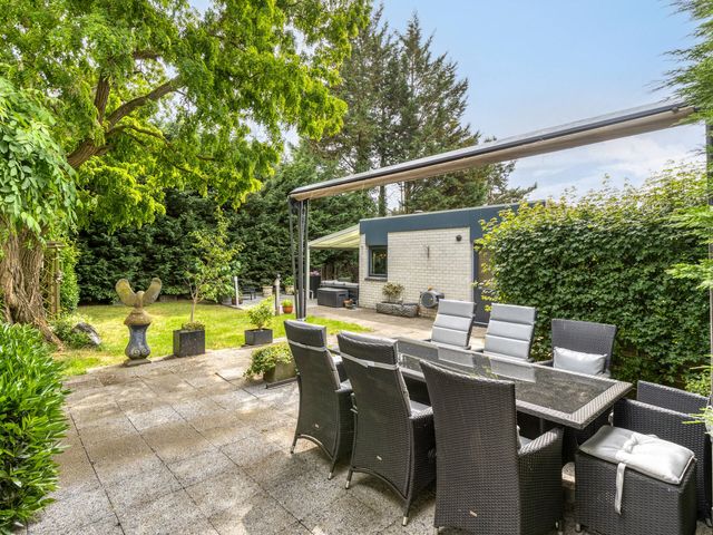 Rondom de woning ligt een fraai aangelegde, groene tuin die bereikbaar is via de woonkamer, bijkeuken en oprit. U vindt er meerdere terrassen, een overkapping en volop privacy. Achterin de tuin staat een tuinhuis met elektriciteit, geschikt als werkplek, atelier of lichte opslagruimte.
