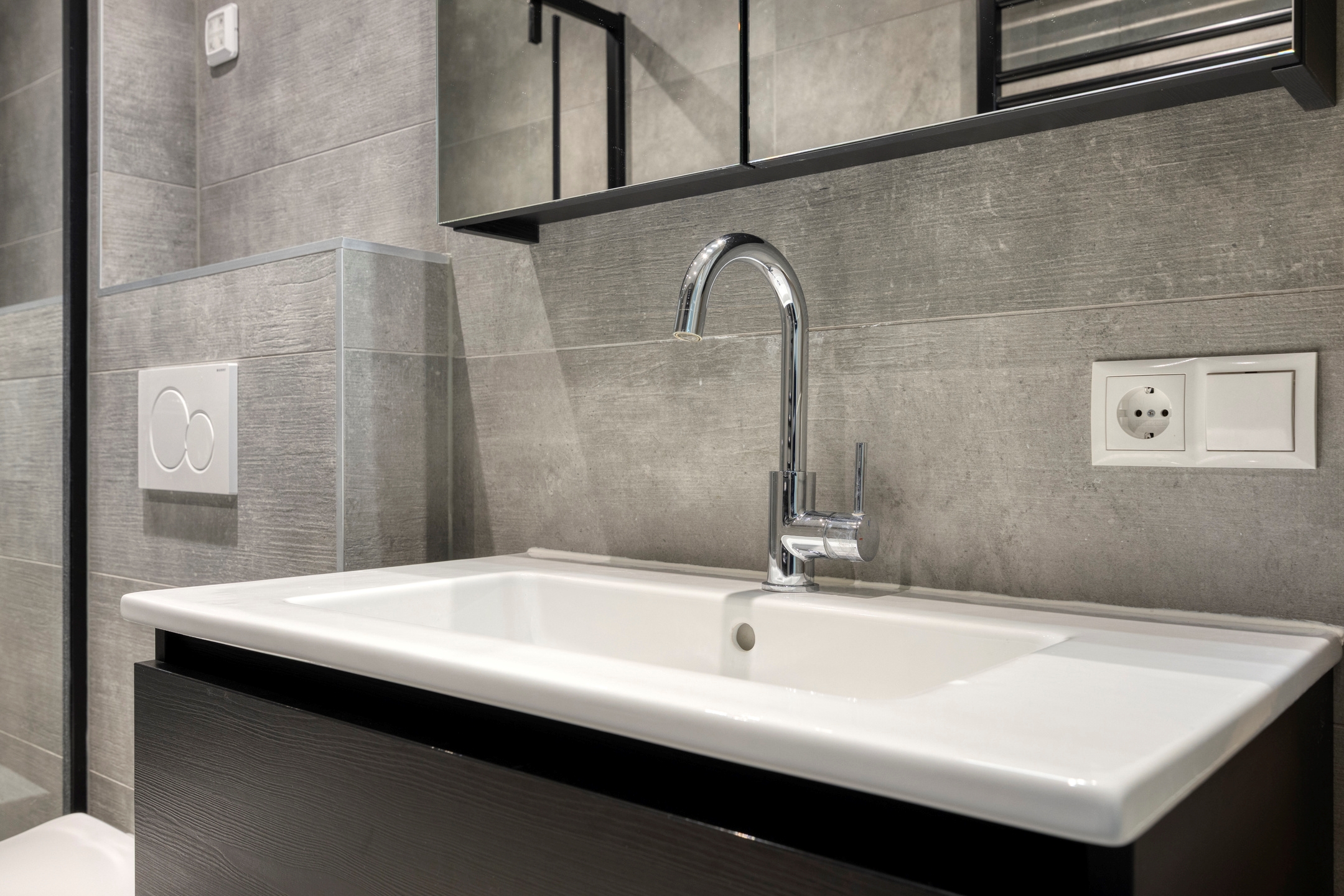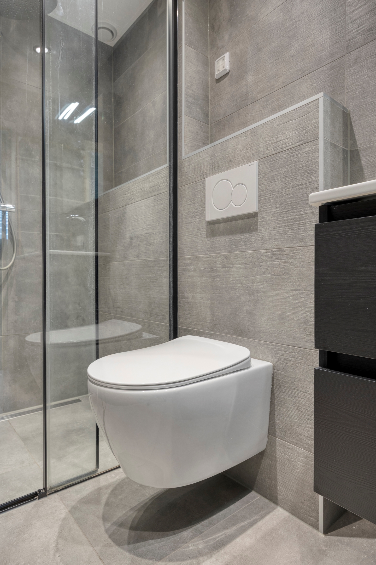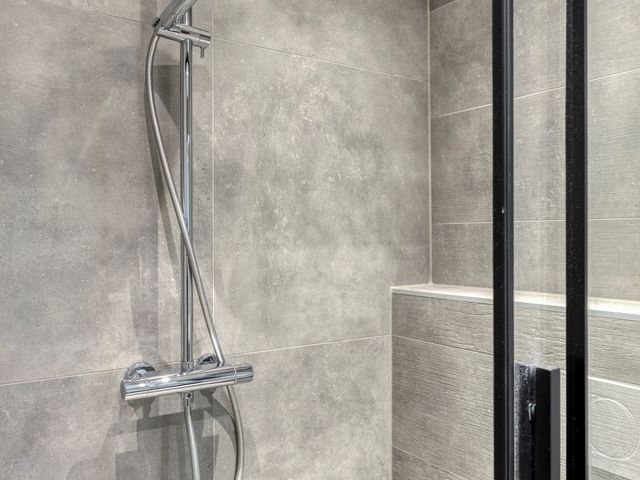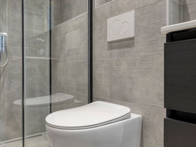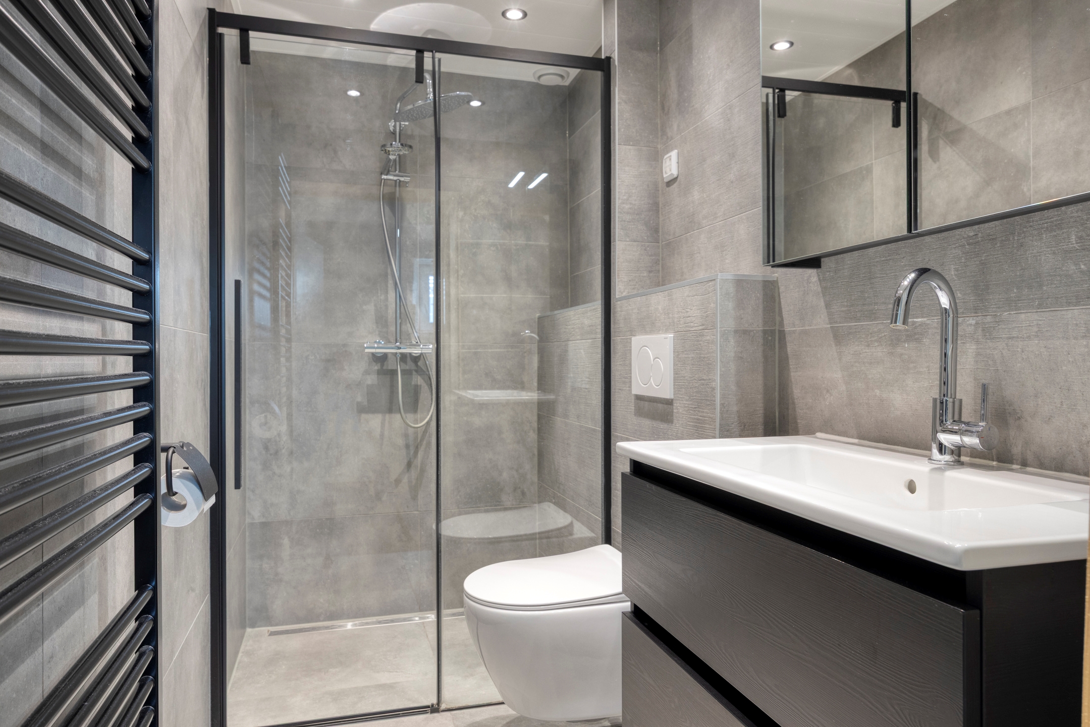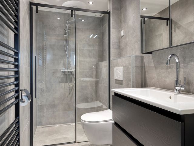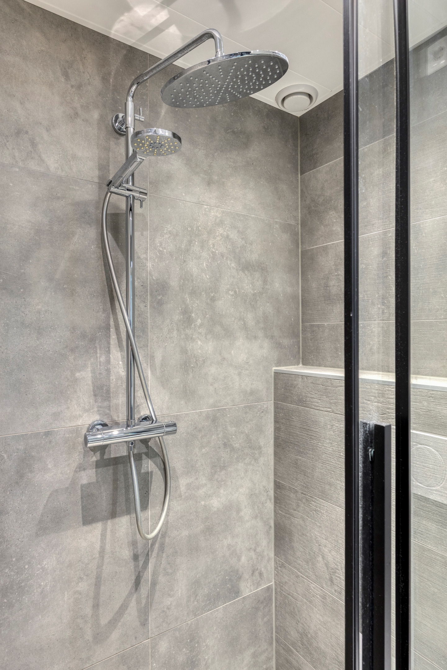 De moderne badkamer (2023) met inbouwspotjes, mechanische ventilatie en een designradiator, is voorzien van een handige inloopdouche met een fraai uitschuifbaar glazen scherm, een vrijhangend toilet en een wastafelmeubel.