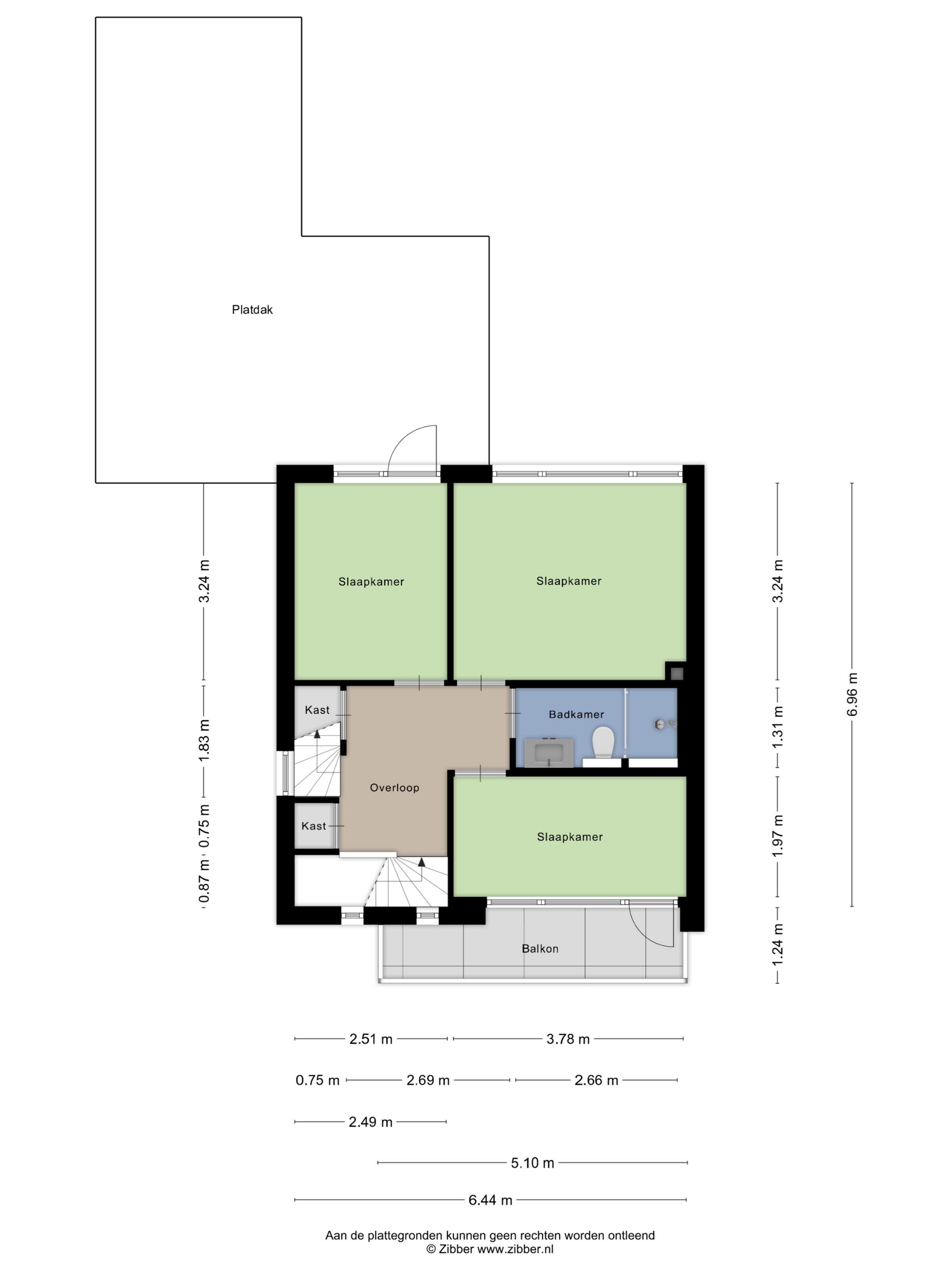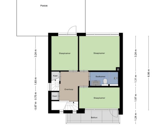 Slaapkamer 1 en 2 liggen aan de achterzijde. Slaapkamer 3 ligt aan de voorzijde. Slaapkamer 1 heeft een loopdeur naar het platte dak en slaapkamer 3 heeft een loopdeur naar het balkon, ca. 1.16x5.08 m aan de voorzijde.