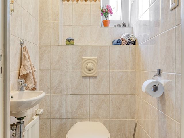Aansluitend komt u in een klein portaal met een hoekfonteintje, toegang tot het toilet en de multifunctionele ruimte. De multifunctionele ruimte is met spouwmuren gebouwd, heeft een betonvloer en centrale verwarming. Deze ruimte is perfect voor bijv. kantoor-/praktijk-/hobbyruimte/mantelzorg & minder valide mensen. Middels een loopdeur is de achtertuin te bereiken.