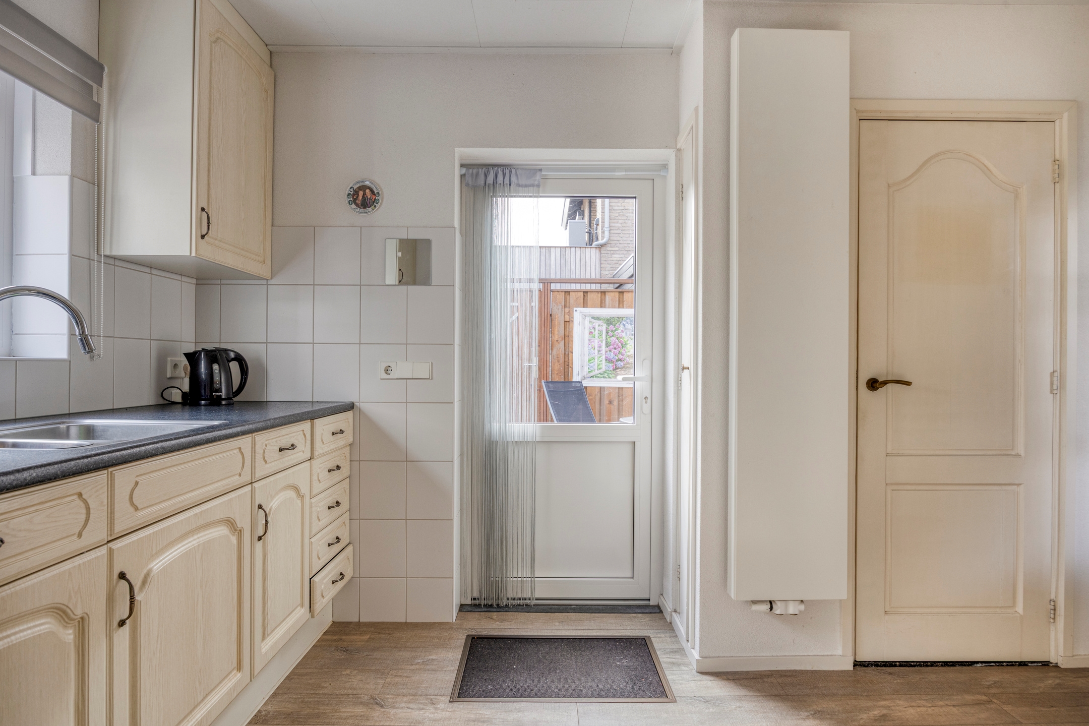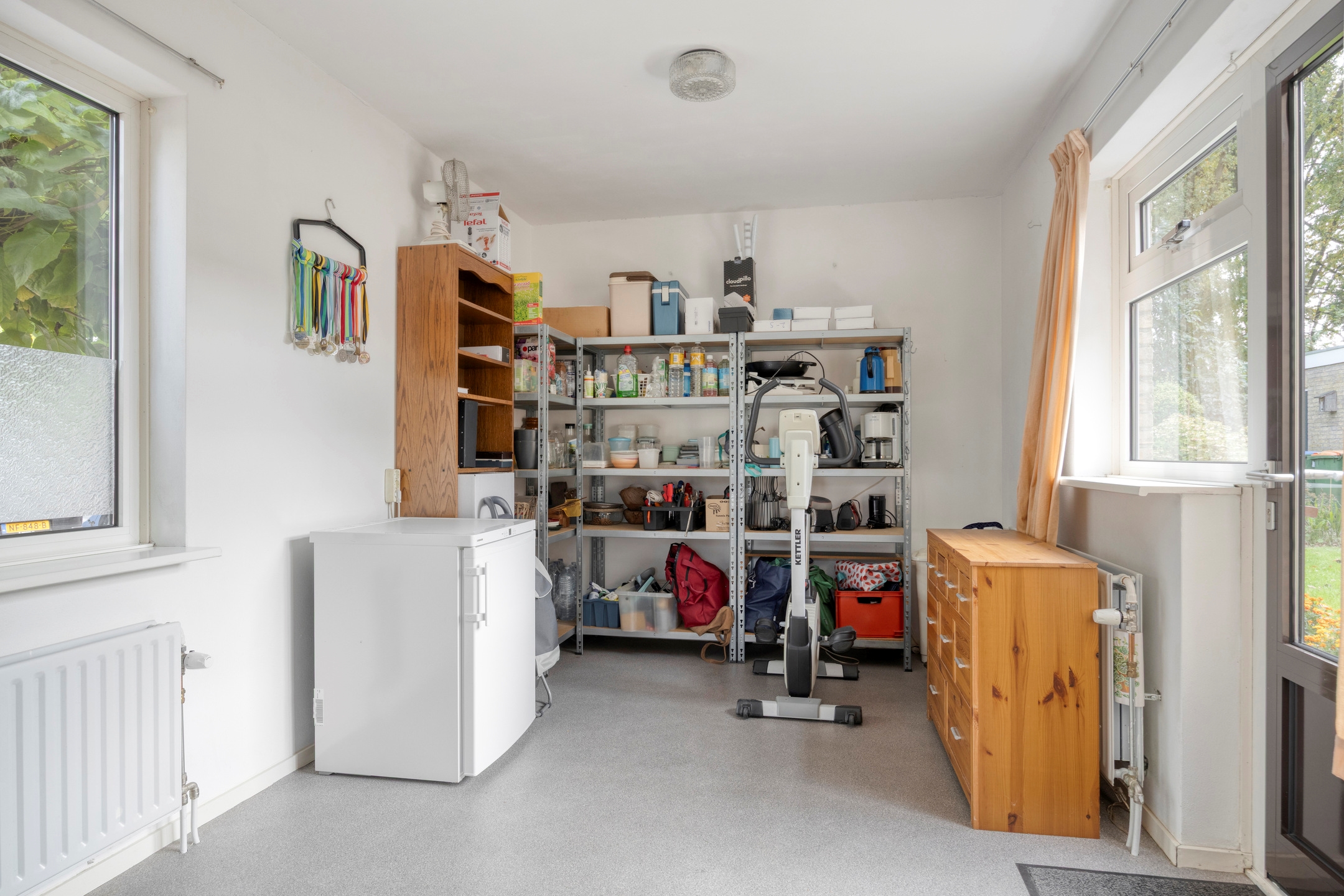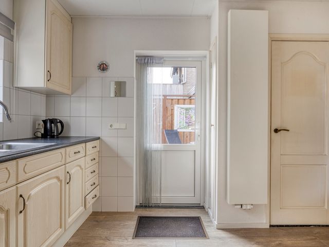 De degelijke inbouwkeuken ligt eveneens aan de achterzijde, heeft een praktische ingebouwde kast, een strakke designradiator, een achtergevelraam, een verbindingsdeur naar de bijkeuken en een loopdeur naar de vrije/royale achtertuin.
