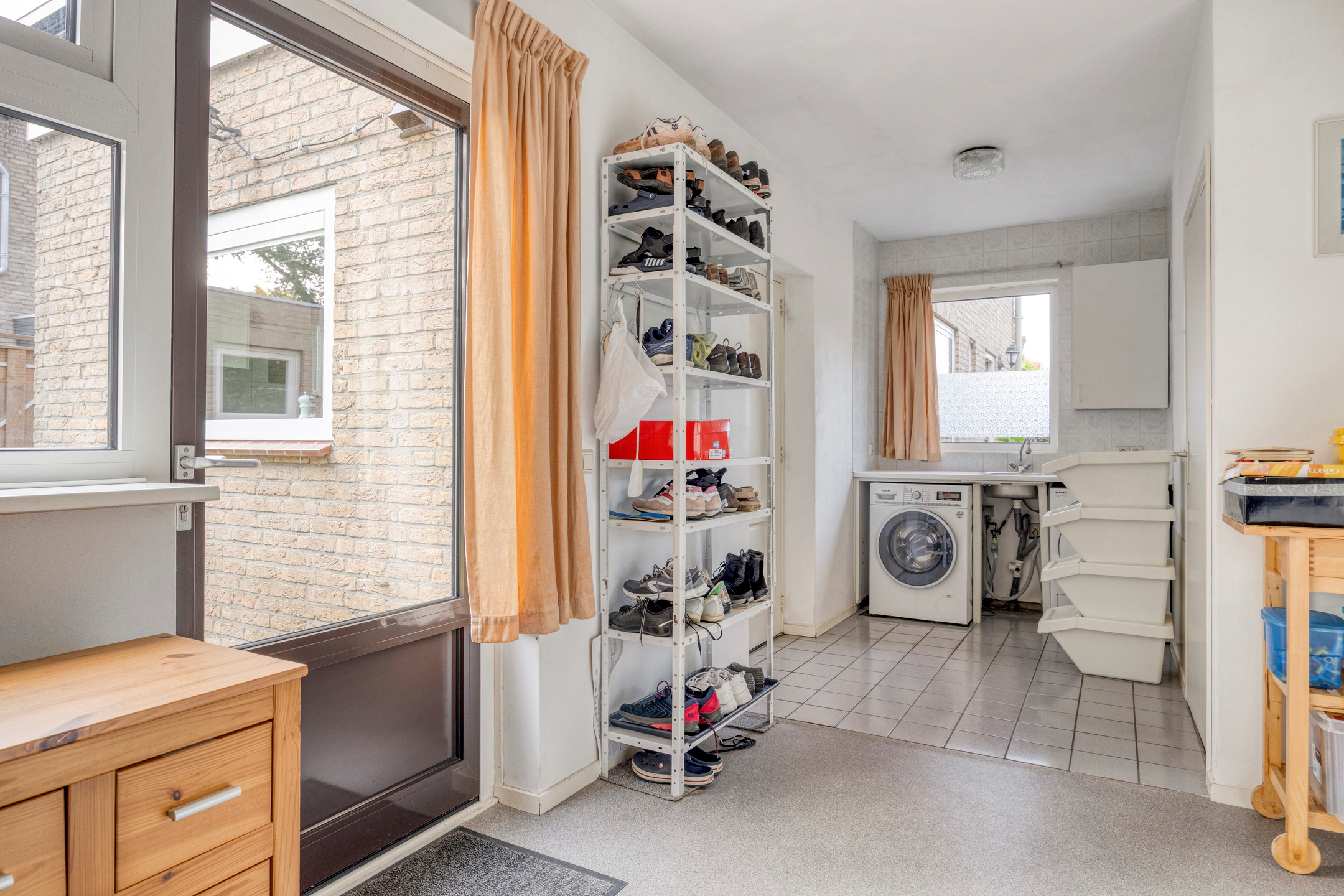 Een L-vormige entree/hal met een moderne meterkast. Vanuit de hal zijn de kelder, het vrijhangend toilet met fonteintje en de L-vormige woonkamer toegankelijk. De sfeervolle woonkamer heeft goed geplaatste raampartijen, een betonvloer met een duurzame PVC vloer, een verbindingsdeur naar de dichte keuken en een loopdeur naar de achtertuin.