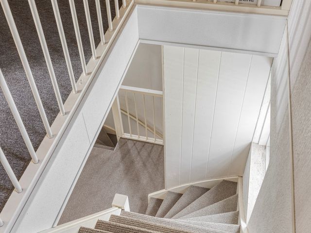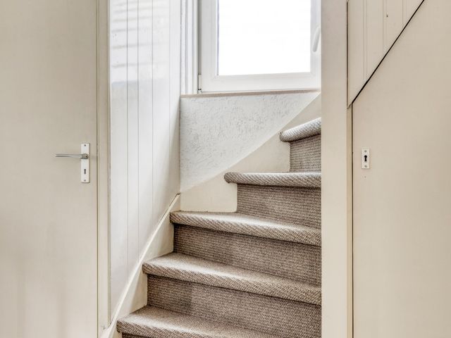 Aan de ruime overloop met een trapopgang naar de 2e verdieping, een ingebouwde kast, een handige trap-/bergkast grenzen de 3 slaapkamers en de eigentijdse badkamer.