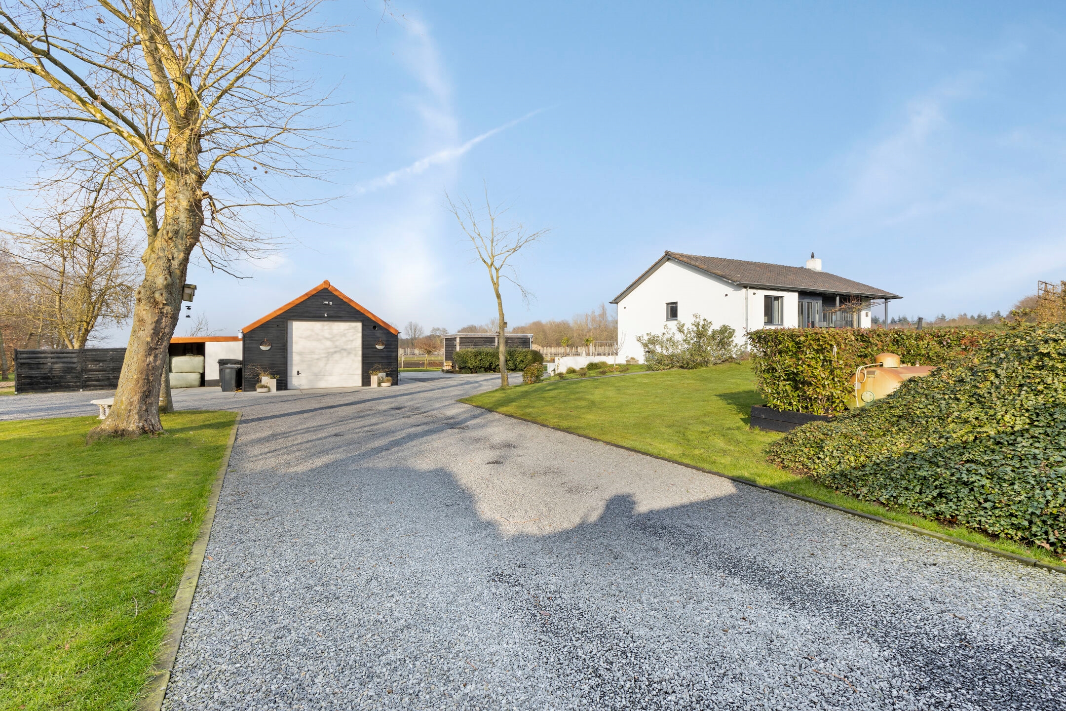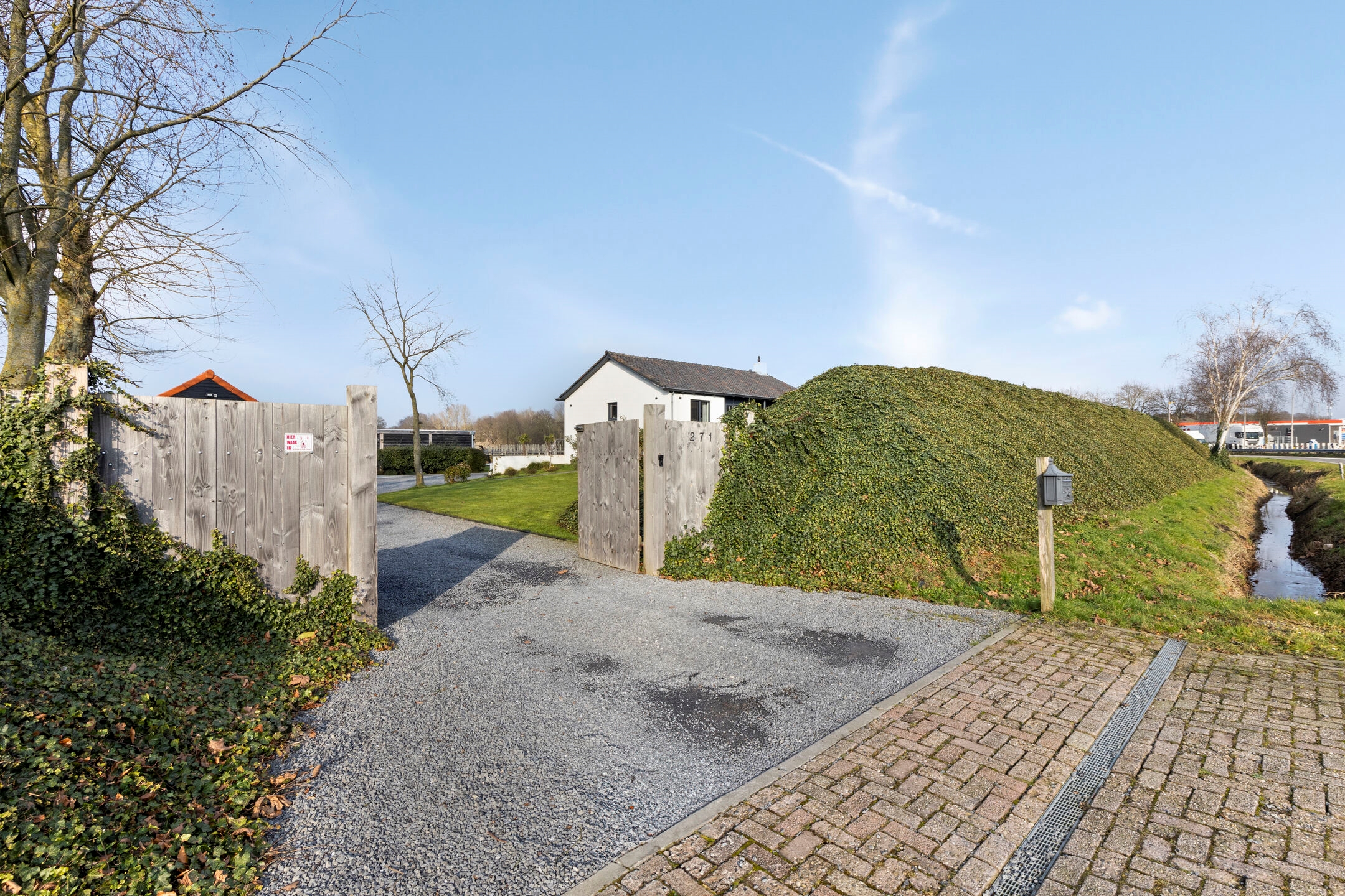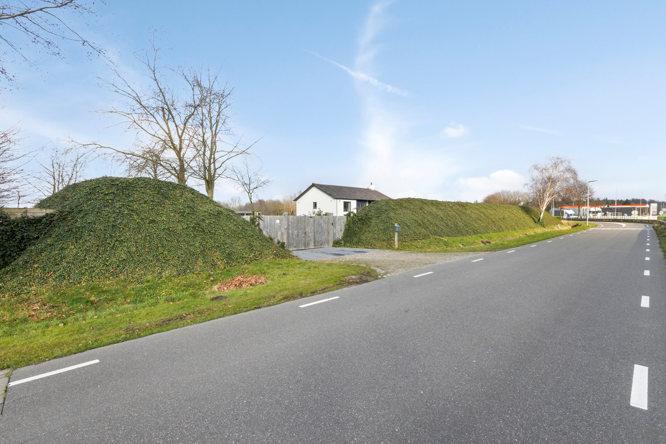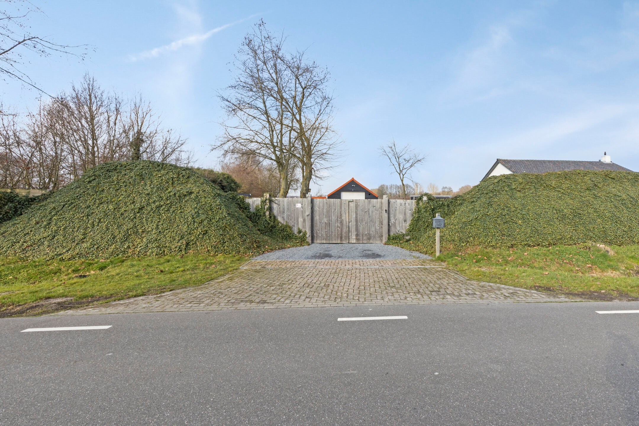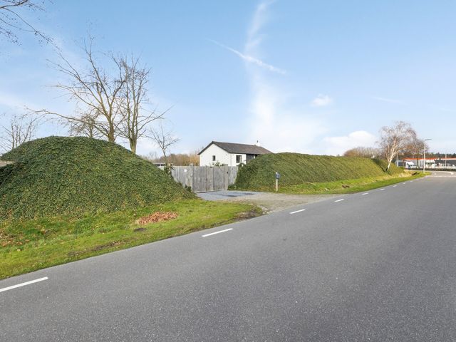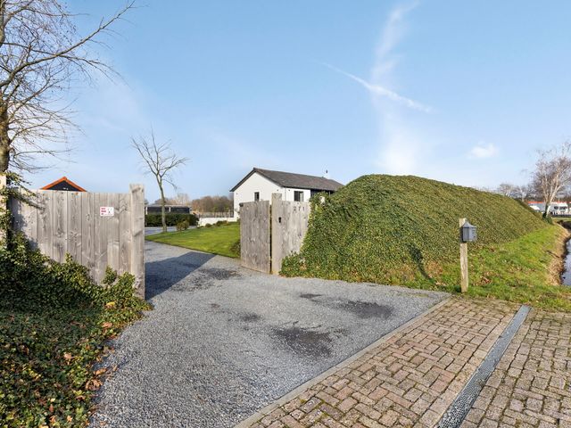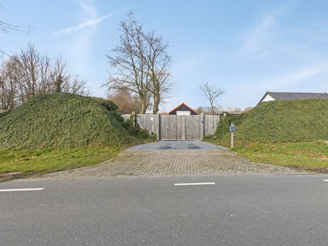 De robuuste houten toegangspoort biedt privacy en exclusiviteit. Via het fraai aangelegde grindpad, omringd door groen, rijdt u comfortabel naar de woning, waar rust en ruimte direct voelbaar zijn. De grote heuvels langs de weg fungeren als een effectieve geluidswal, afgewerkt met worteldoek en beplanting, wat zorgt voor extra privacy en een natuurlijke uitstraling.