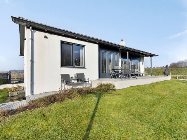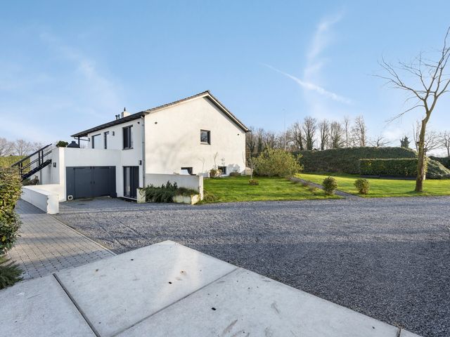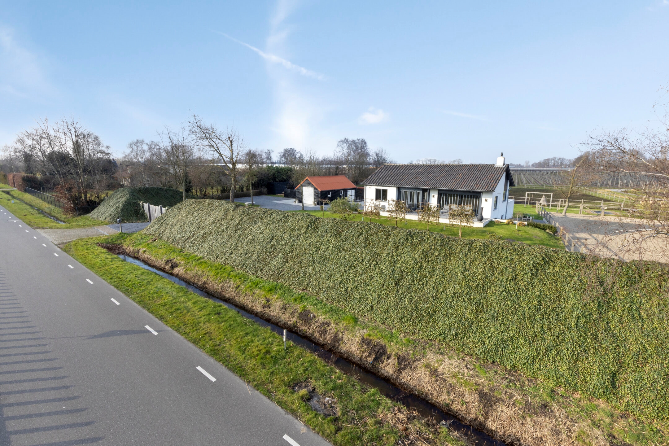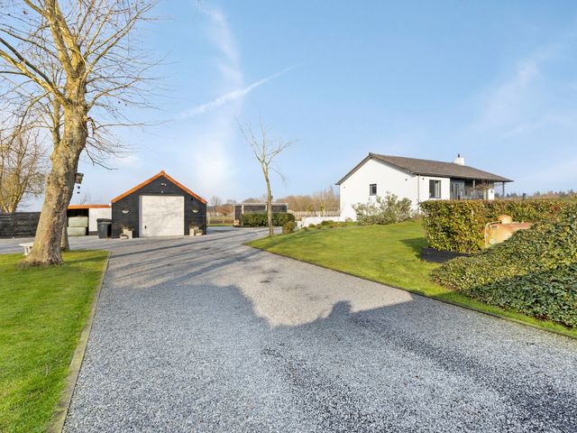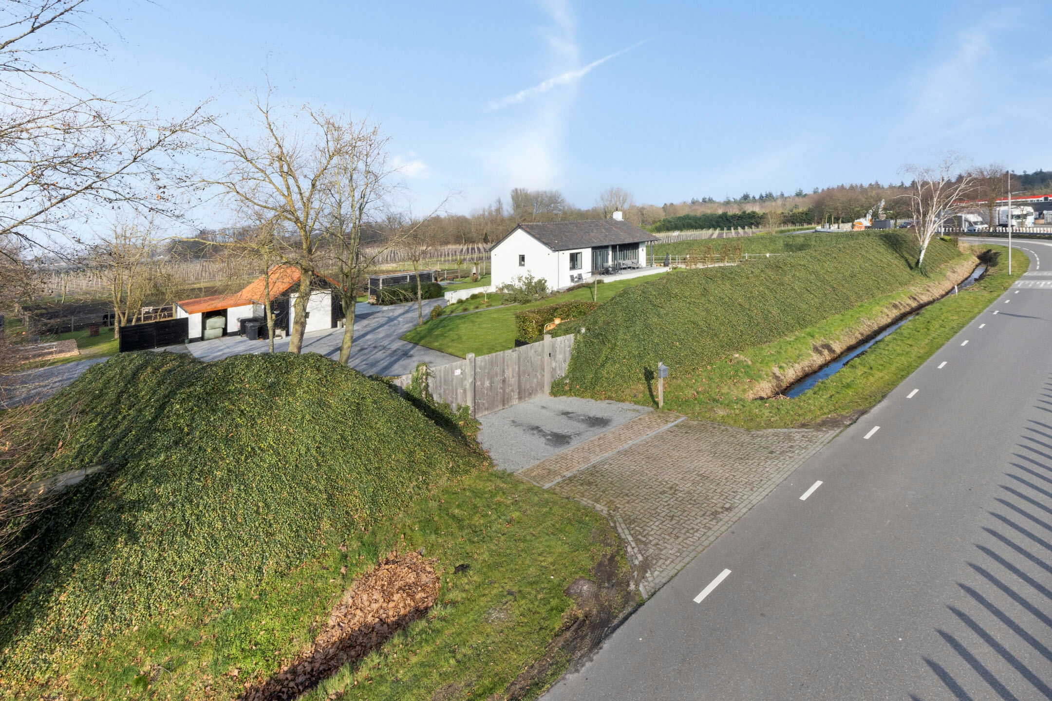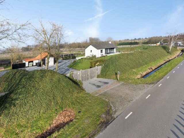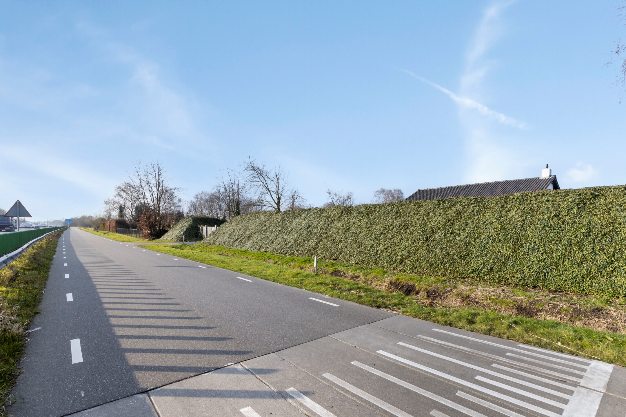 De robuuste houten toegangspoort biedt privacy en exclusiviteit. Via het fraai aangelegde grindpad, omringd door groen, rijdt u comfortabel naar de woning, waar rust en ruimte direct voelbaar zijn. De grote heuvels langs de weg fungeren als een effectieve geluidswal, afgewerkt met worteldoek en beplanting, wat zorgt voor extra privacy en een natuurlijke uitstraling.