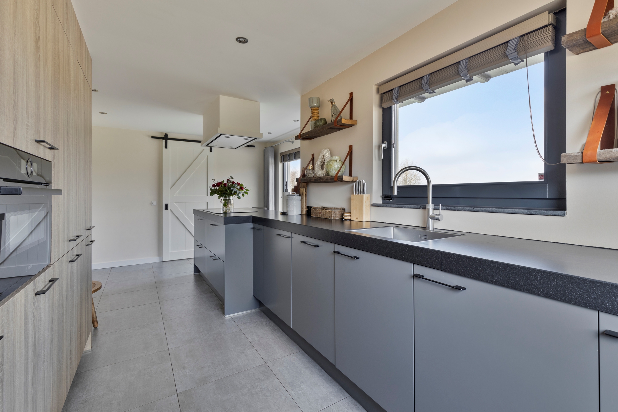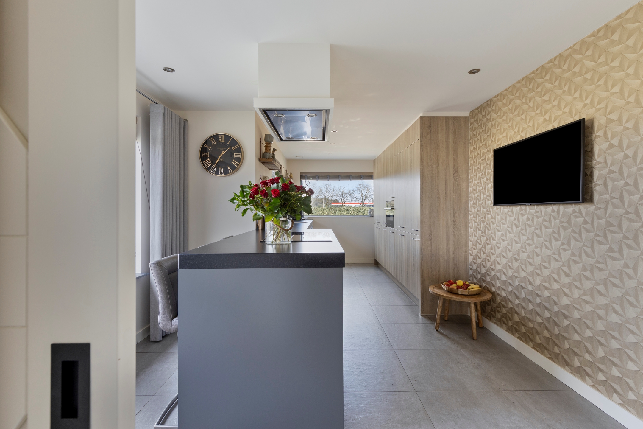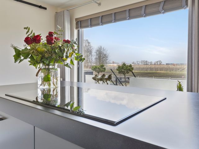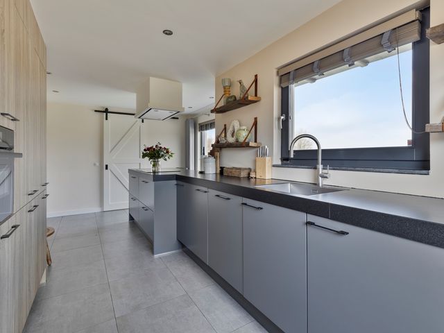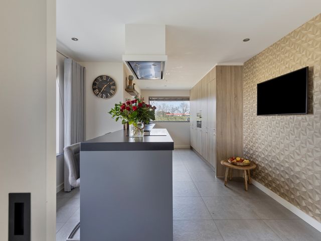 Via een elegante schuifdeur, die naadloos aansluit op het design van de woning, betreedt u de woonkeuken. De keuken is luxe uitgevoerd, met perfect geïntegreerde onderkasten, een stijlvolle kastenwand en een modern kookeiland dat uitnodigt tot culinaire creaties met zicht op de paardenweide. De keuken is uitgerust met een inductiekookplaat, een combi-oven, een RVS afzuigkap, een koelkast, vriezer, vaatwasser en een Quooker-kraan. De wanden zijn strak gestuct en deels verfraaid met behang. Subtiel geïntegreerde inbouwspots in het plafond zorgen voor een warme, sfeervolle verlichting.