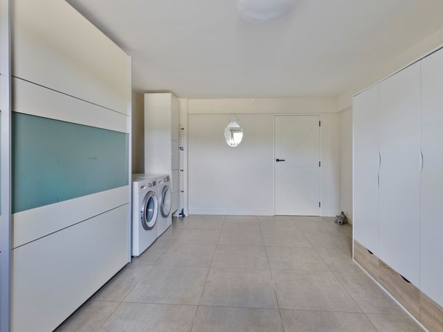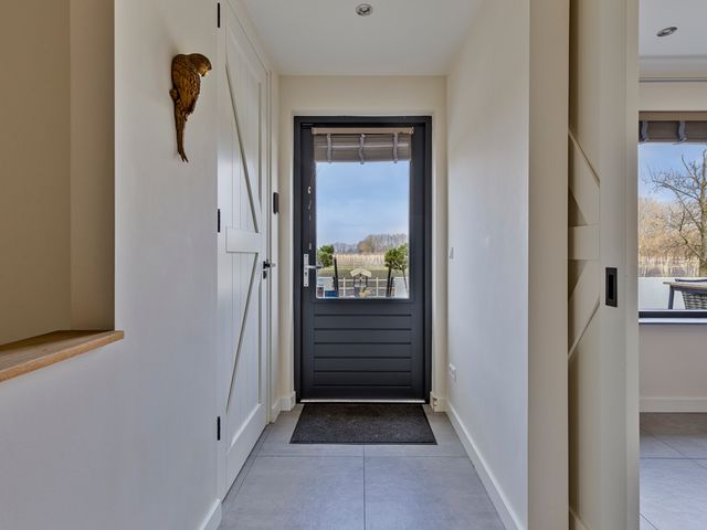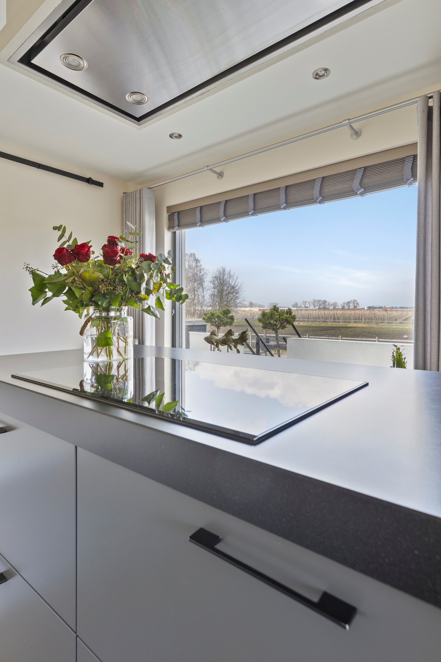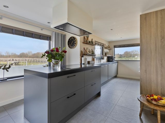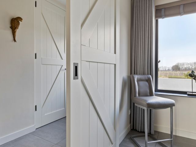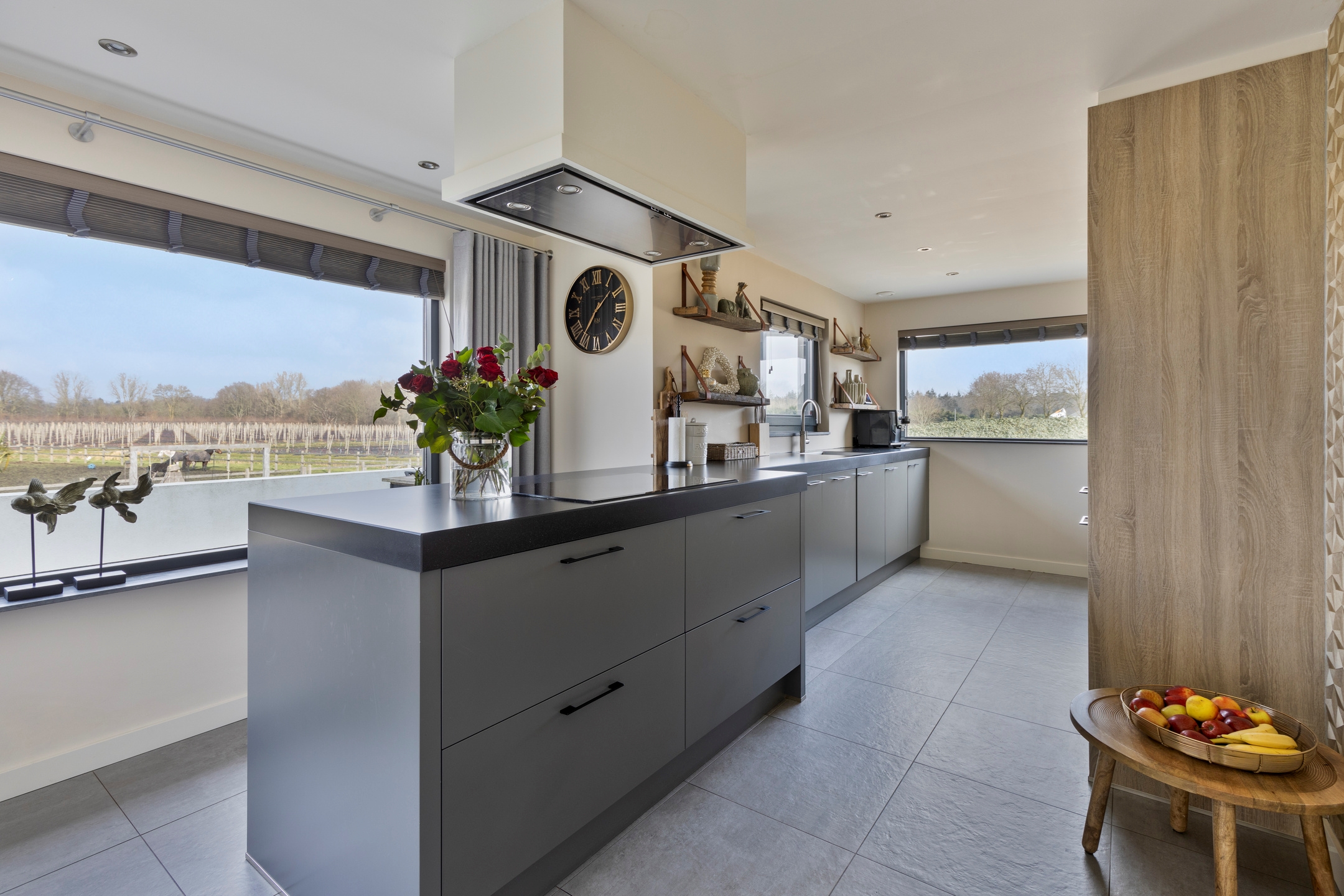 Via een elegante schuifdeur, die naadloos aansluit op het design van de woning, betreedt u de woonkeuken. De keuken is luxe uitgevoerd, met perfect geïntegreerde onderkasten, een stijlvolle kastenwand en een modern kookeiland dat uitnodigt tot culinaire creaties met zicht op de paardenweide. De keuken is uitgerust met een inductiekookplaat, een combi-oven, een RVS afzuigkap, een koelkast, vriezer, vaatwasser en een Quooker-kraan. De wanden zijn strak gestuct en deels verfraaid met behang. Subtiel geïntegreerde inbouwspots in het plafond zorgen voor een warme, sfeervolle verlichting.