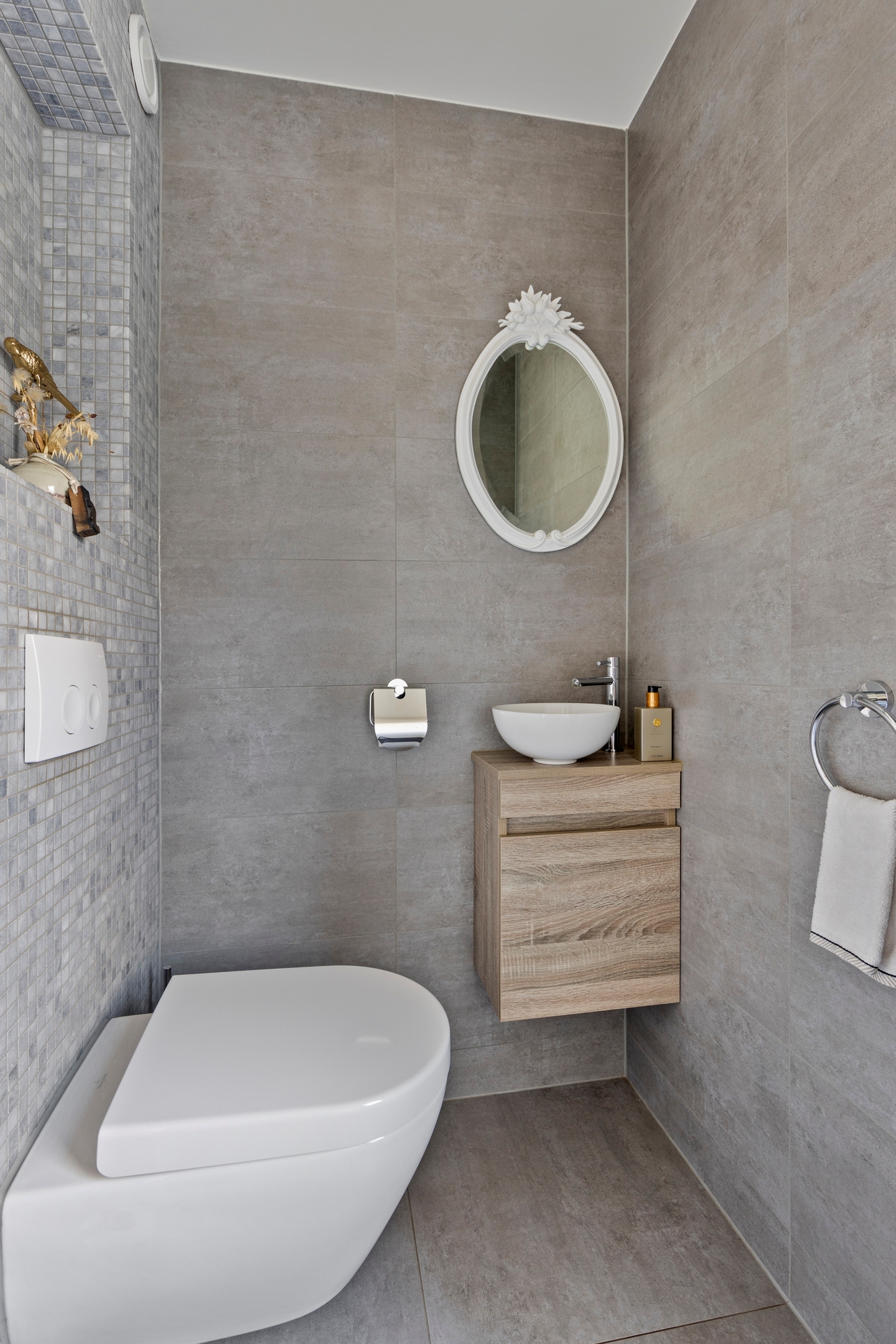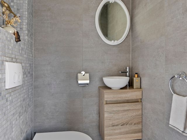 Het toilet is volledig betegeld en voorzien van een hangcloset en een fontein.