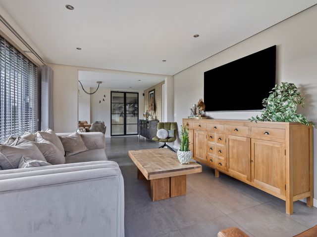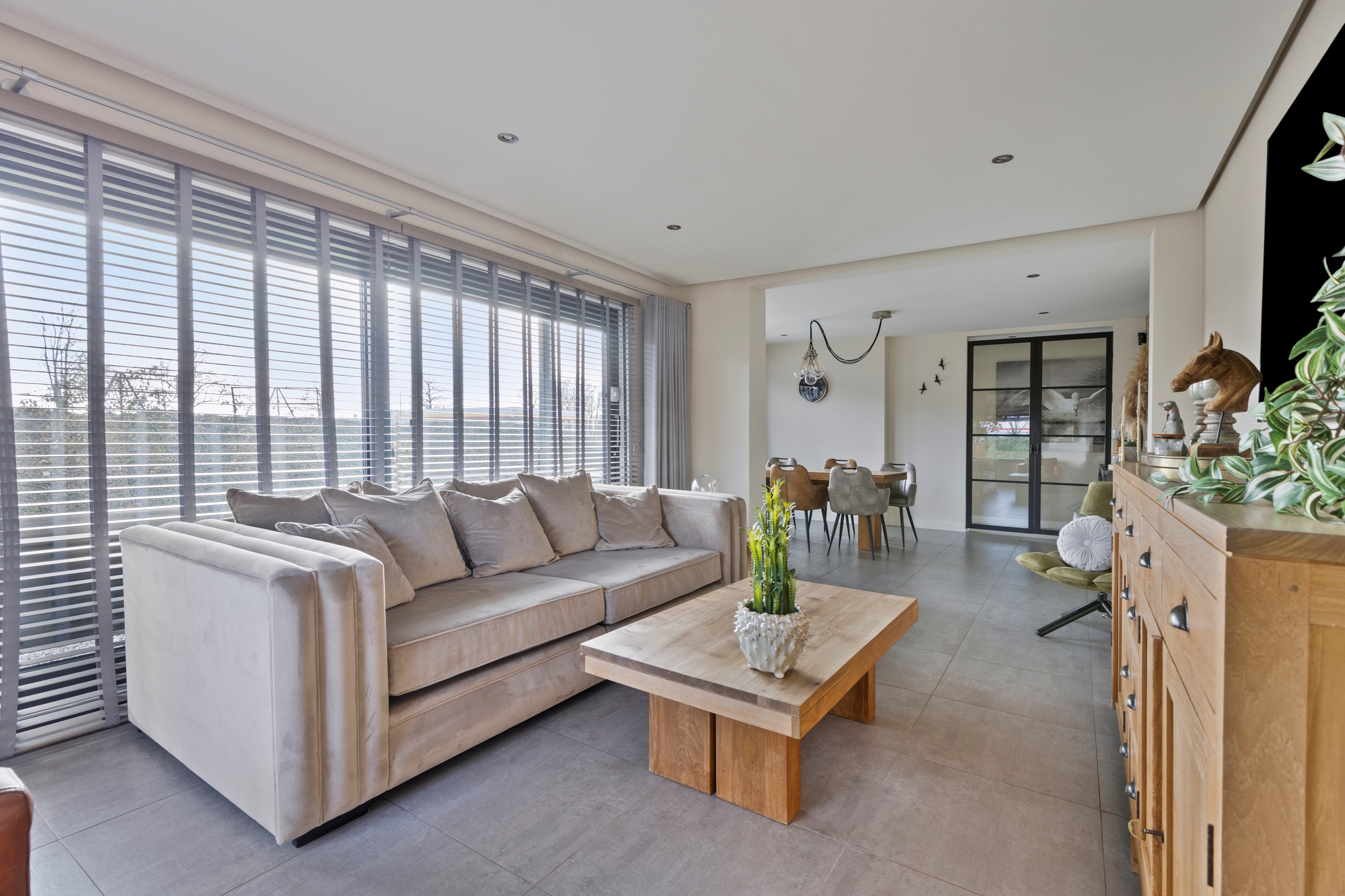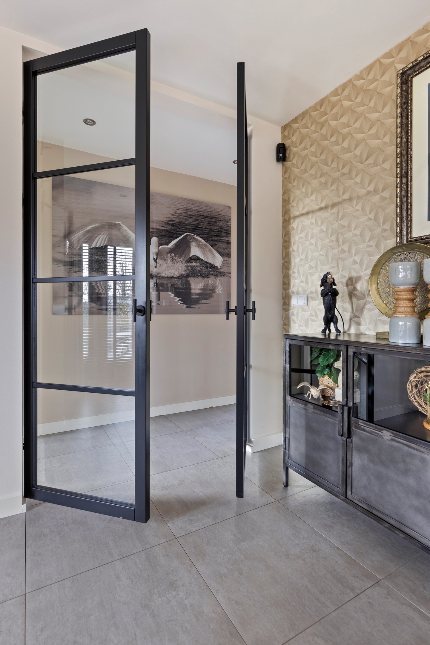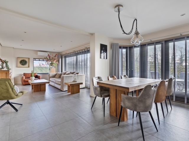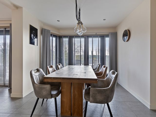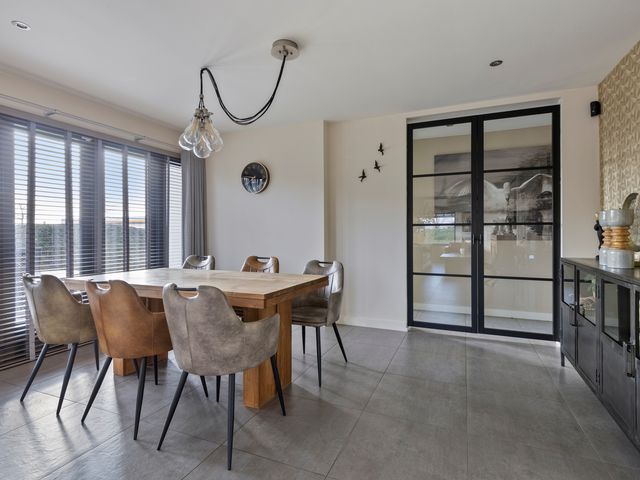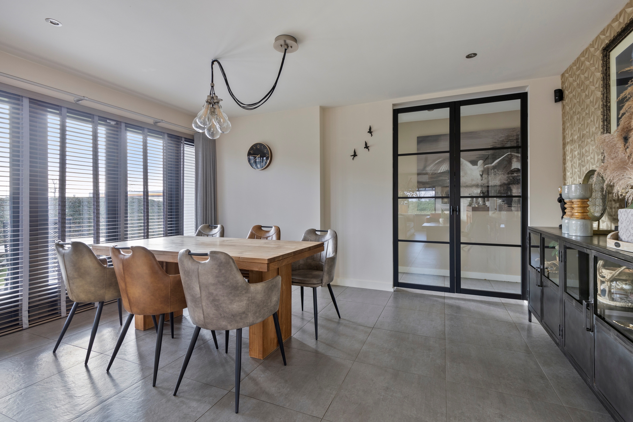 Vanuit de keuken loopt u direct de woonkamer in, een luxe en sfeervolle ruimte met grote raampartijen die zorgen voor een overvloed aan natuurlijk licht en een naadloze verbinding met buiten. De eetkamer sluit hier perfect op aan, waardoor een open en ruimtelijk geheel ontstaat. Industriële deuren met glas geven een moderne touch en zorgen voor een subtiele scheiding tussen de verschillende leefruimtes, zonder in te leveren op licht en ruimte.