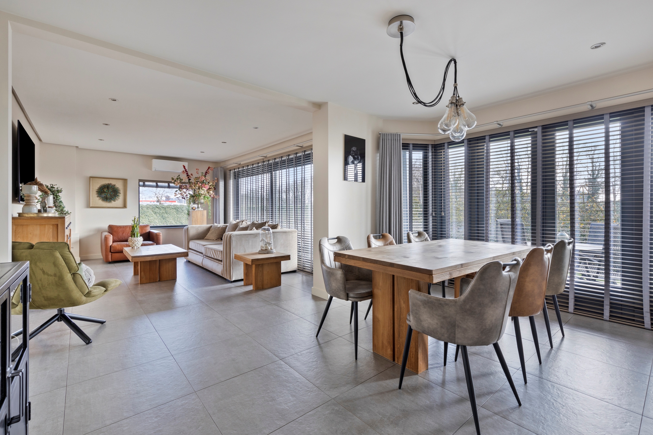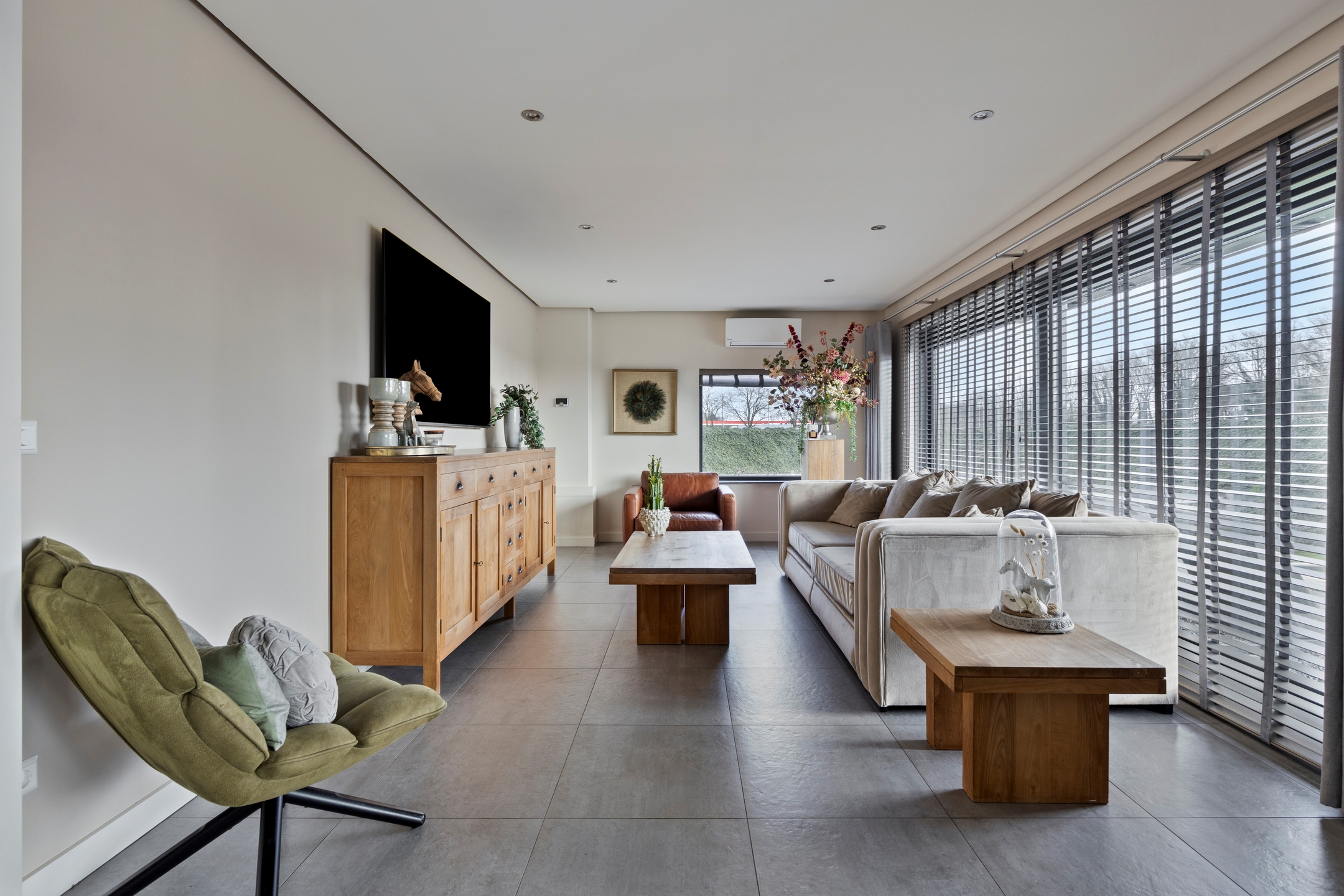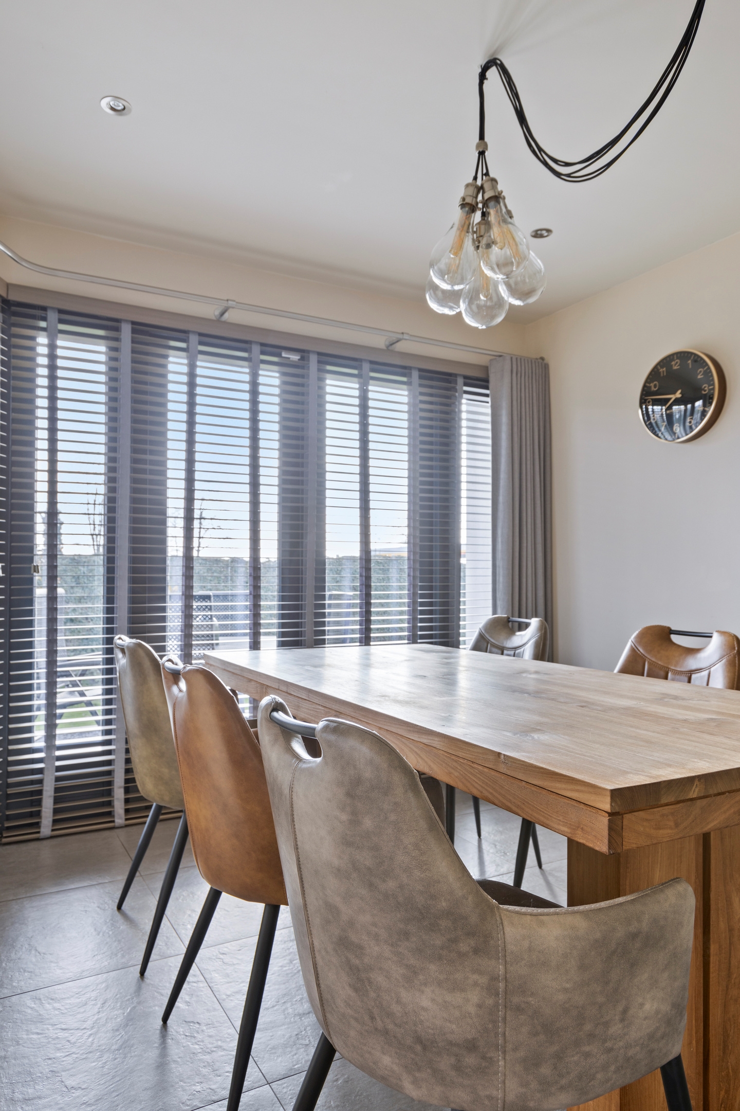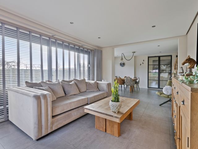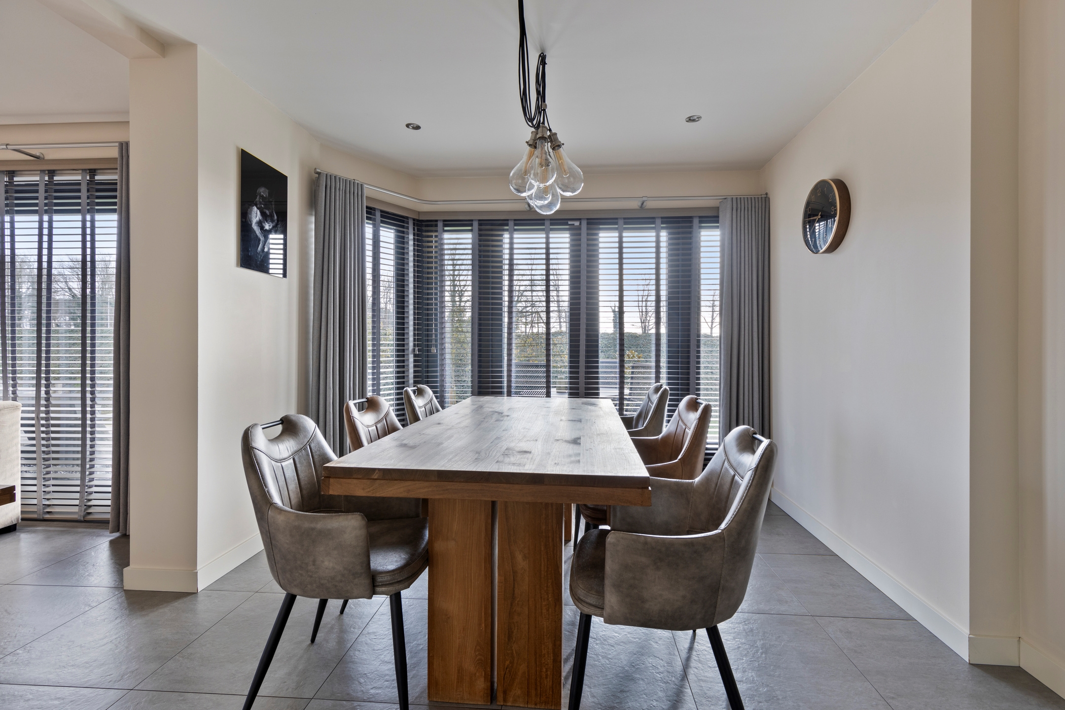 Vanuit de keuken loopt u direct de woonkamer in, een luxe en sfeervolle ruimte met grote raampartijen die zorgen voor een overvloed aan natuurlijk licht en een naadloze verbinding met buiten. De eetkamer sluit hier perfect op aan, waardoor een open en ruimtelijk geheel ontstaat. Industriële deuren met glas geven een moderne touch en zorgen voor een subtiele scheiding tussen de verschillende leefruimtes, zonder in te leveren op licht en ruimte.
