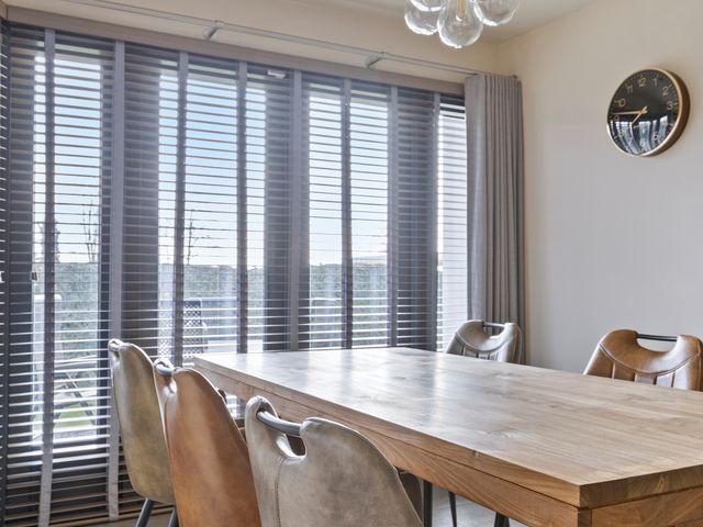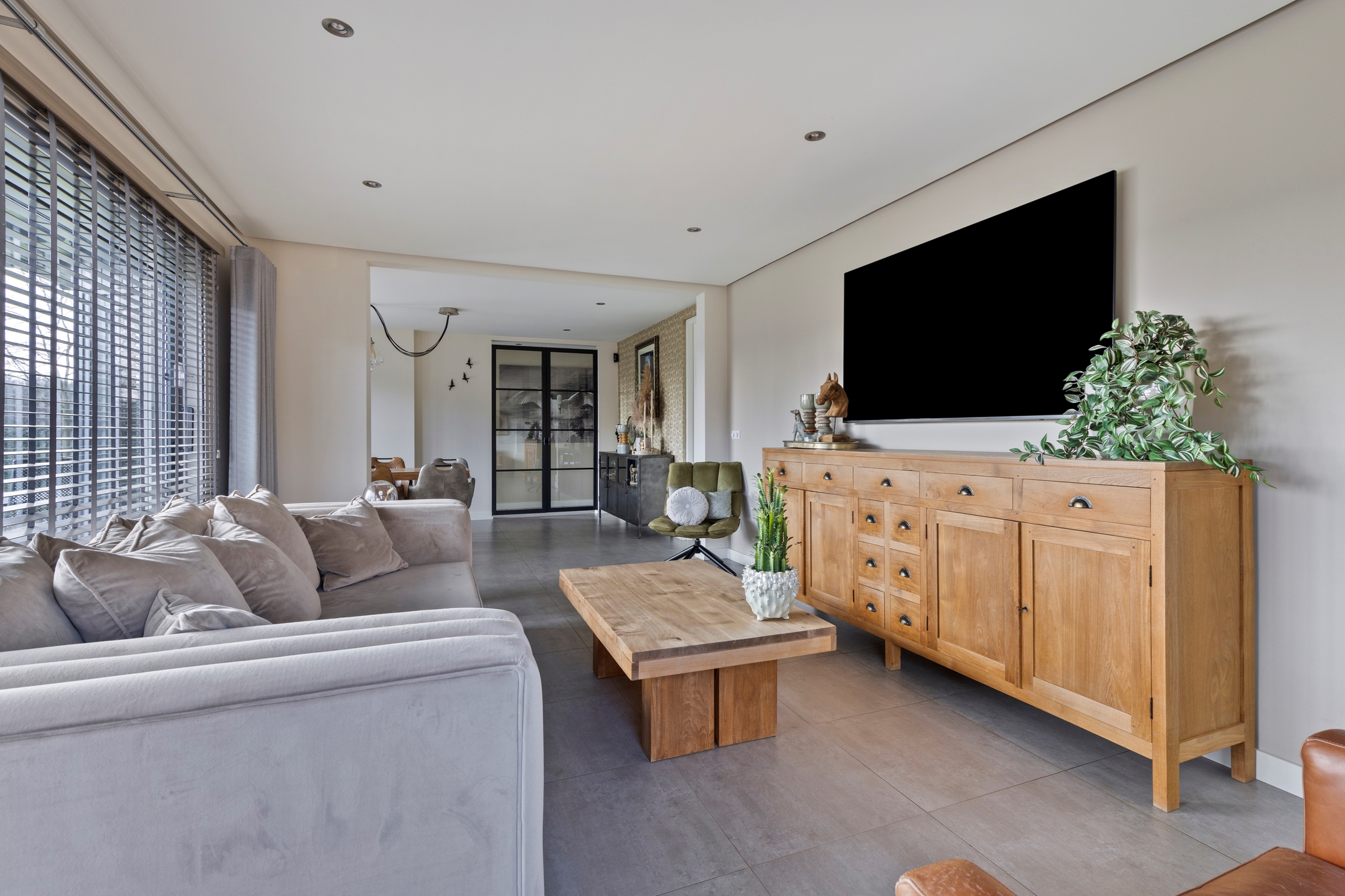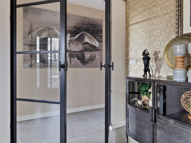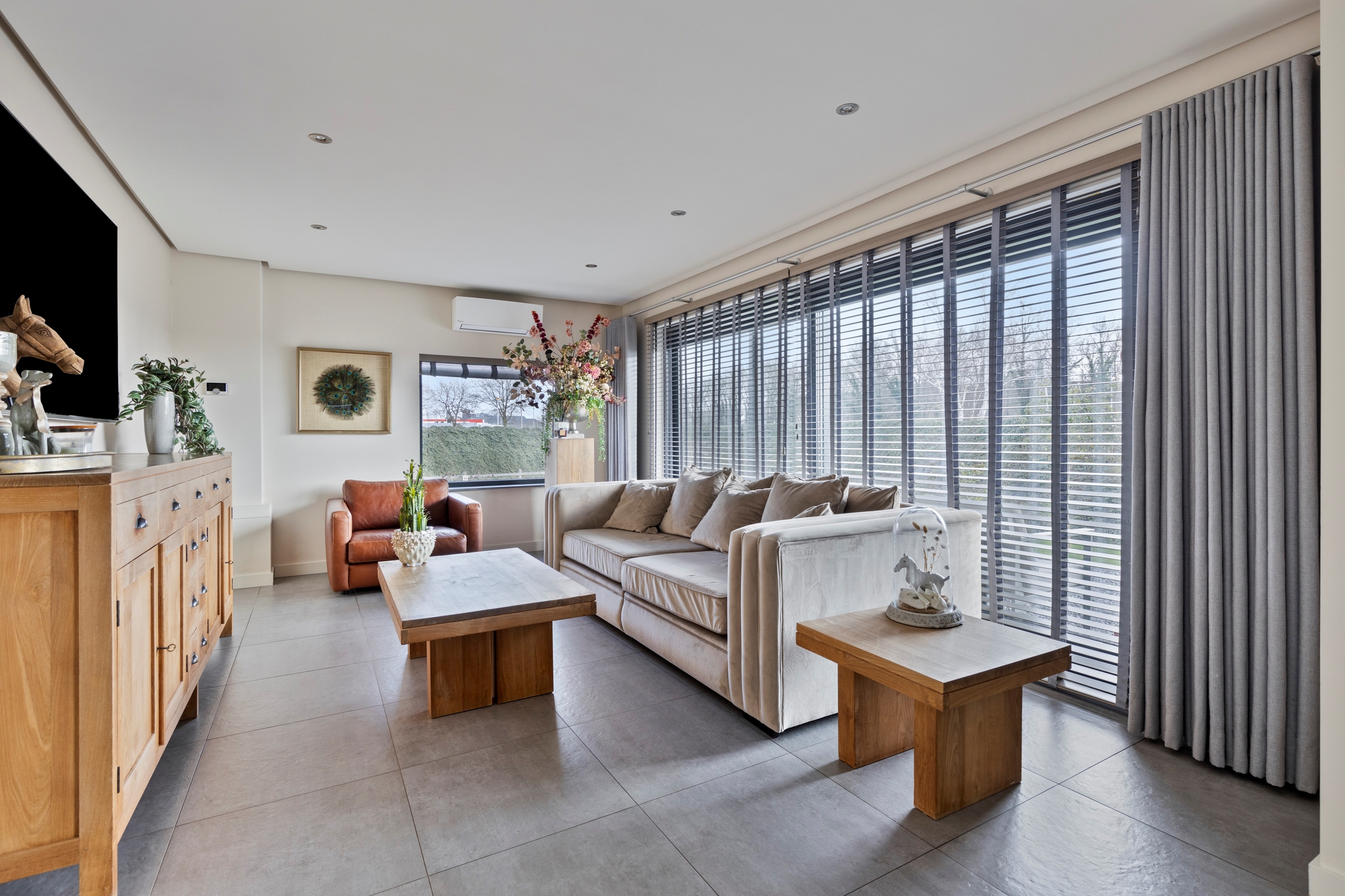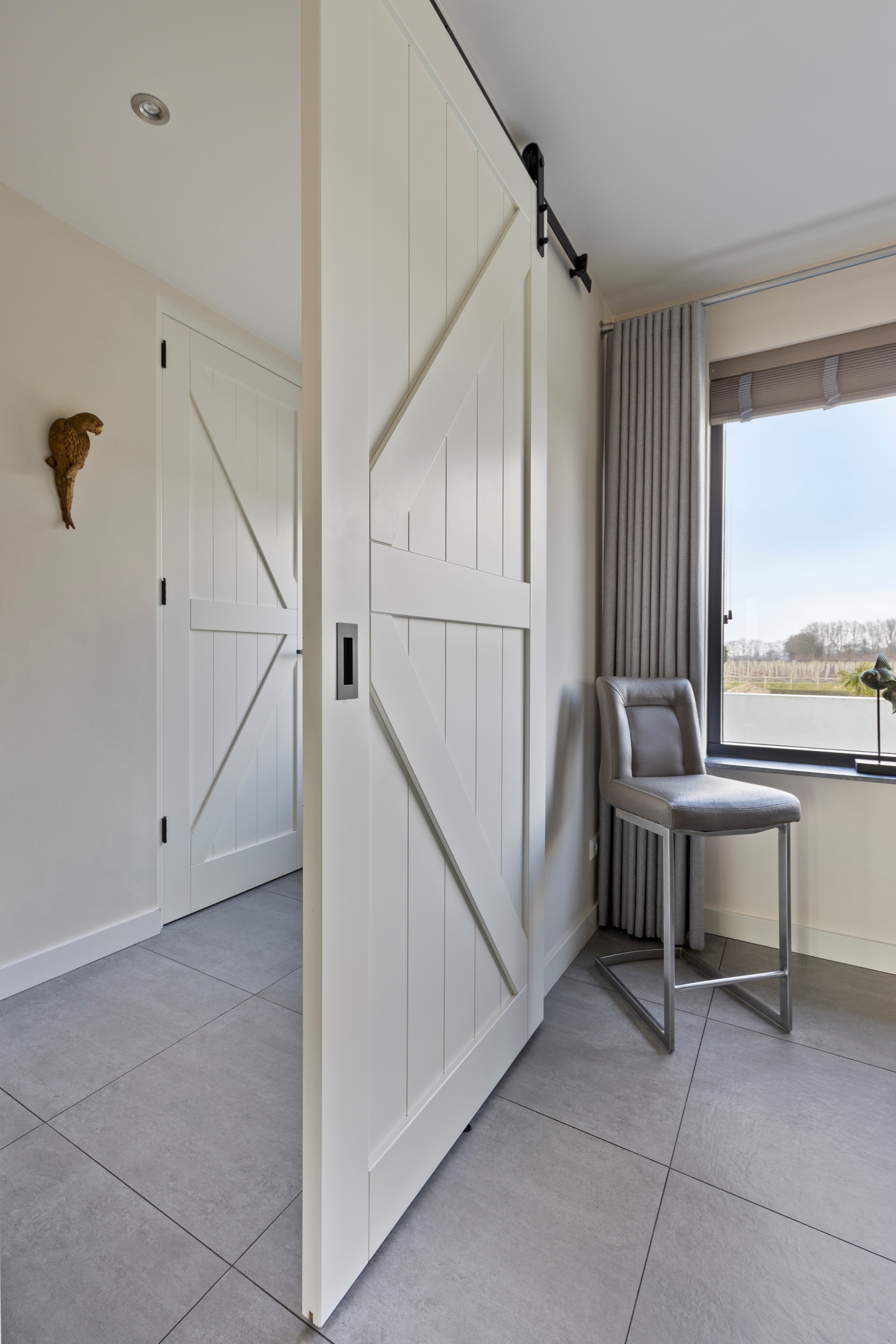 Vanuit de keuken loopt u direct de woonkamer in, een luxe en sfeervolle ruimte met grote raampartijen die zorgen voor een overvloed aan natuurlijk licht en een naadloze verbinding met buiten. De eetkamer sluit hier perfect op aan, waardoor een open en ruimtelijk geheel ontstaat. Industriële deuren met glas geven een moderne touch en zorgen voor een subtiele scheiding tussen de verschillende leefruimtes, zonder in te leveren op licht en ruimte.