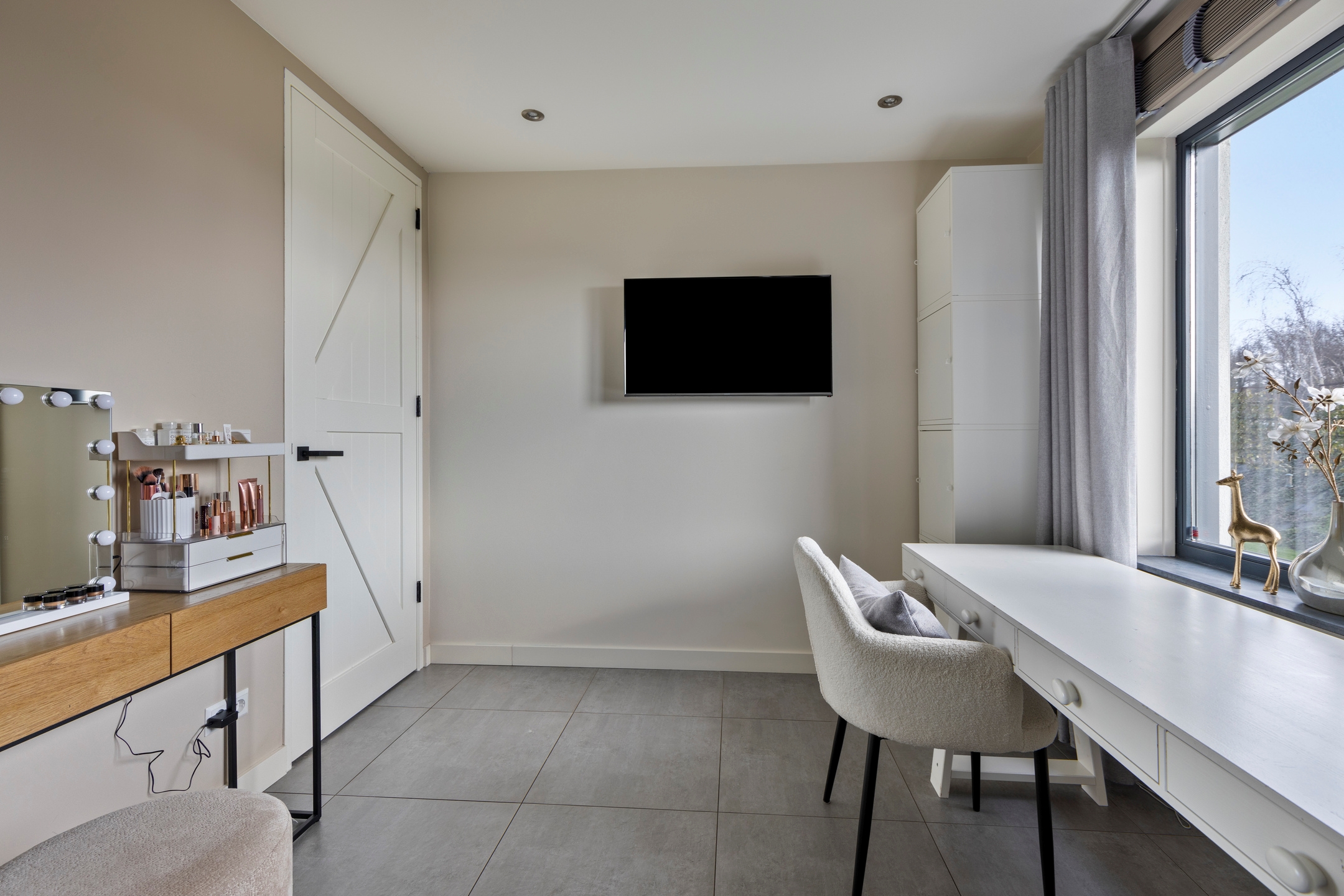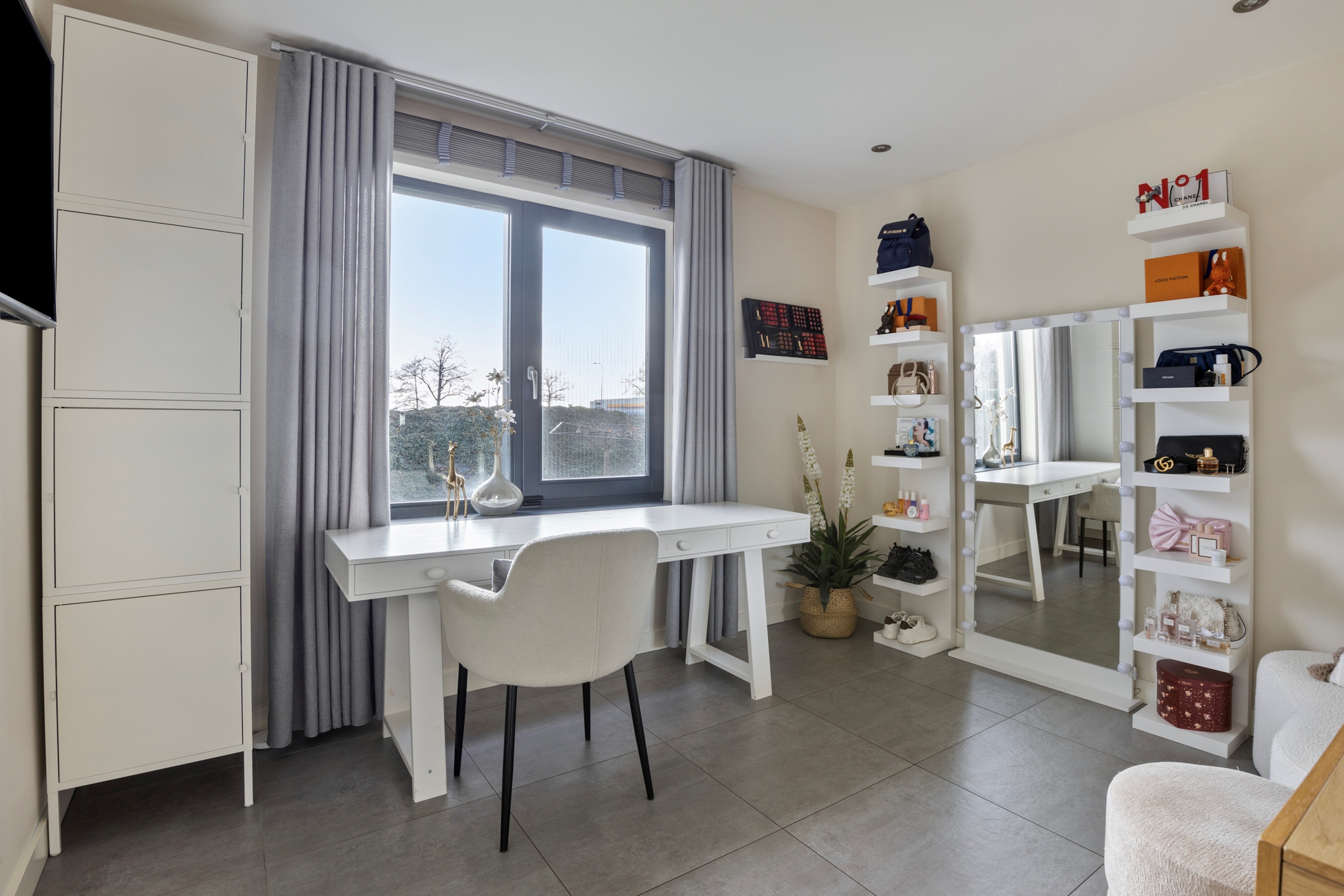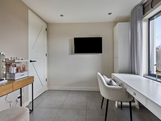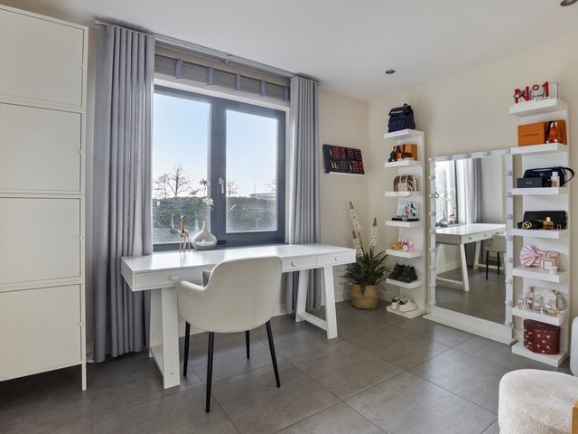 De extra kamer is een veelzijdige ruimte, ideaal als werkkamer, hobbyruimte of extra slaapkamer. Grote ramen zorgen voor veel lichtinval, terwijl de ingebouwde spots een sfeervolle verlichting bieden.