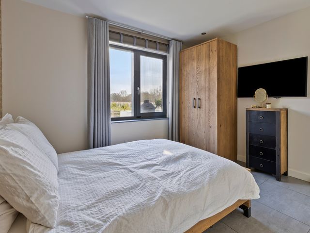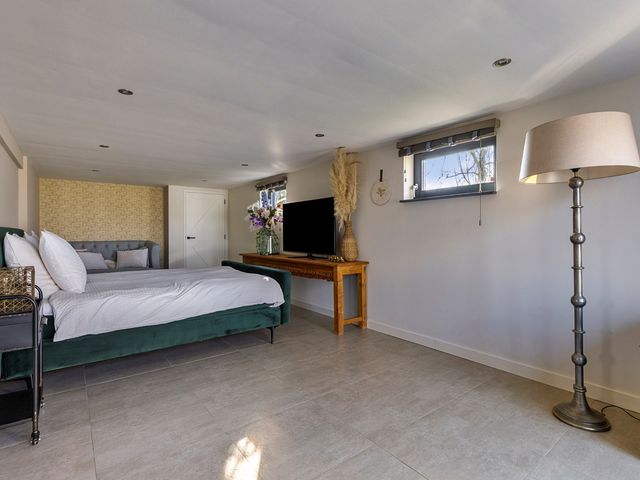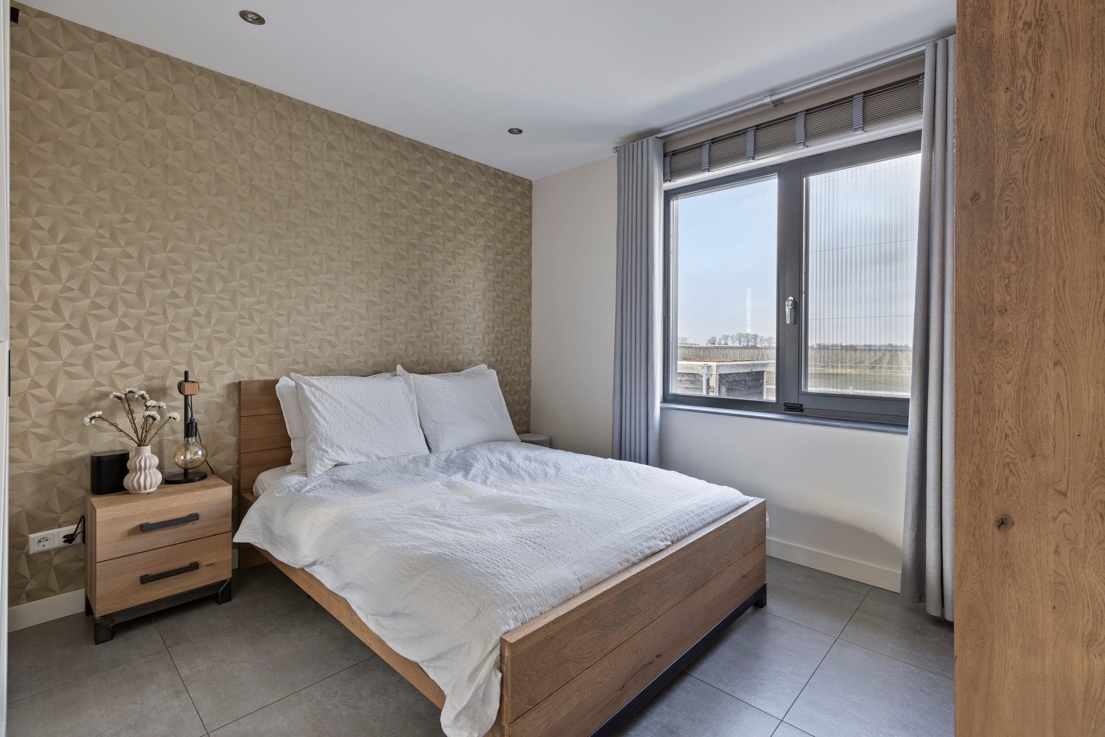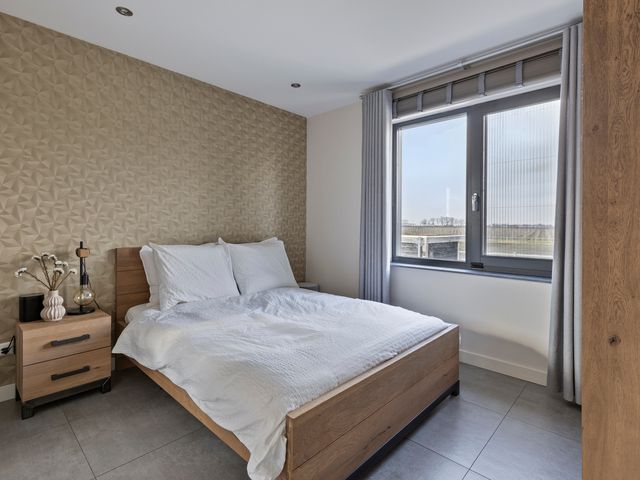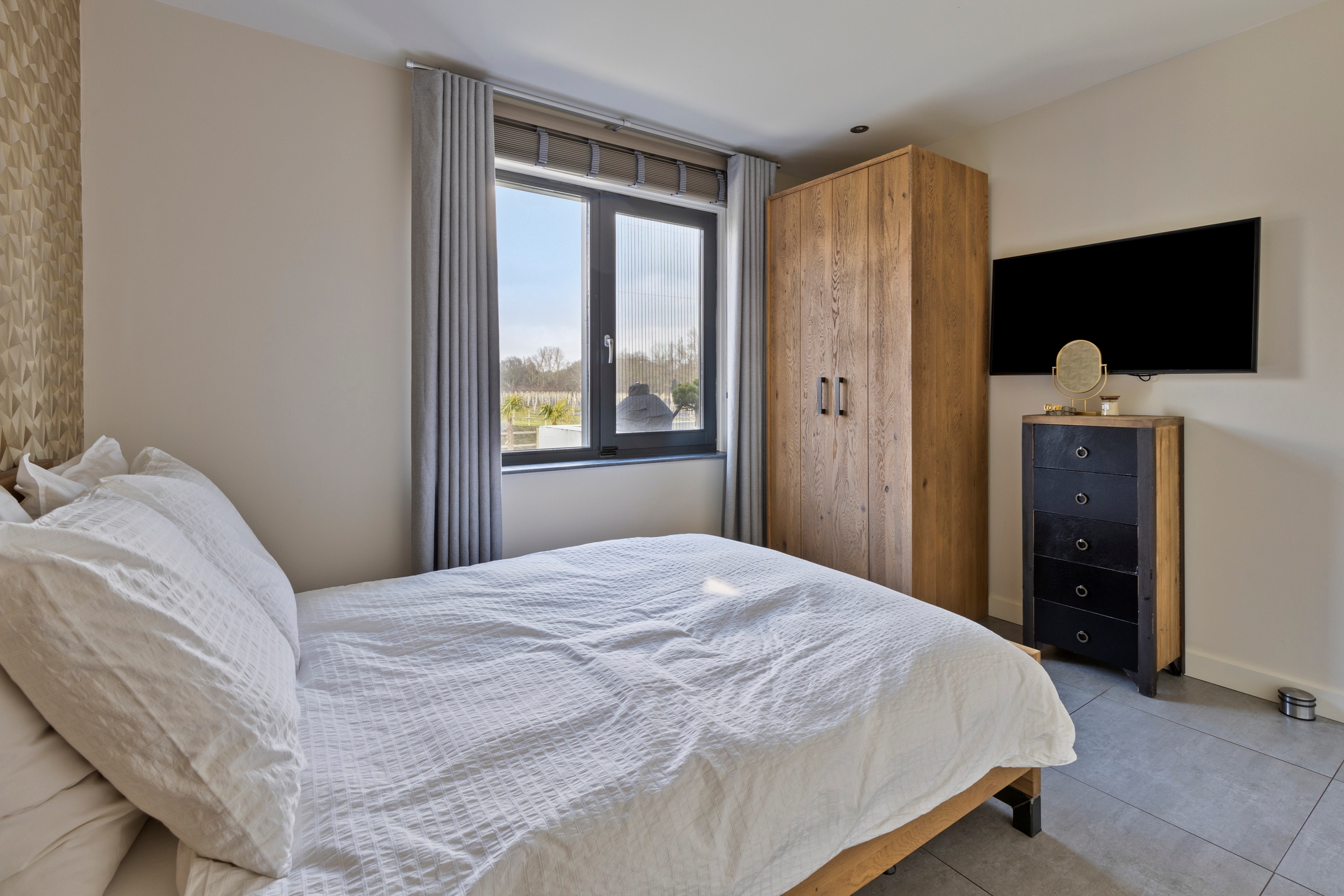 Deze ruime slaapkamer is heerlijk licht dankzij de grote raampartijen en biedt een adembenemend uitzicht. De wanden zijn deels strak gestuct en afgewerkt met sfeervol behang, wat de kamer een warme uitstraling geeft. Een extra pluspunt is de badkamer en-suite, waar stijl en comfort samenkomen. De royale inloopdouche, het elegante wastafelmeubel en het moderne wandtoilet geven de ruimte een strakke en tijdloze uitstraling, perfect passend bij de hoogwaardige afwerking van de rest van de woning.