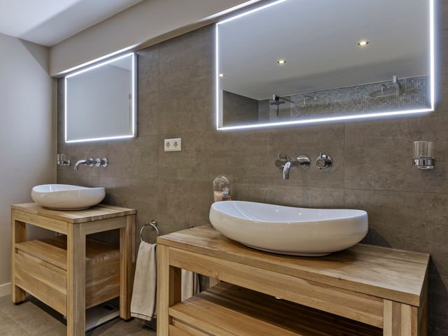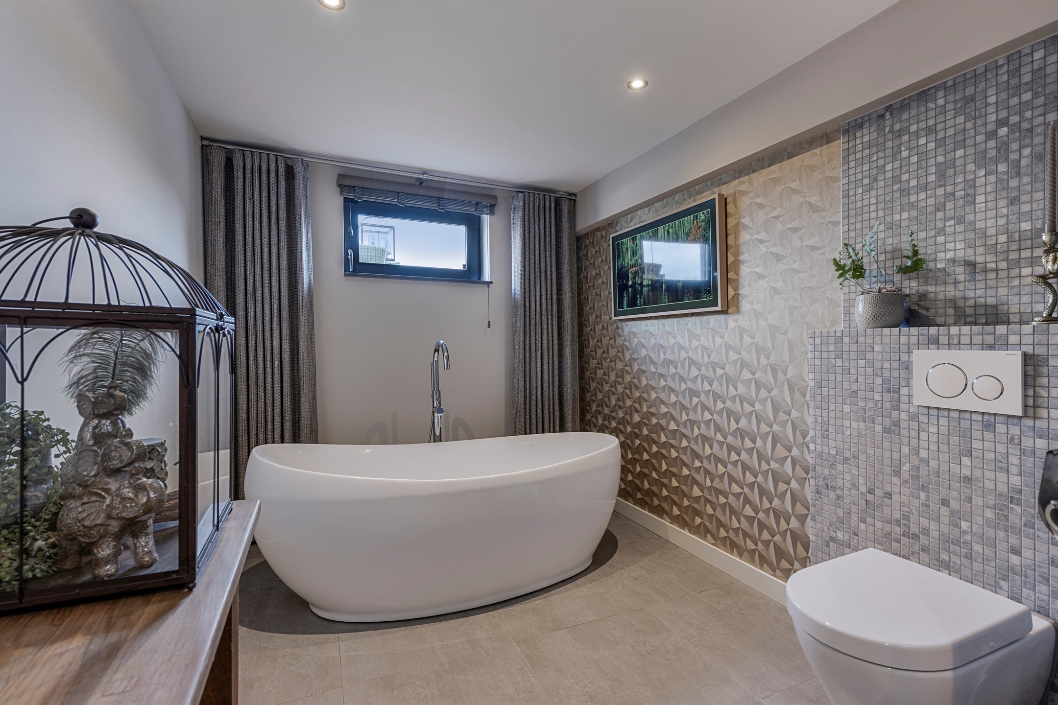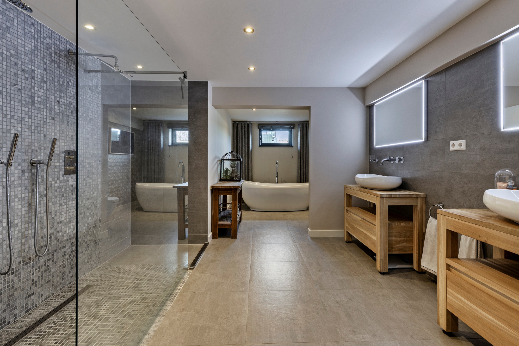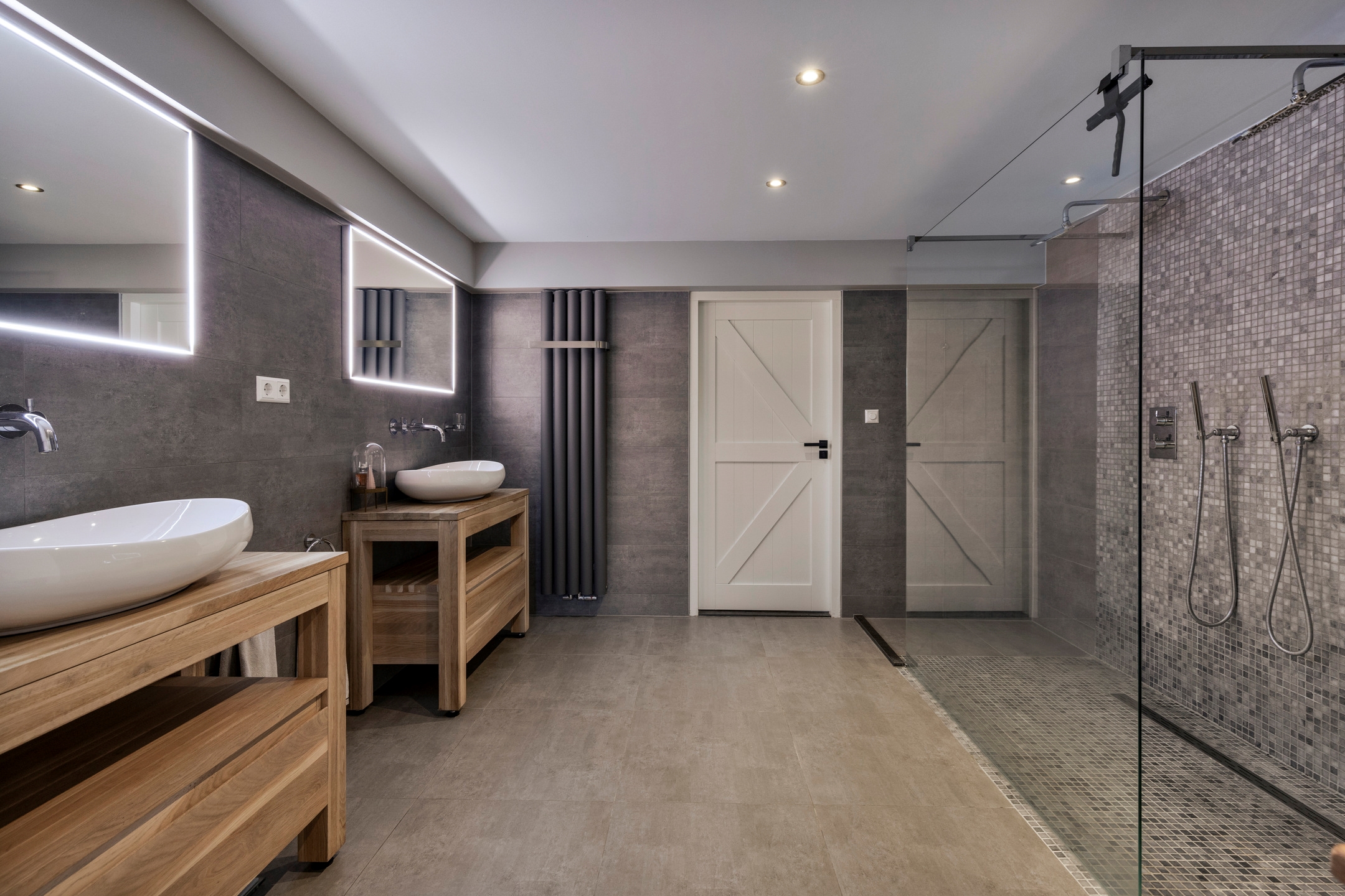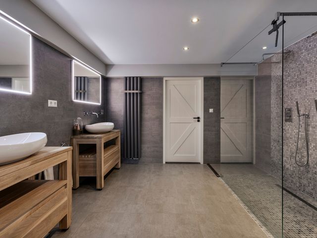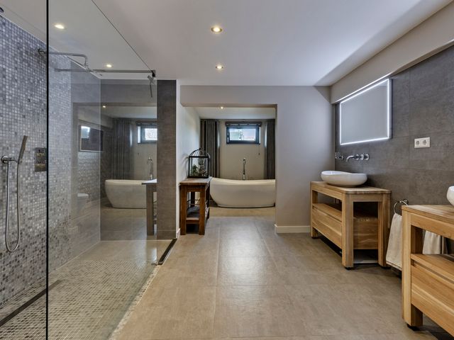 De luxe badkamer in deze woonlaag is een echte blikvanger. Voorzien van een riante inloopdouche met dubbele regendouche, een vrijstaand ligbad, een wandcloset, een designradiator en twee stijlvolle wastafelmeubels met waskommen. De hoogwaardige afwerking en sfeervolle verlichting zorgen voor een wellness gevoel in eigen huis.