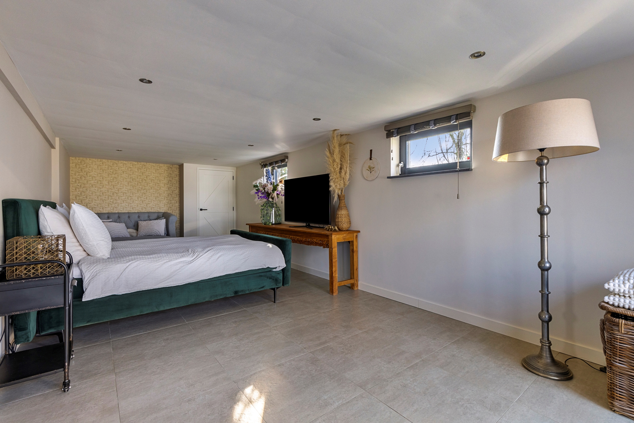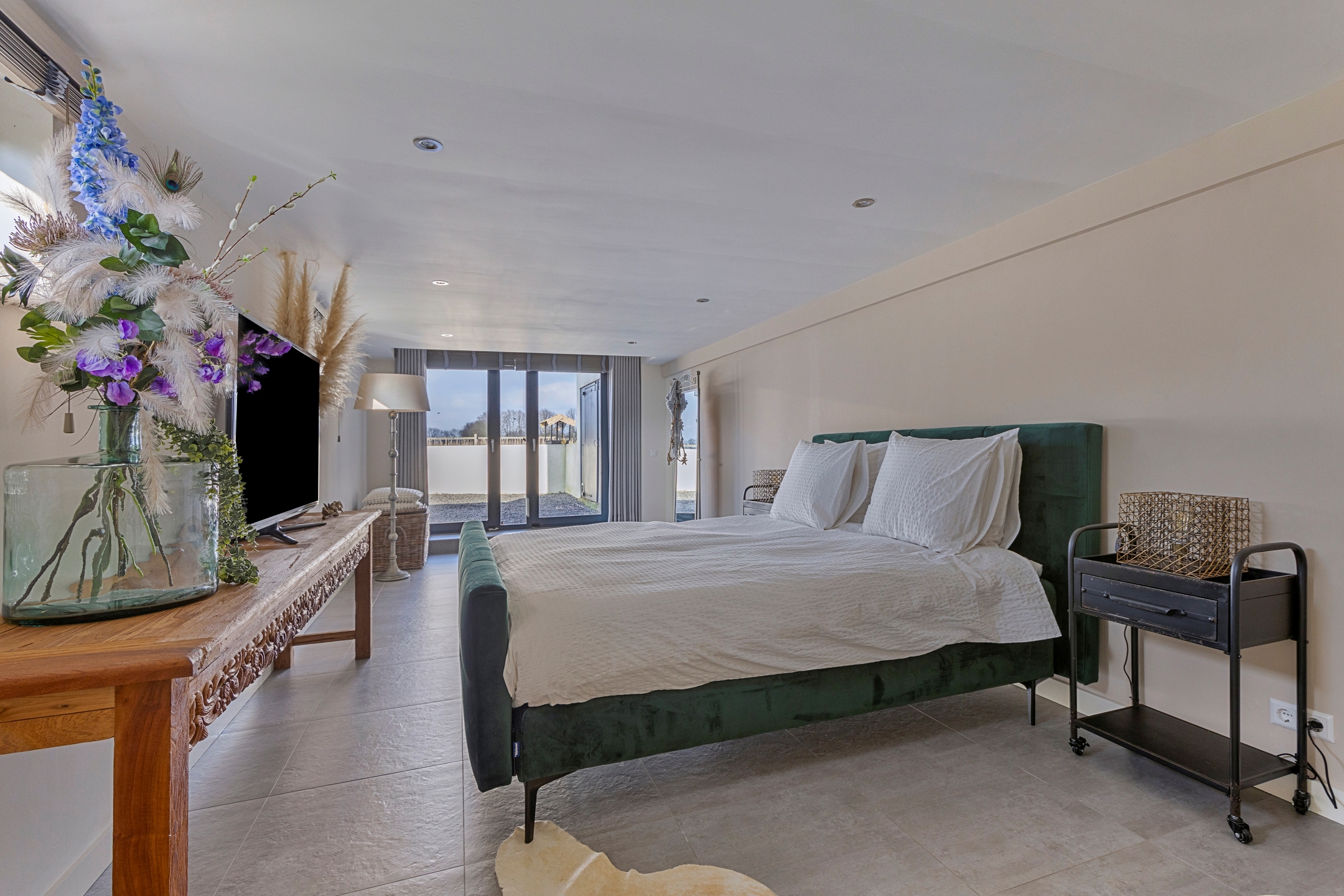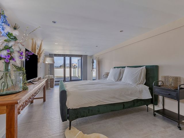 De royale master bedroom is een lichte en sfeervolle ruimte met een luxe uitstraling. Dankzij de brede glazen pui is er een directe verbinding met buiten, wat zorgt voor veel natuurlijk licht en een open sfeer. De kamer biedt volop ruimte voor een comfortabel bed en een grote kledingkast. De neutrale afwerking en hoogwaardige materialen maken het eenvoudig om hier een stijlvolle en persoonlijke slaapruimte te creëren.