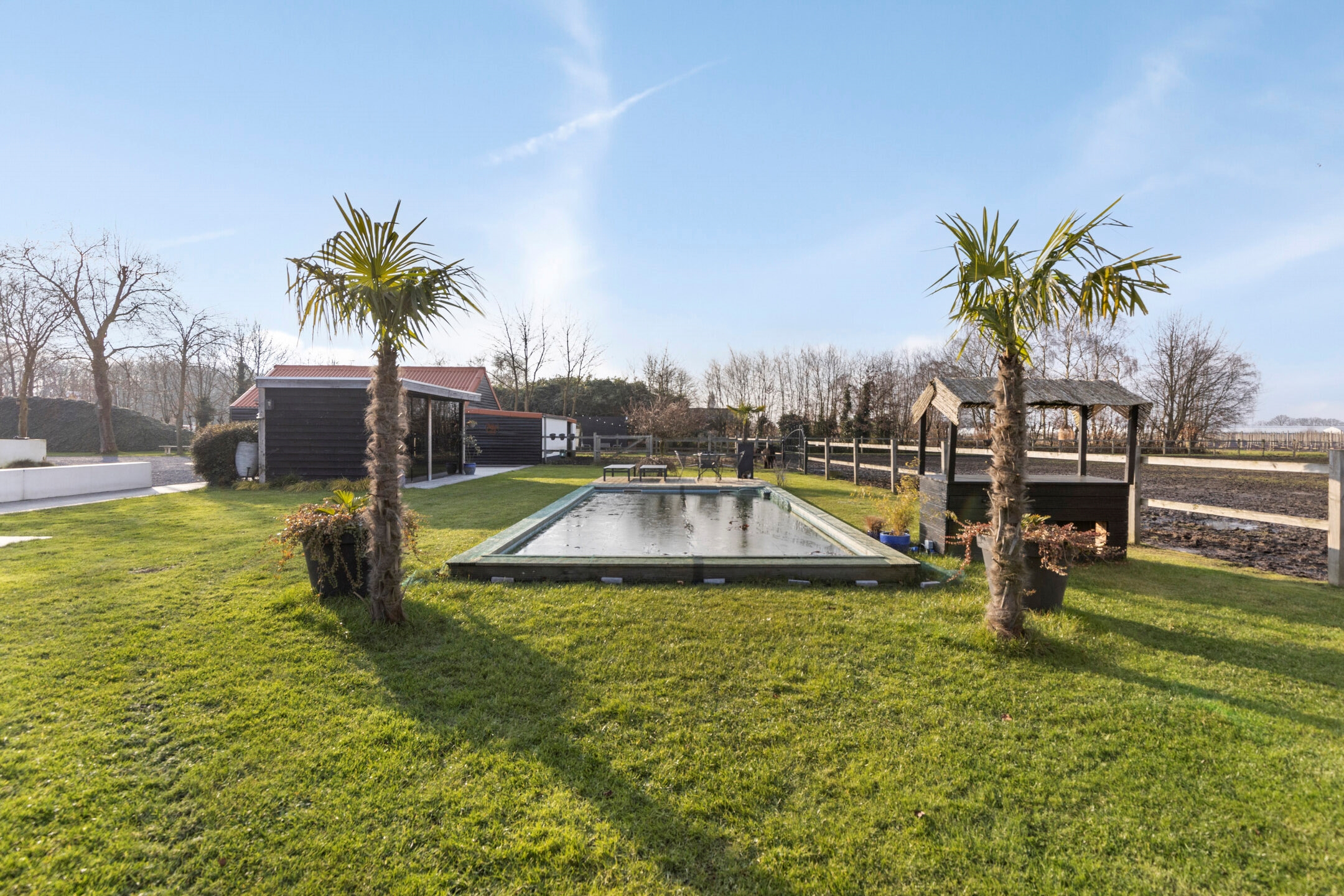 Voor extra ontspanning is er een stijlvol poolhouse met donkere, getinte glazen wanden, waar u het hele jaar door kunt genieten van het buitenleven. Het dak van dit poolhouse is voorzien van een Sedum dak.