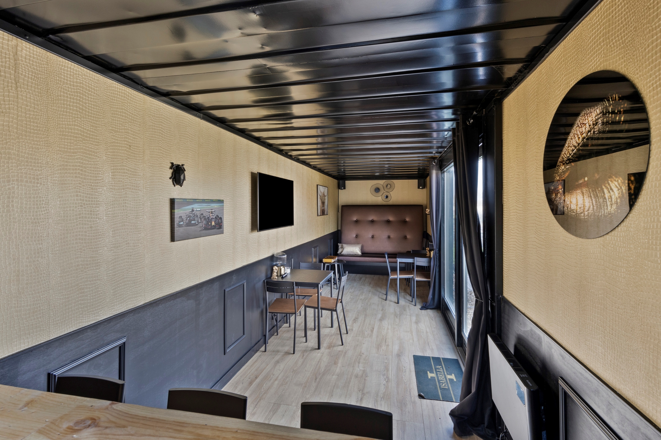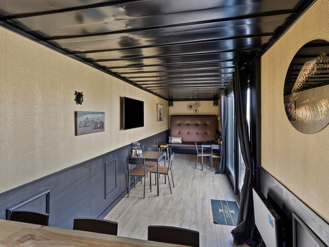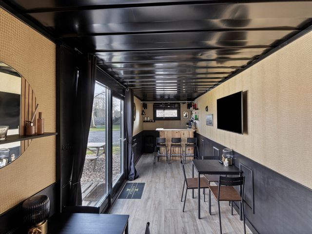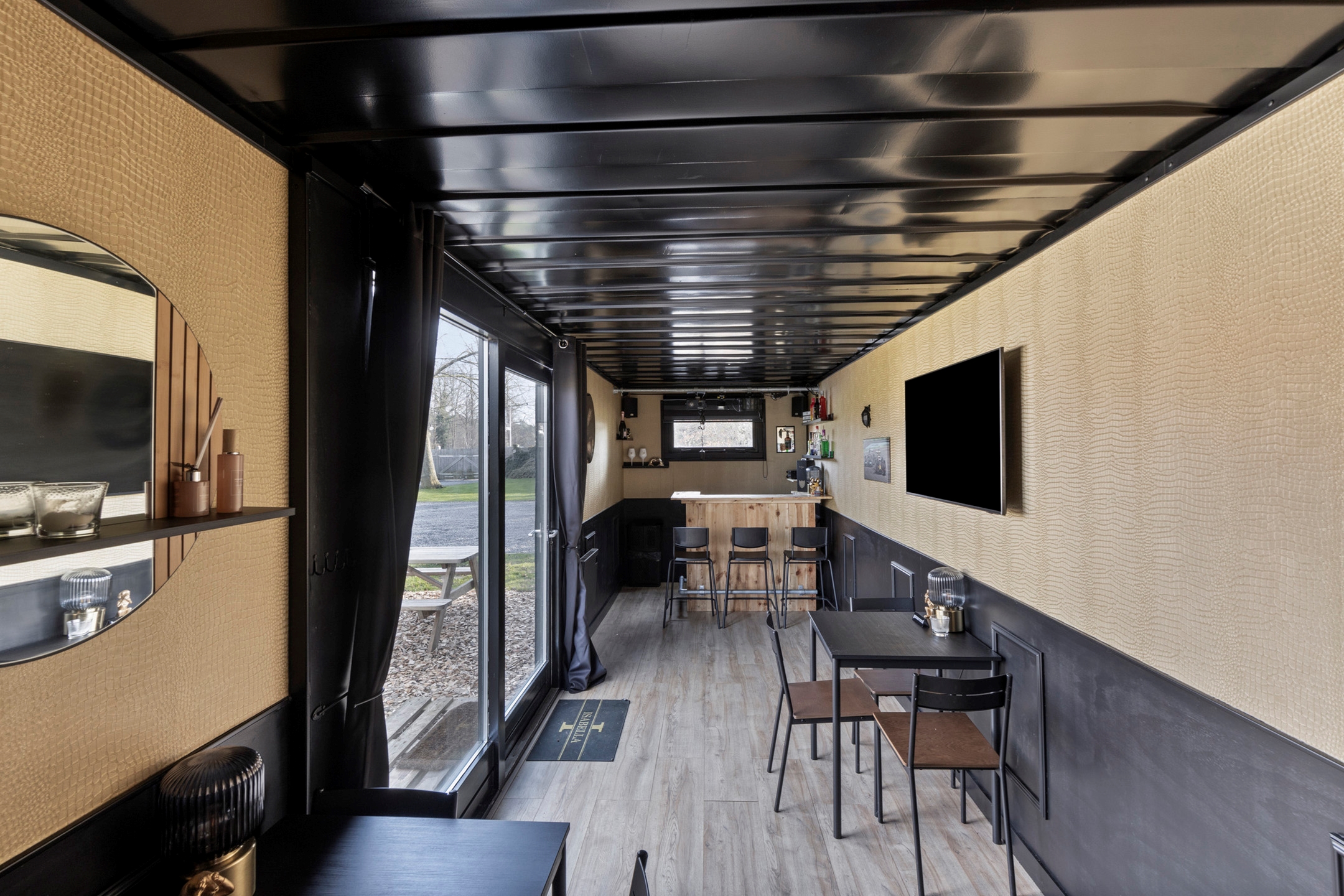 Deze unieke bar is gevestigd in een volledig geïsoleerde container en biedt een sfeervolle plek voor ontspanning en gezelligheid. De ruimte is uitgerust met elektra en stijlvol afgewerkt, met een knusse zithoek, een strakke bar en voldoende ruimte voor gasten. Dankzij de grote glazen deuren is er een directe verbinding met de tuin, waardoor binnen en buiten naadloos in elkaar overlopen.