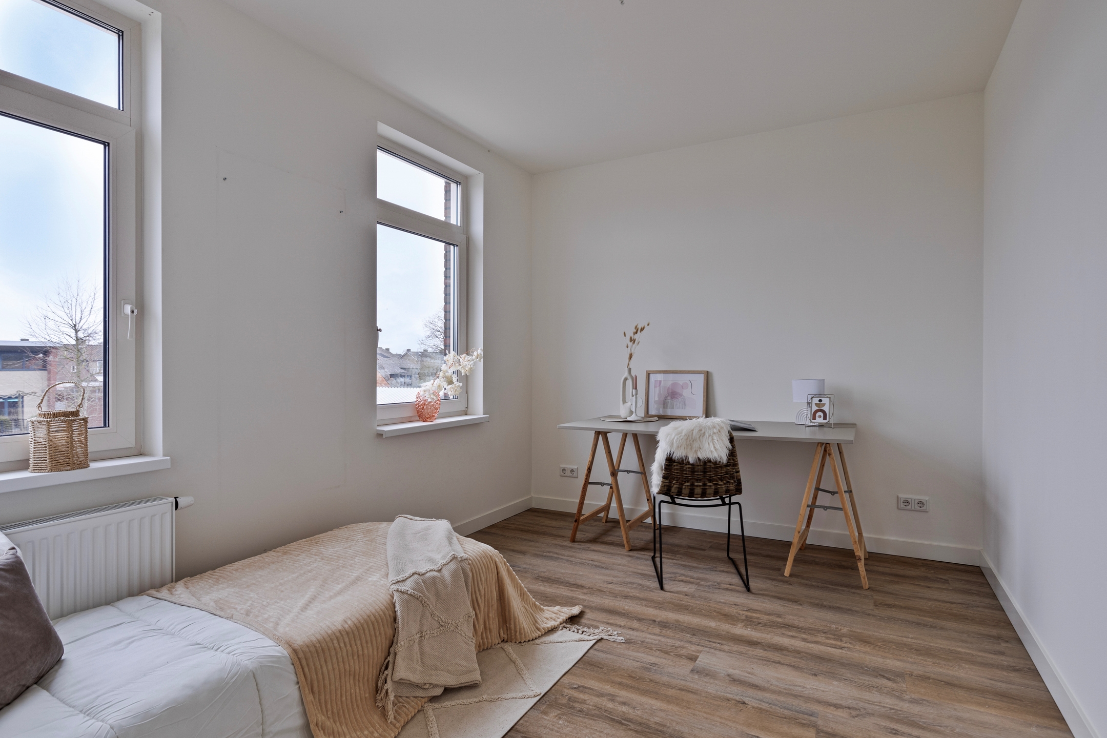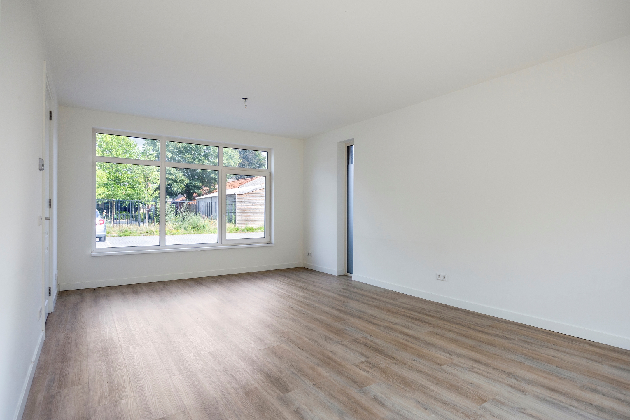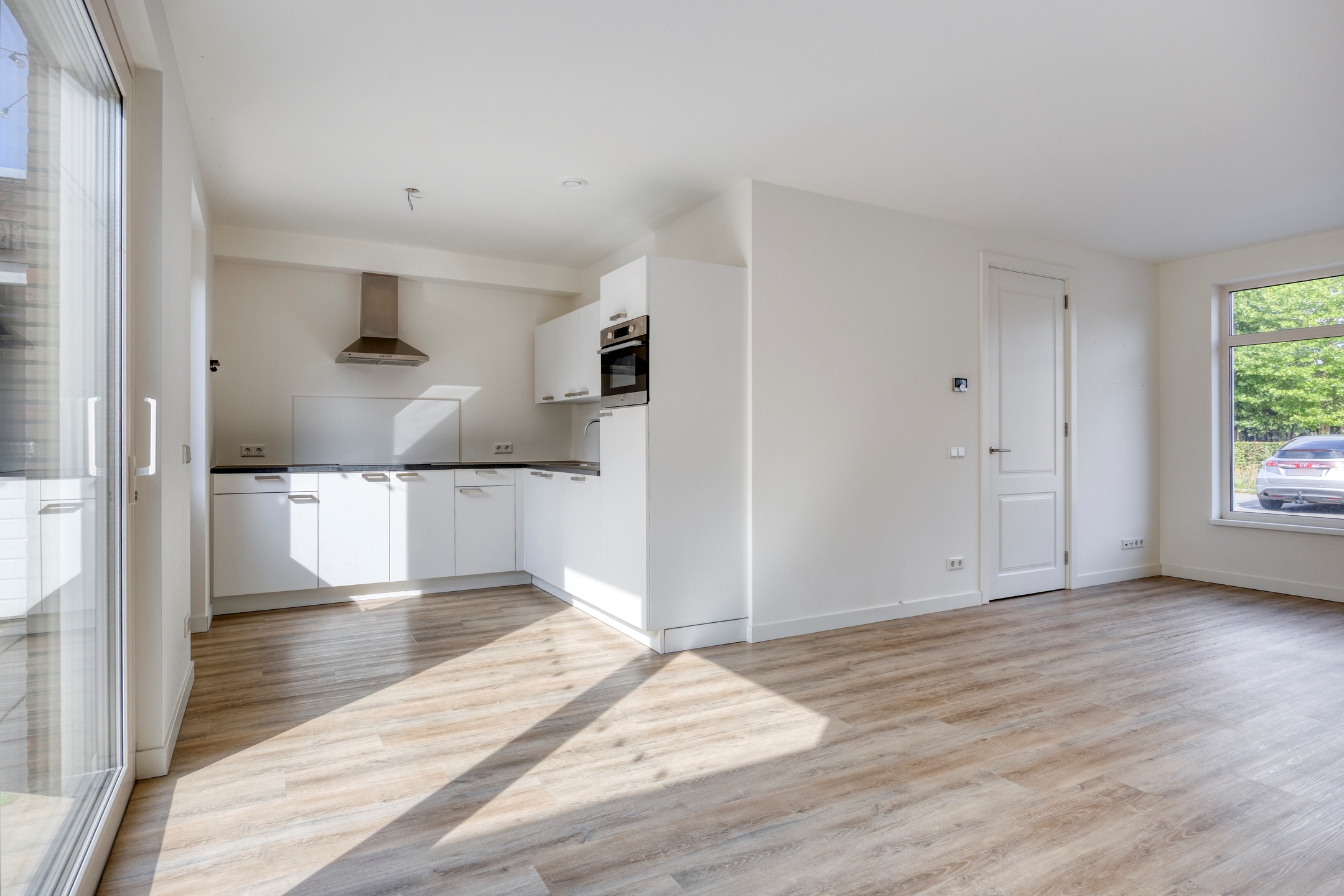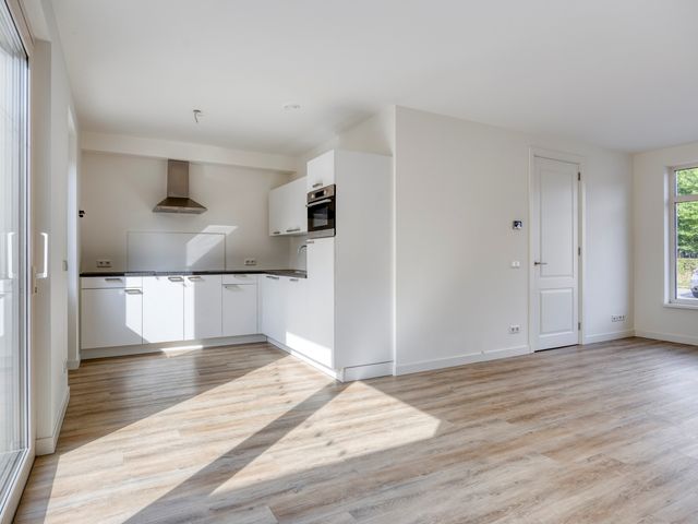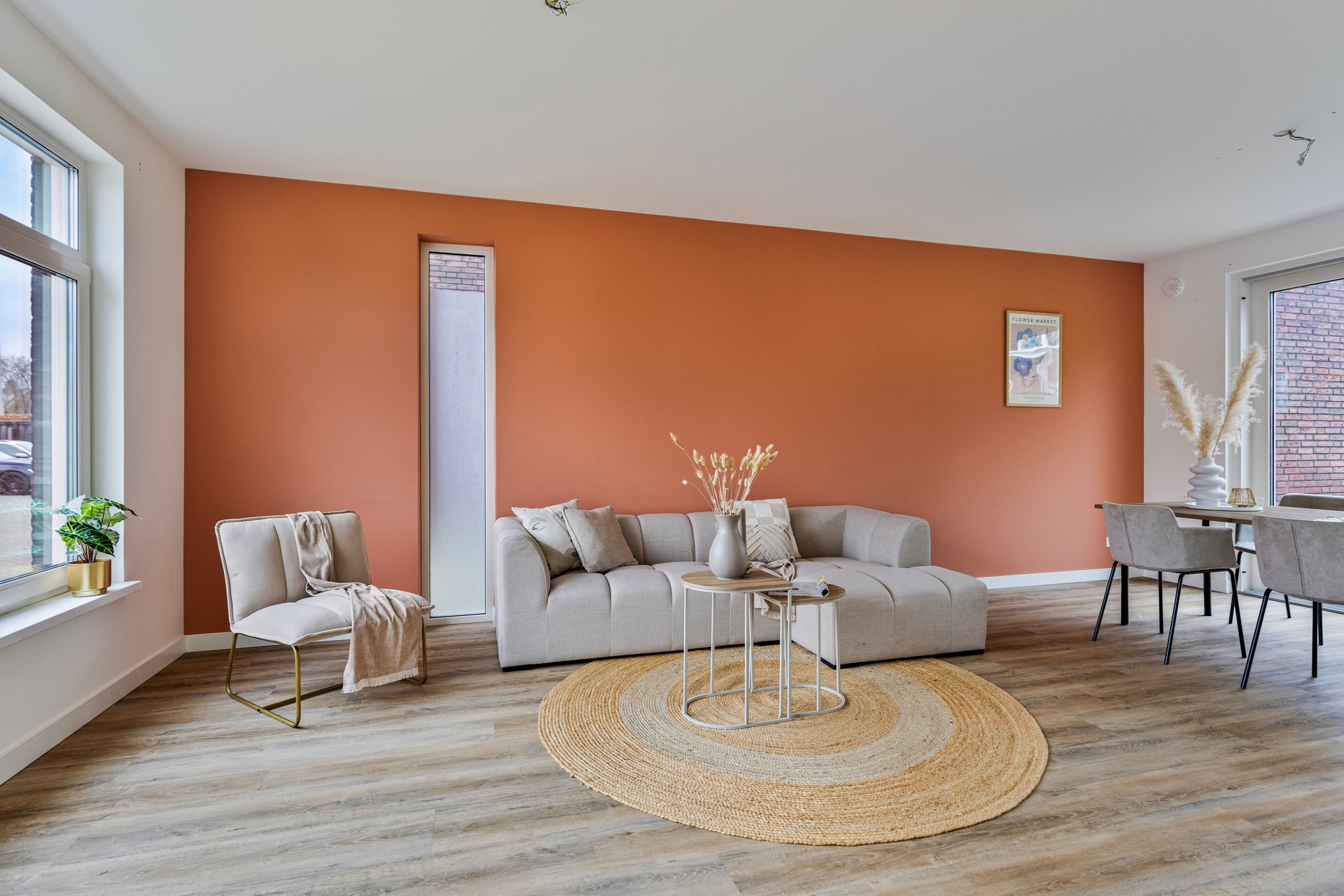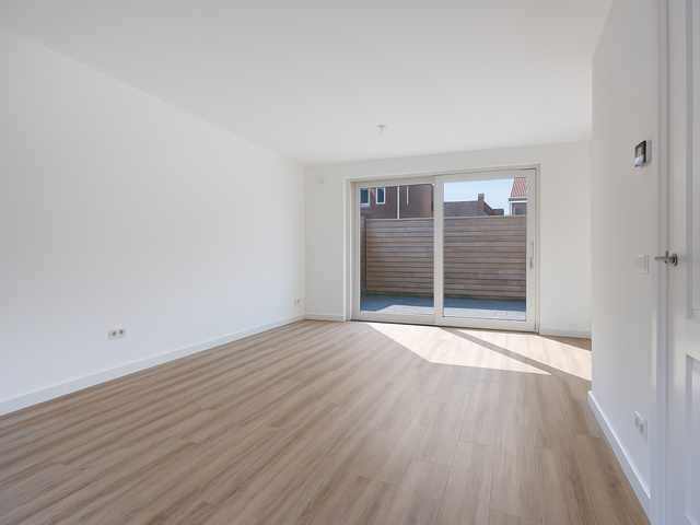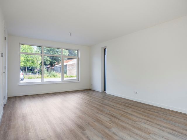 Dankzij de grote raampartijen en de schuifpui aan de achterzijde baadt de woonkamer in natuurlijk licht, wat zorgt voor een aangename en open sfeer. De woonkamer is voorzien van een pvc-vloer met vloerverwarming en de wanden zijn strak gestuct, wat een moderne en verzorgde uitstraling geeft.