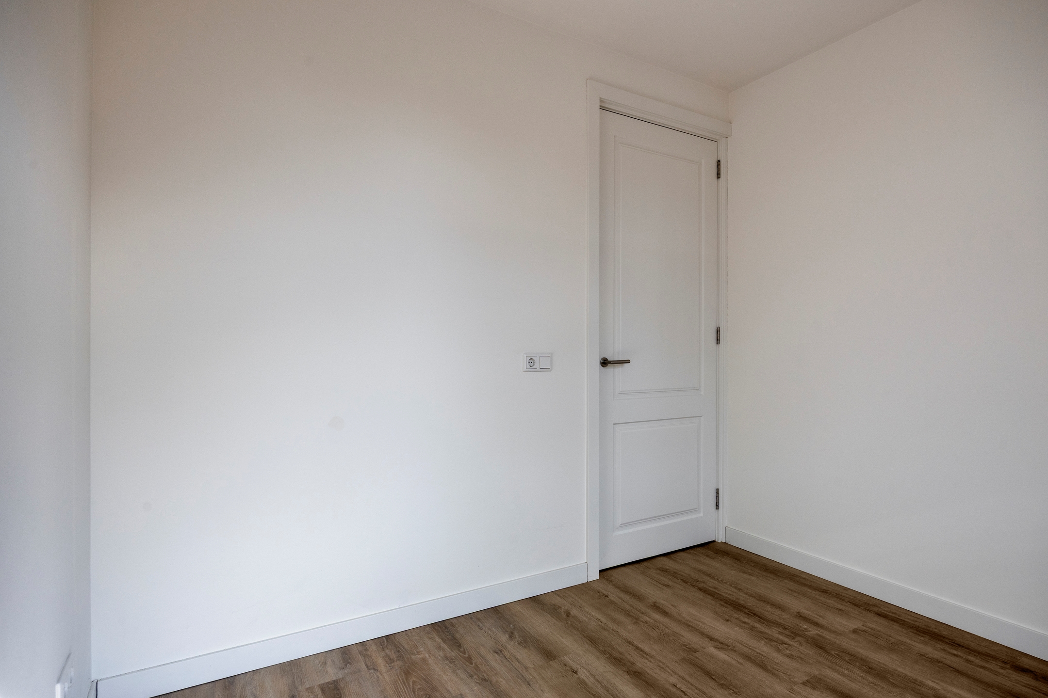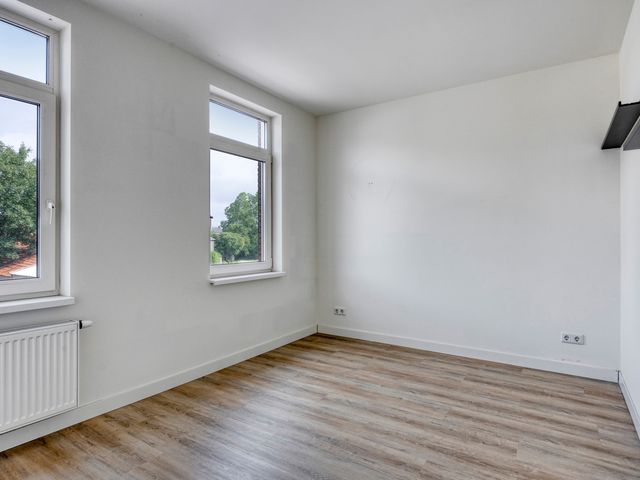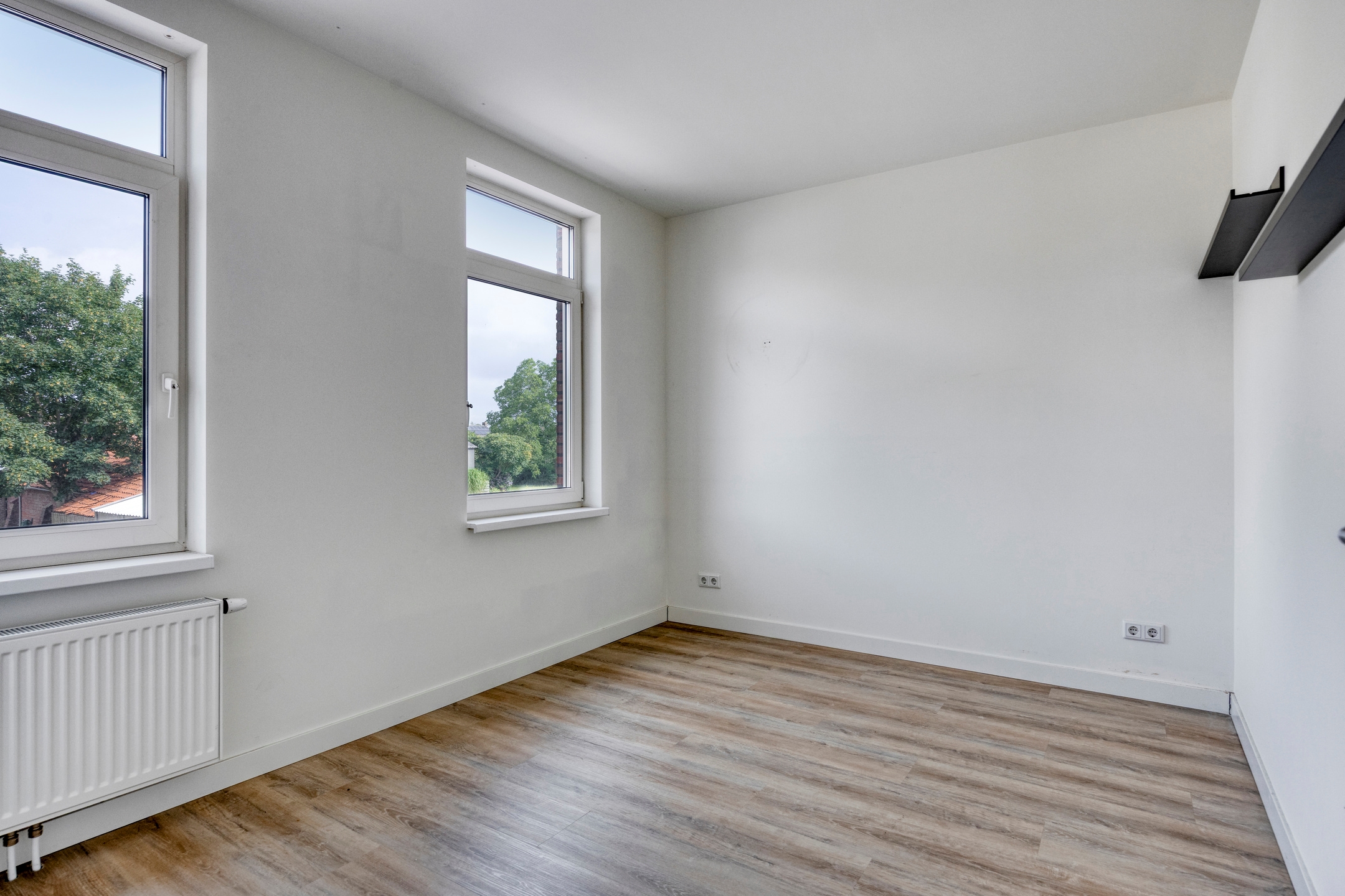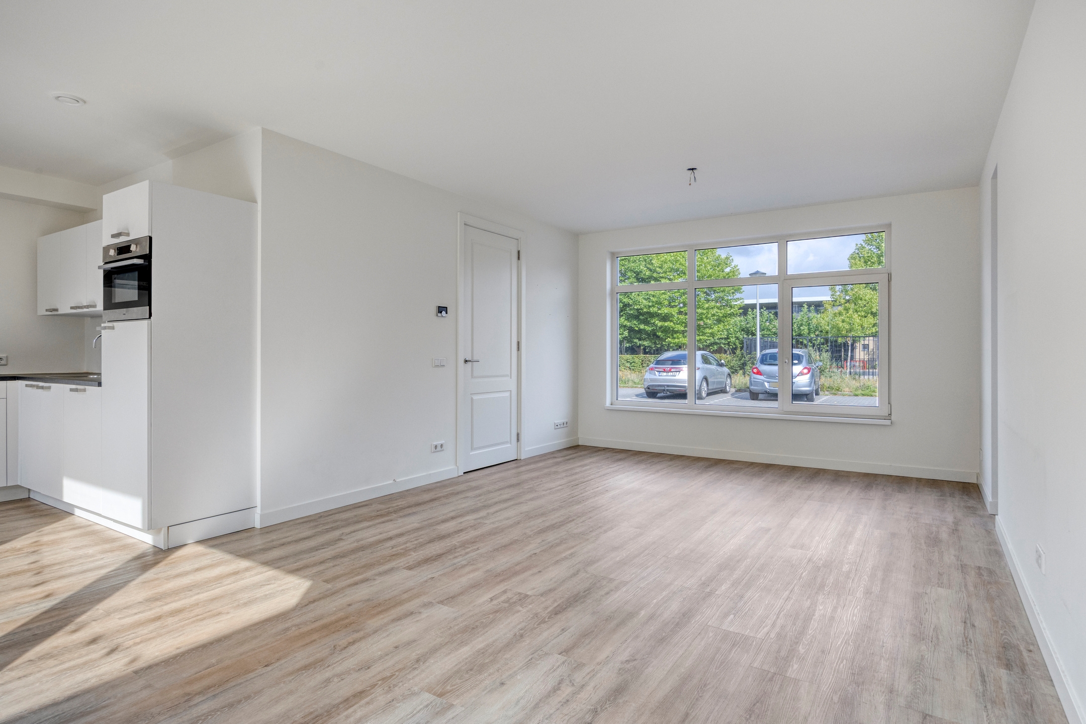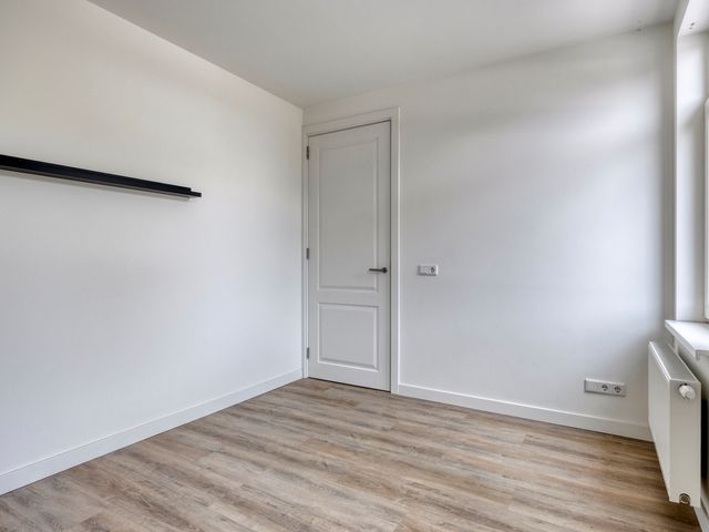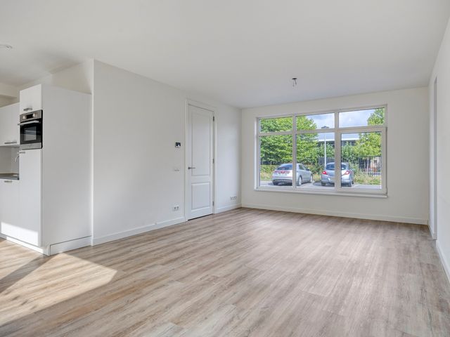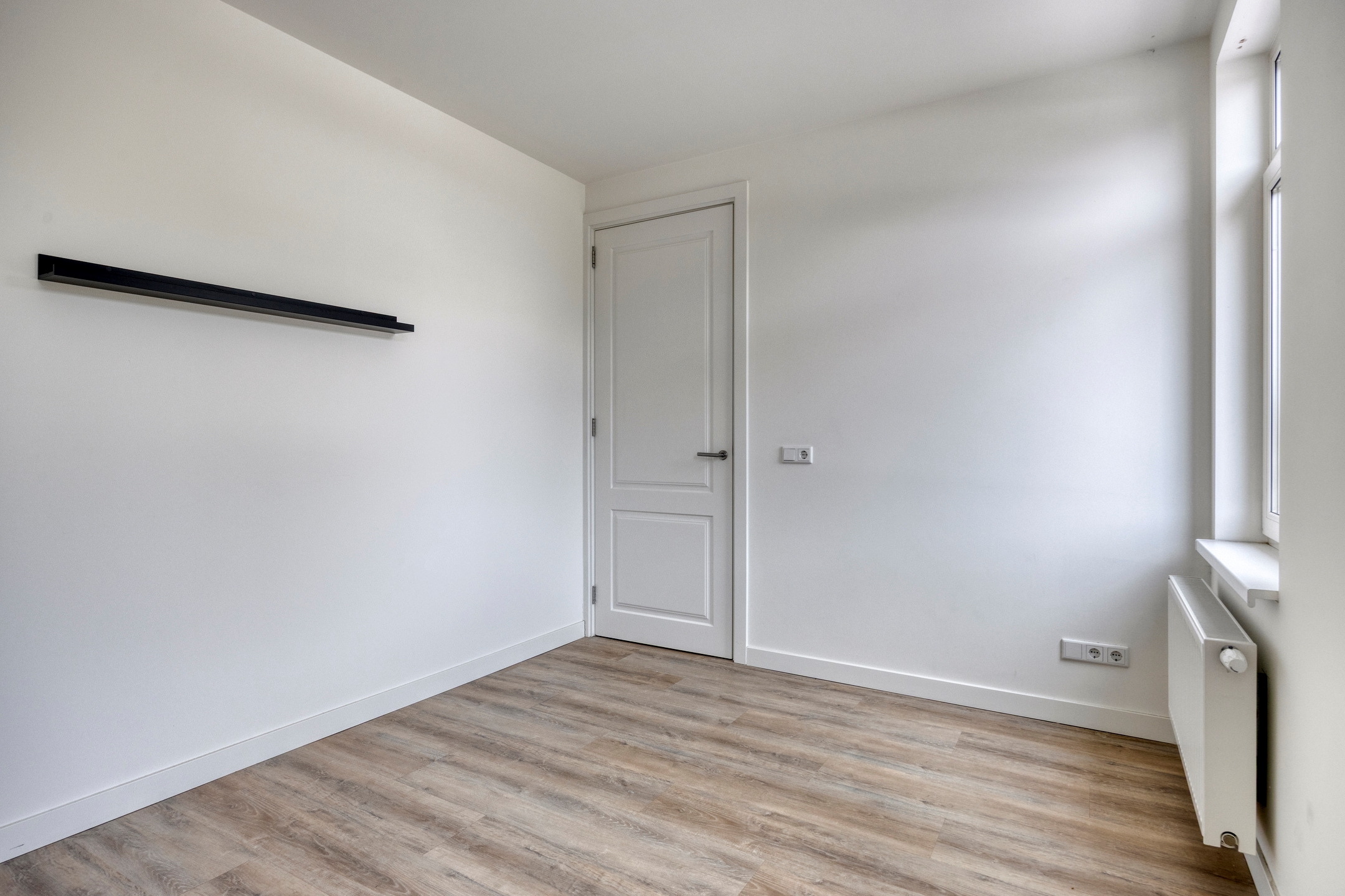 Dankzij de grote raampartijen en de schuifpui aan de achterzijde baadt de woonkamer in natuurlijk licht, wat zorgt voor een aangename en open sfeer. De woonkamer is voorzien van een pvc-vloer met vloerverwarming en de wanden zijn strak gestuct, wat een moderne en verzorgde uitstraling geeft.