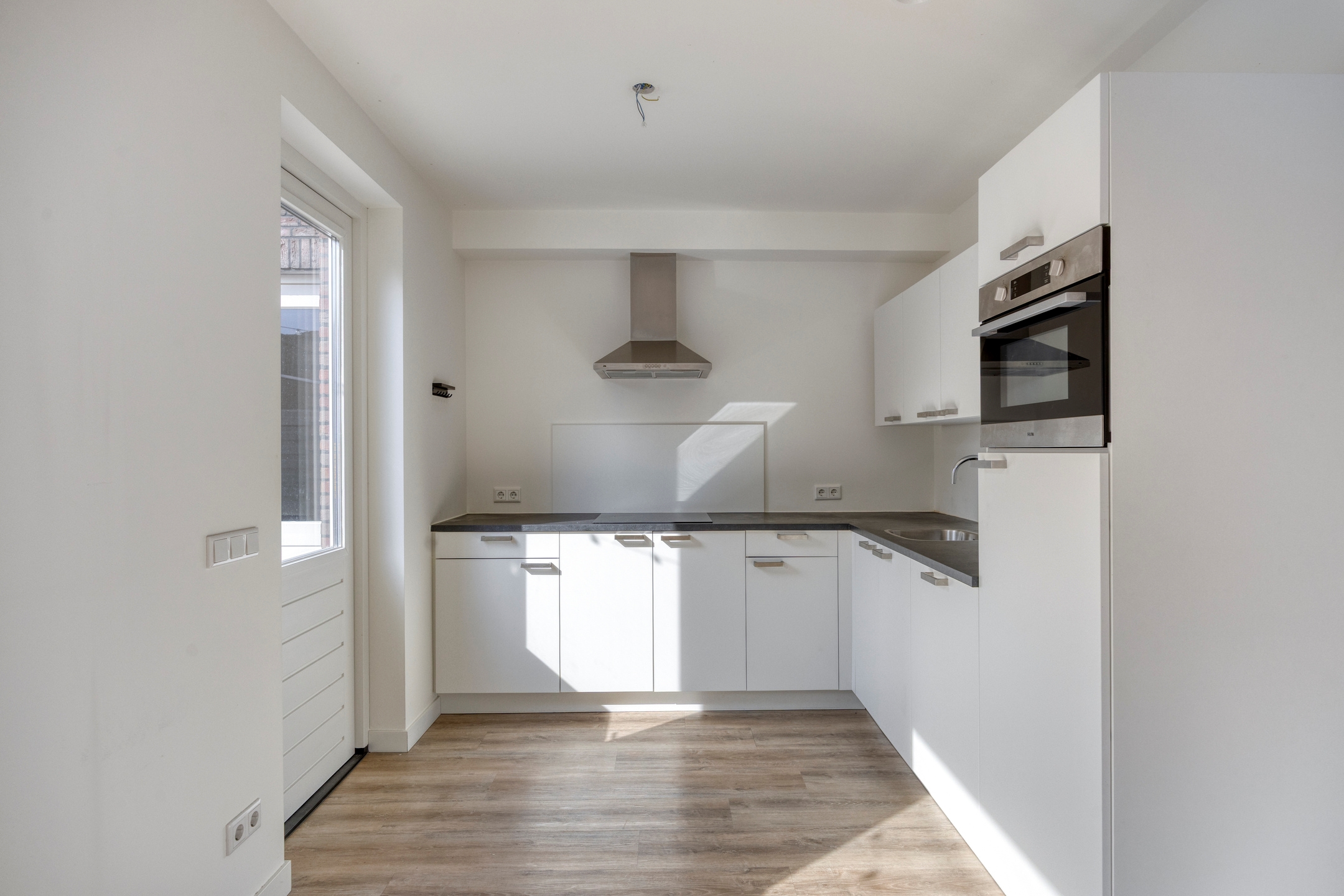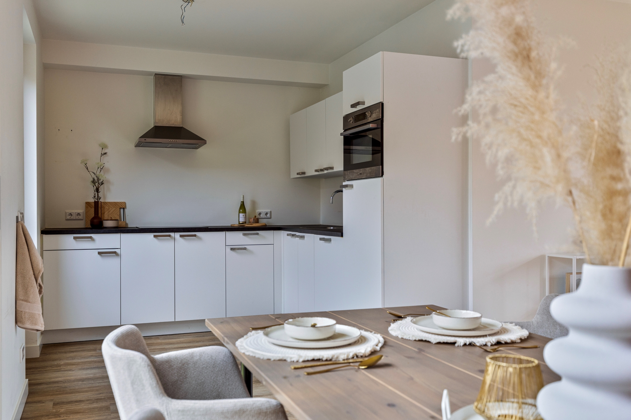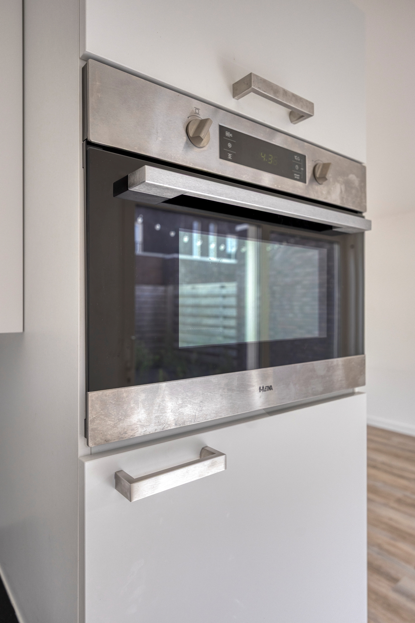 De moderne open keuken is compleet ingericht en voorzien van een inductiekookplaat, rvs-afzuigkap, combi-oven, koelkast en vaatwasser. Deze praktische indeling zorgt voor optimaal kookgemak en een fijne verbinding met de woonkamer. Via een loopdeur in de keuken bereikt u de achtertuin.