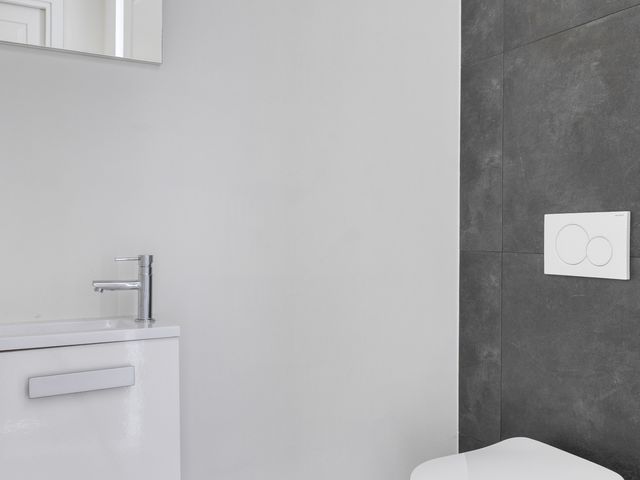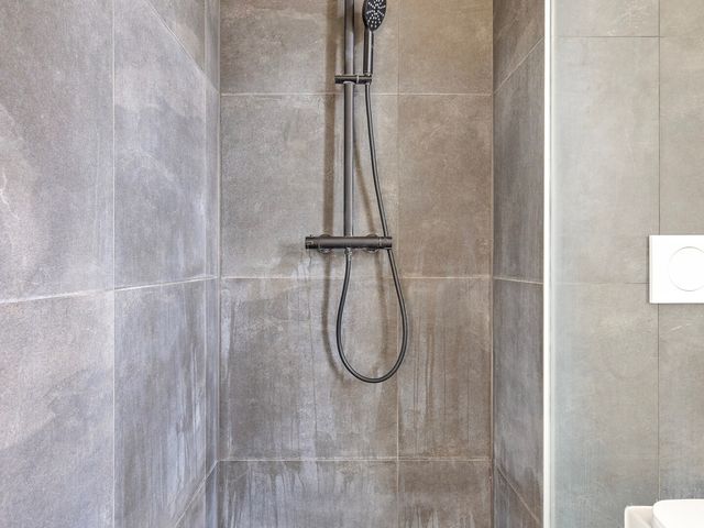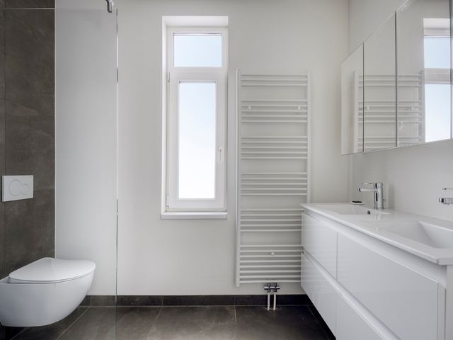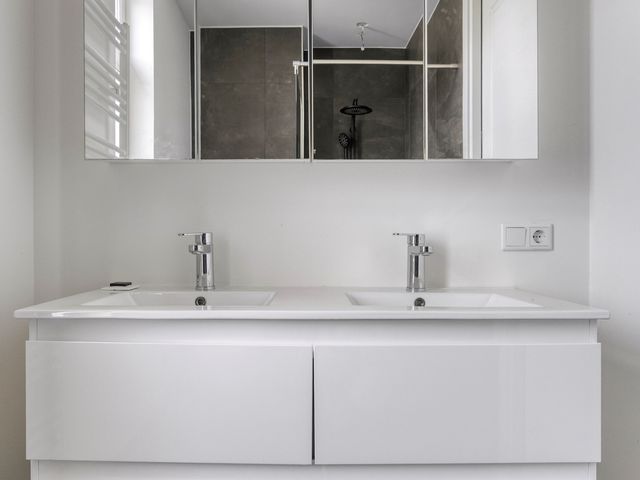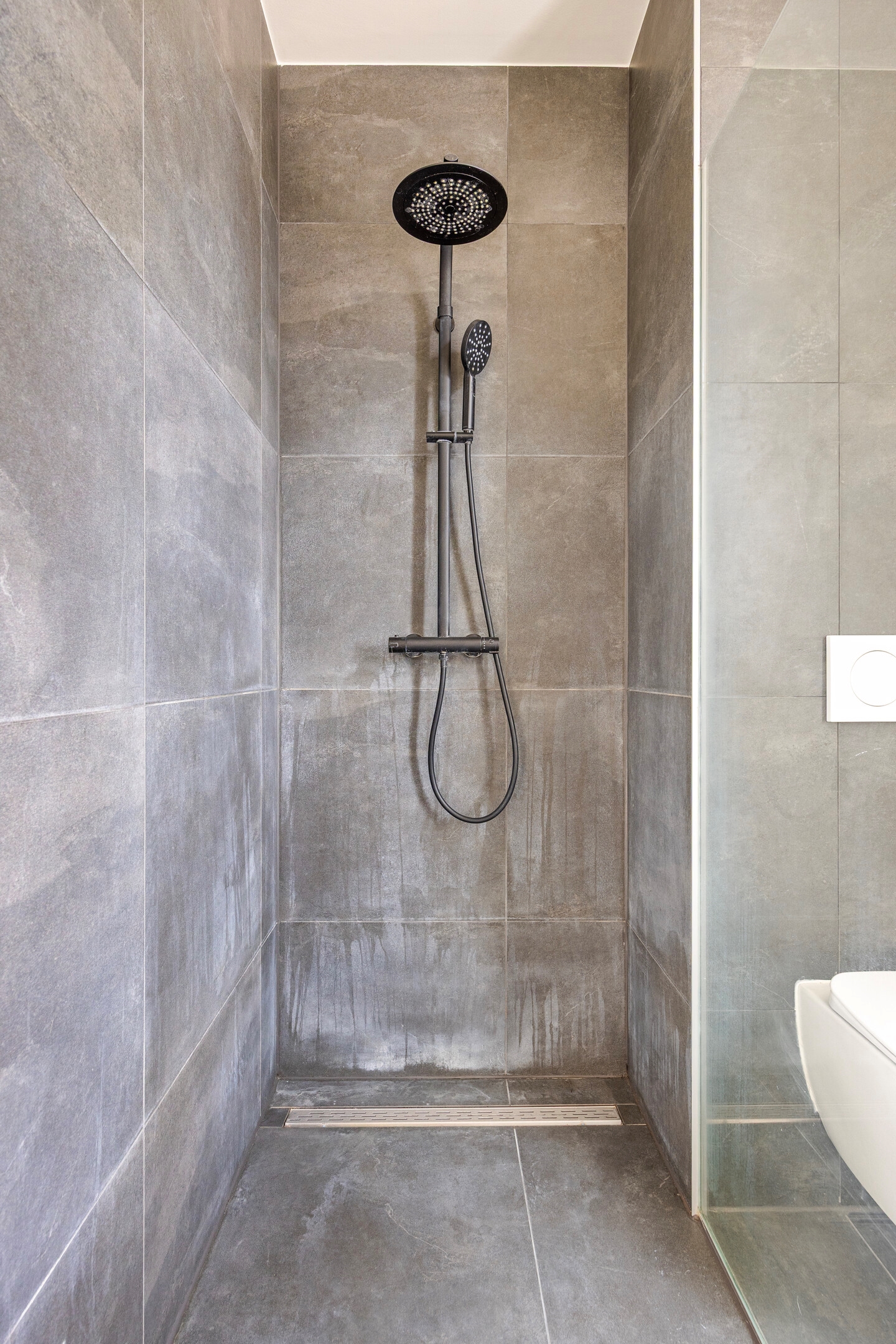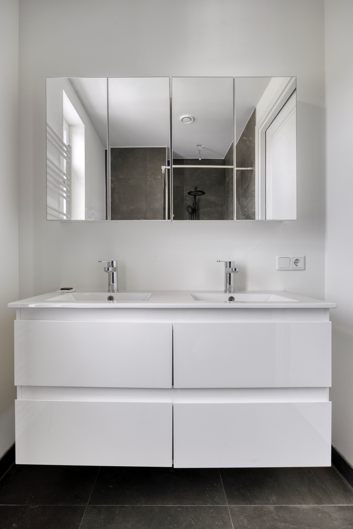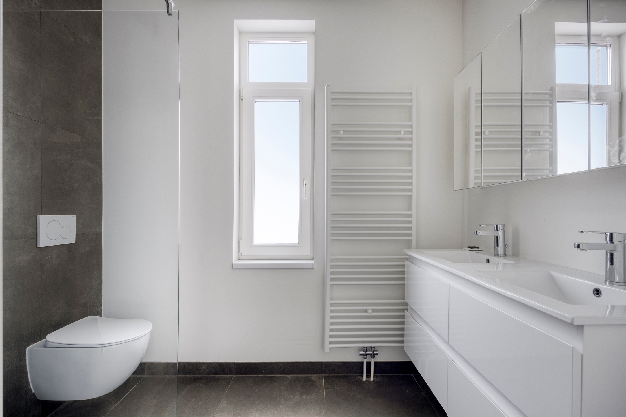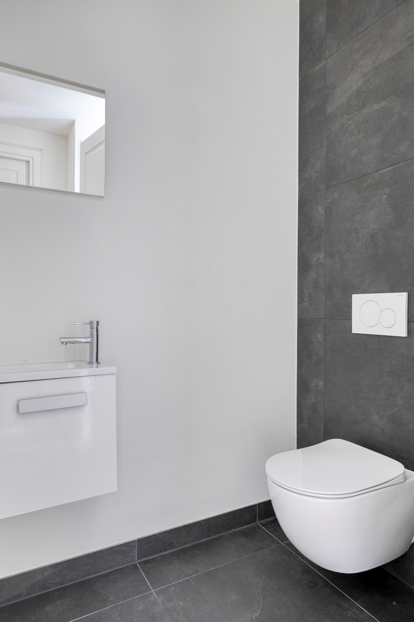 De moderne badkamer is voorzien van een inloopdouche, een dubbele wastafel in een badkamermeubel, een designradiator en een wandcloset. De ruimte is deels betegeld en deels strak gestuct.