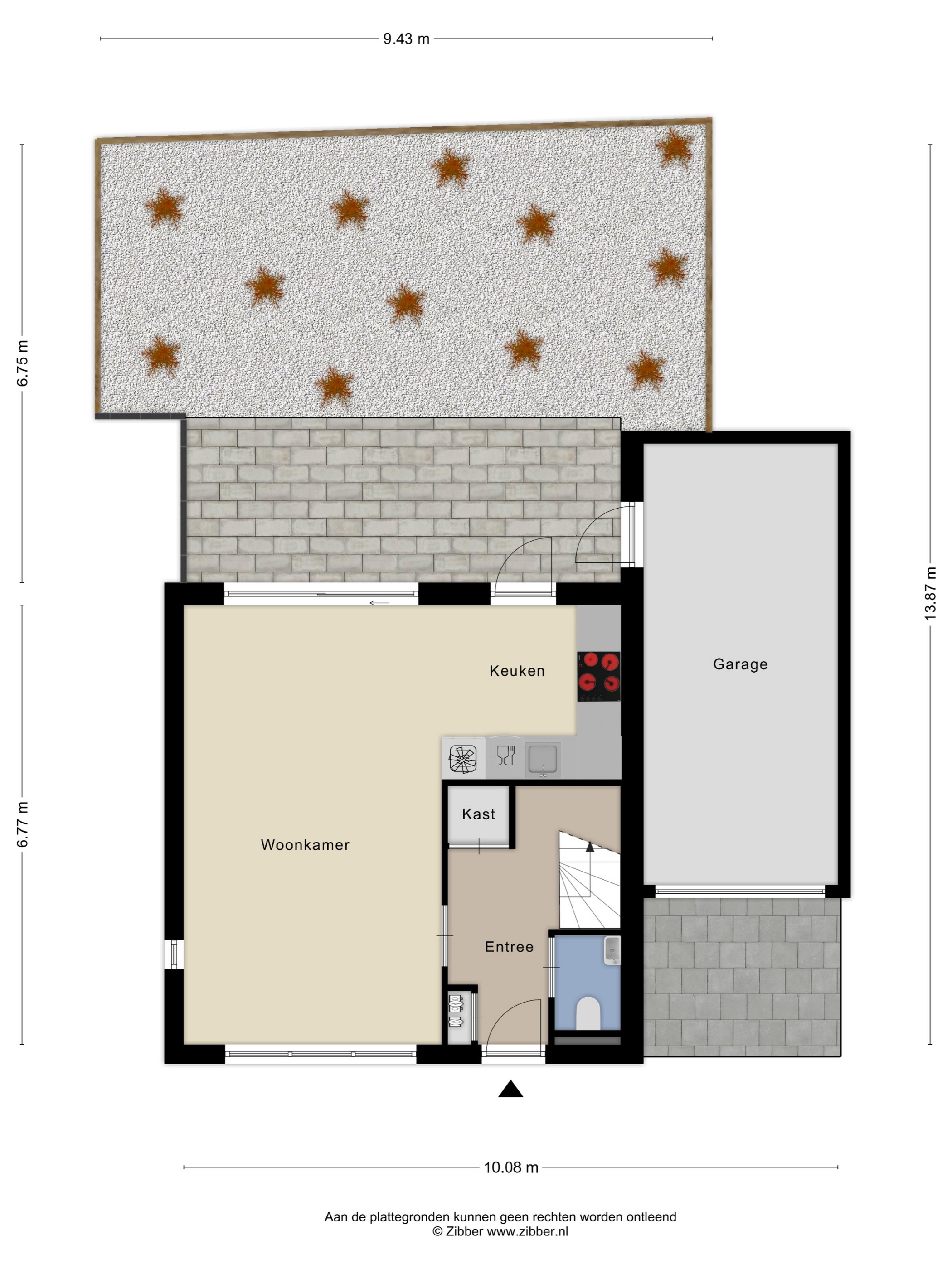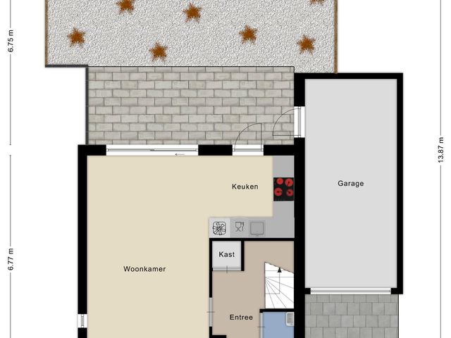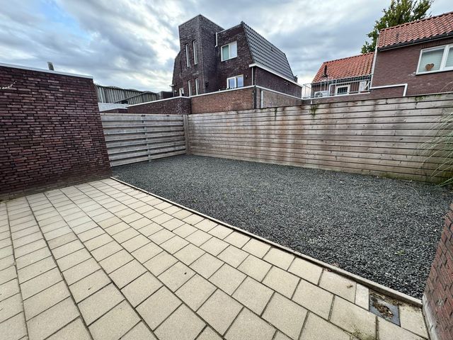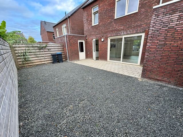 De tuin is momenteel voorzien van grind en bestrating, en biedt alle ruimte om geheel naar eigen smaak te worden ingericht.