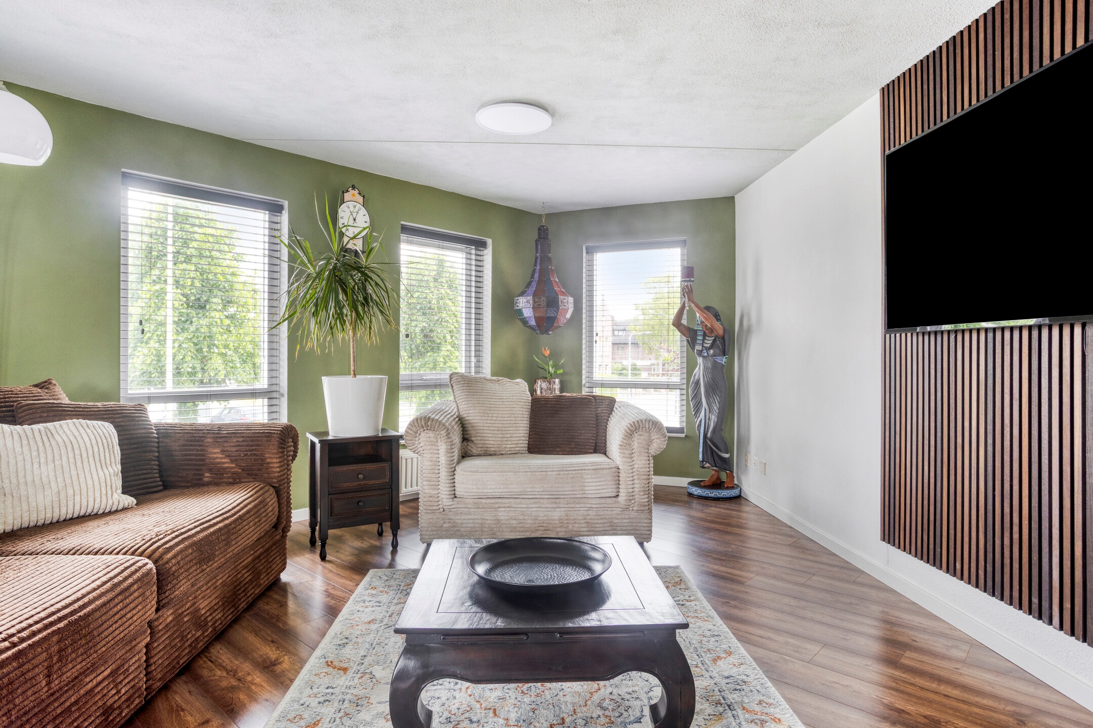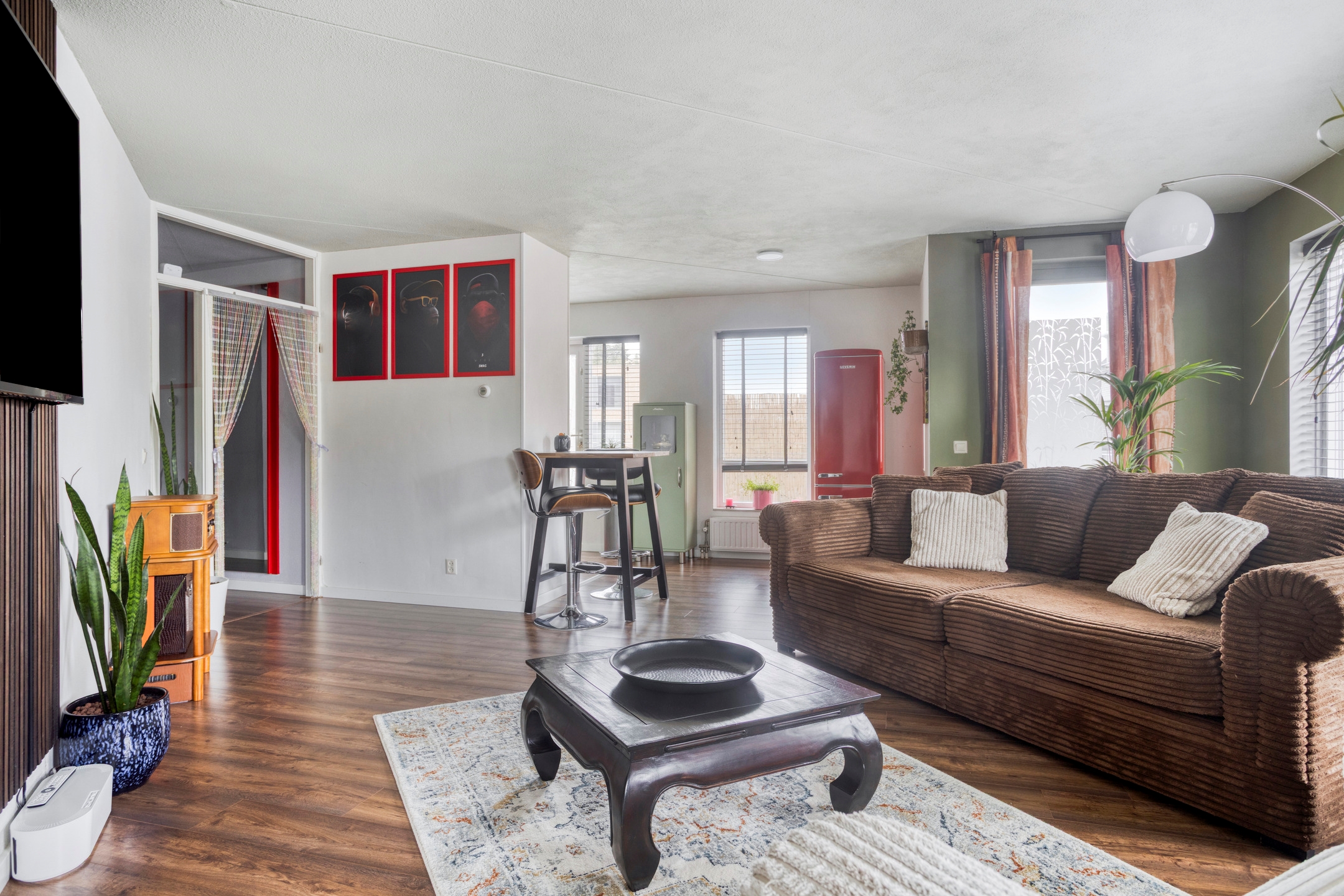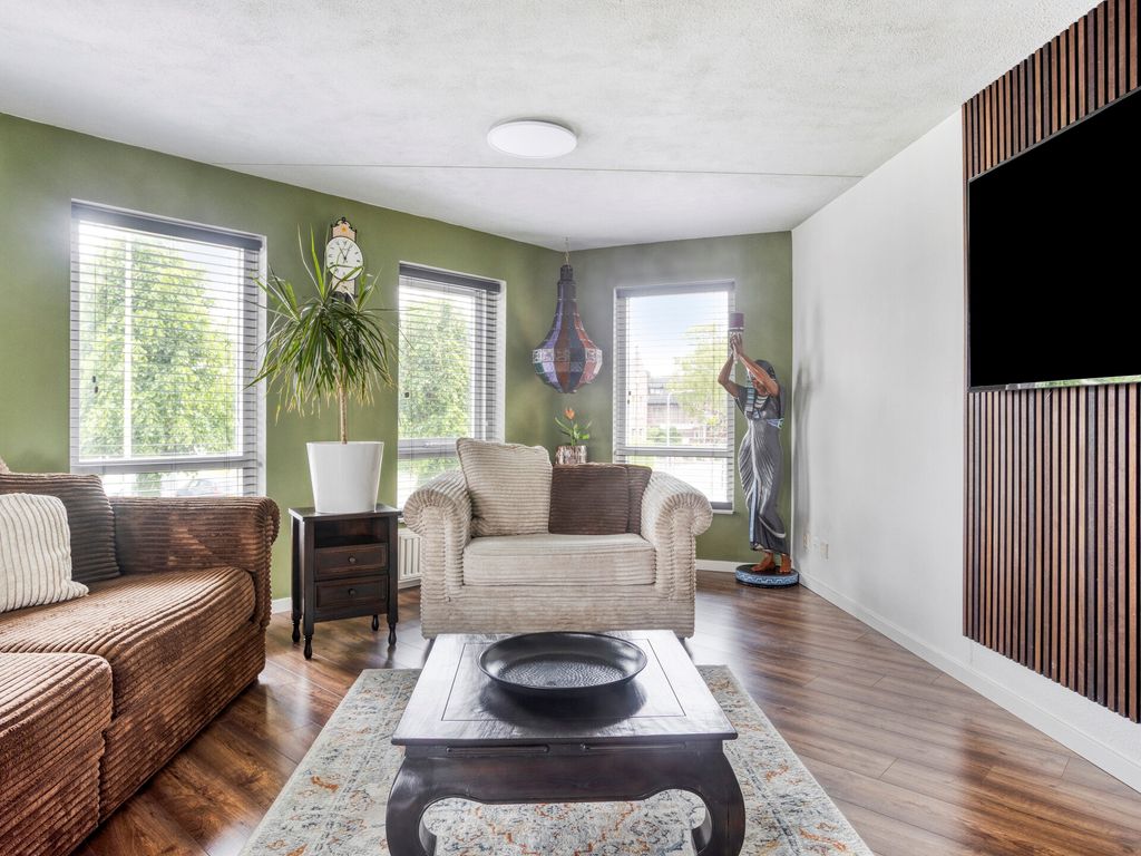 De verrassend ruime woonkamer valt direct op door de fijne lichtinval en het vrije uitzicht op de omgeving. Tevens staat de woonkamer in semi-open verbinding met de keuken. De vloer is voorzien van een donkere laminaatvloer. Via de woonkamer bereikt u het fijne balkon.