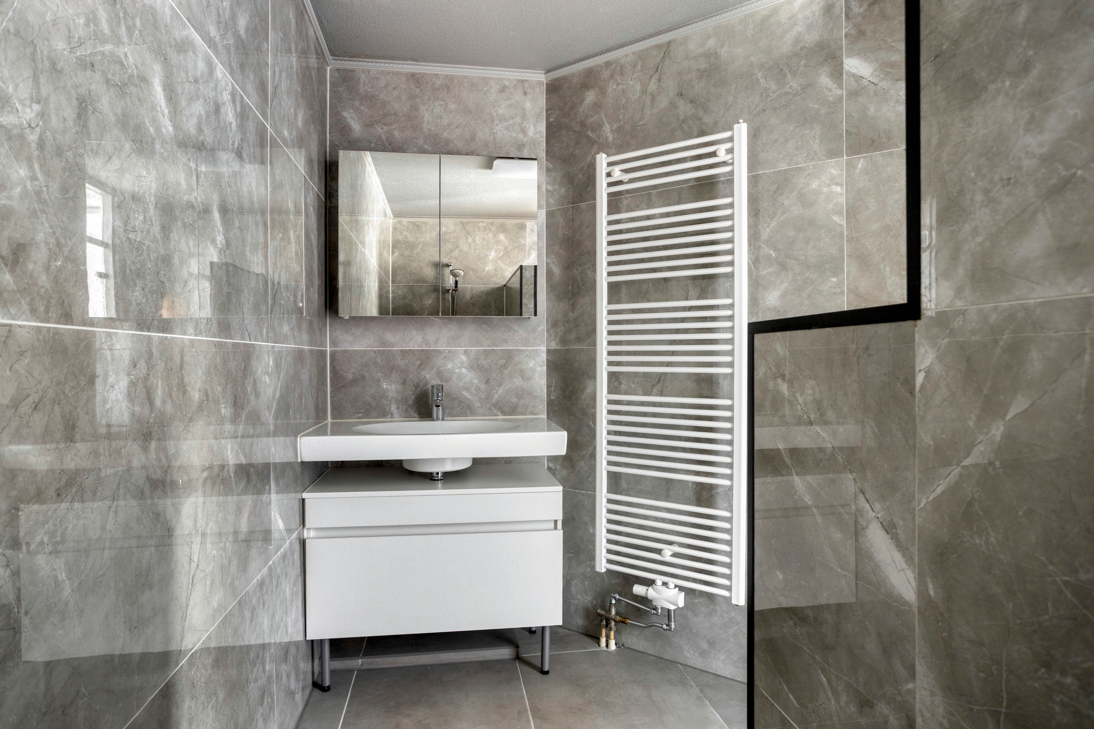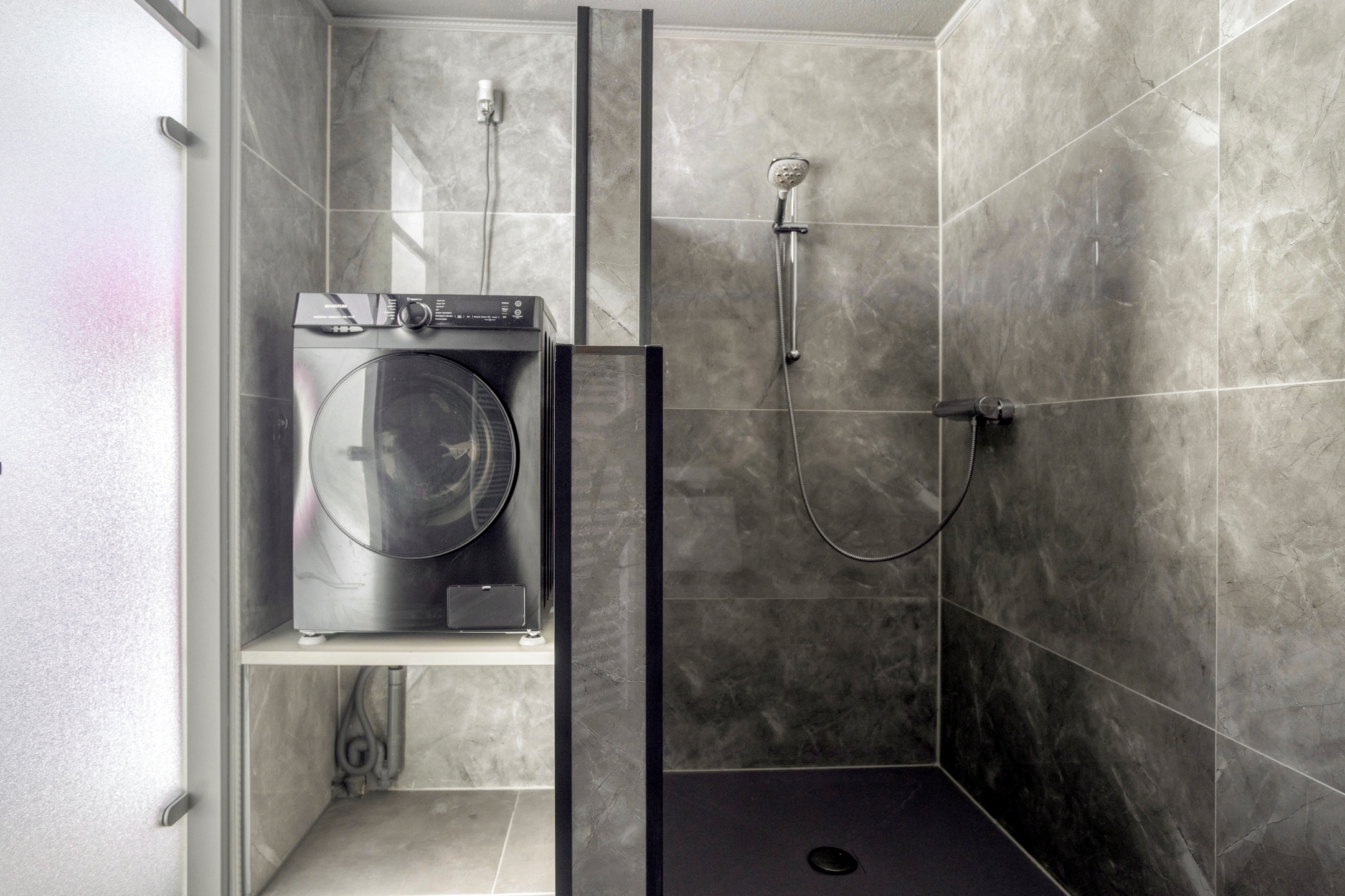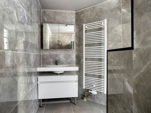 De badkamer is compleet uitgerust met een inloopdouche, een wasbak in een badkamermeubel en een spiegelwandkast. De ruimte is volledig betegeld en straalt een verzorgde en eigentijdse sfeer uit.