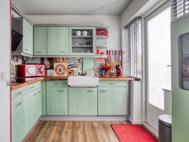 De keuken is uitgerust met diverse onder- en bovenkasten en voorzien van een inductiekookplaat, afzuigkap en een nieuwe Bosch vaatwasser. Via de loopdeur bereikt u het grote en enige dakterras van het complex, waar u heerlijk kunt genieten van het vrije uitzicht.