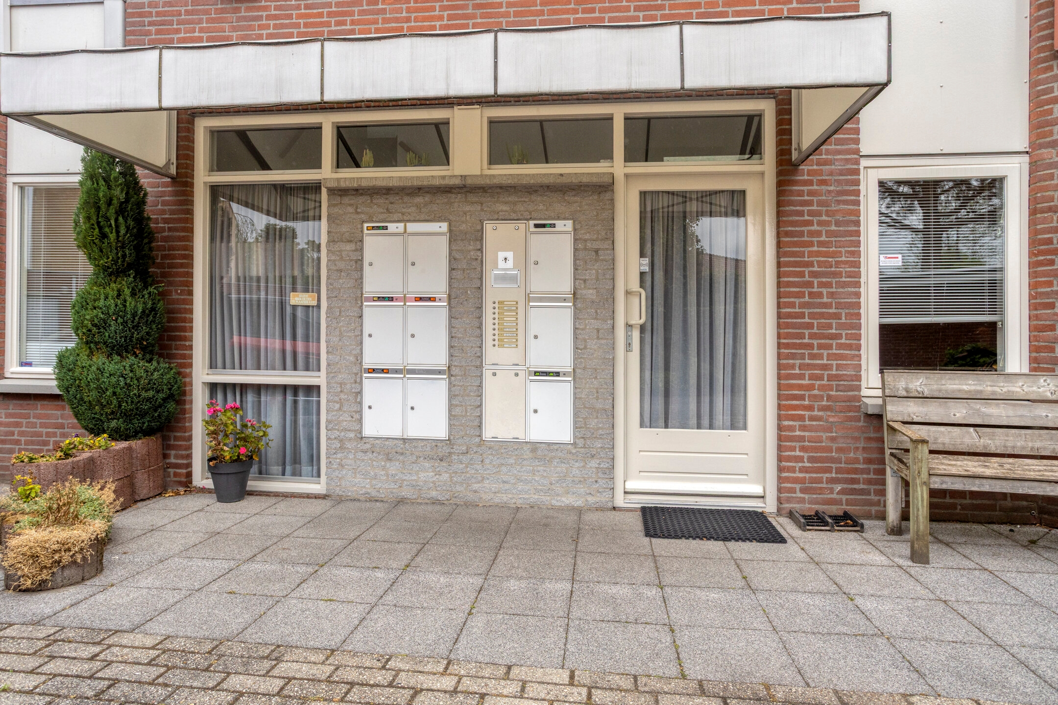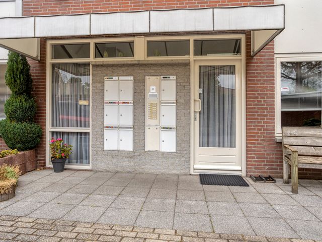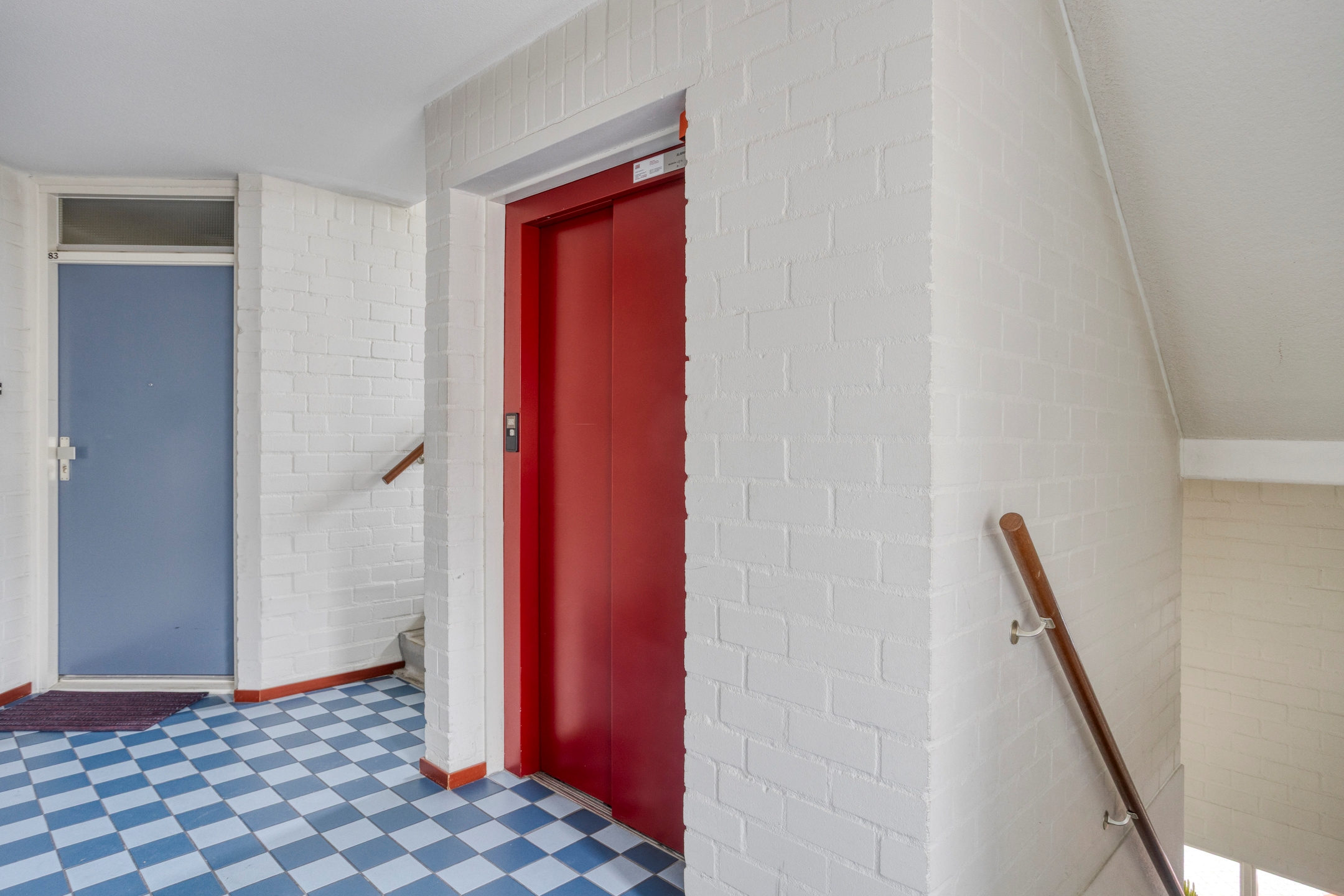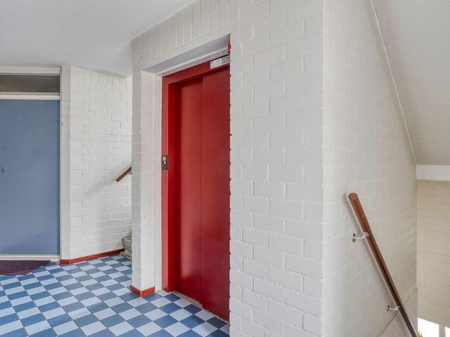 De centrale entree (met de brievenbussen) geeft toegang tot de hal met lift en het trappenhuis.