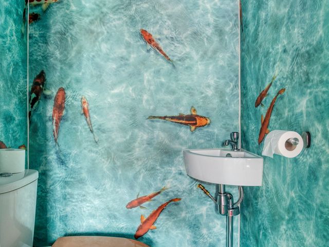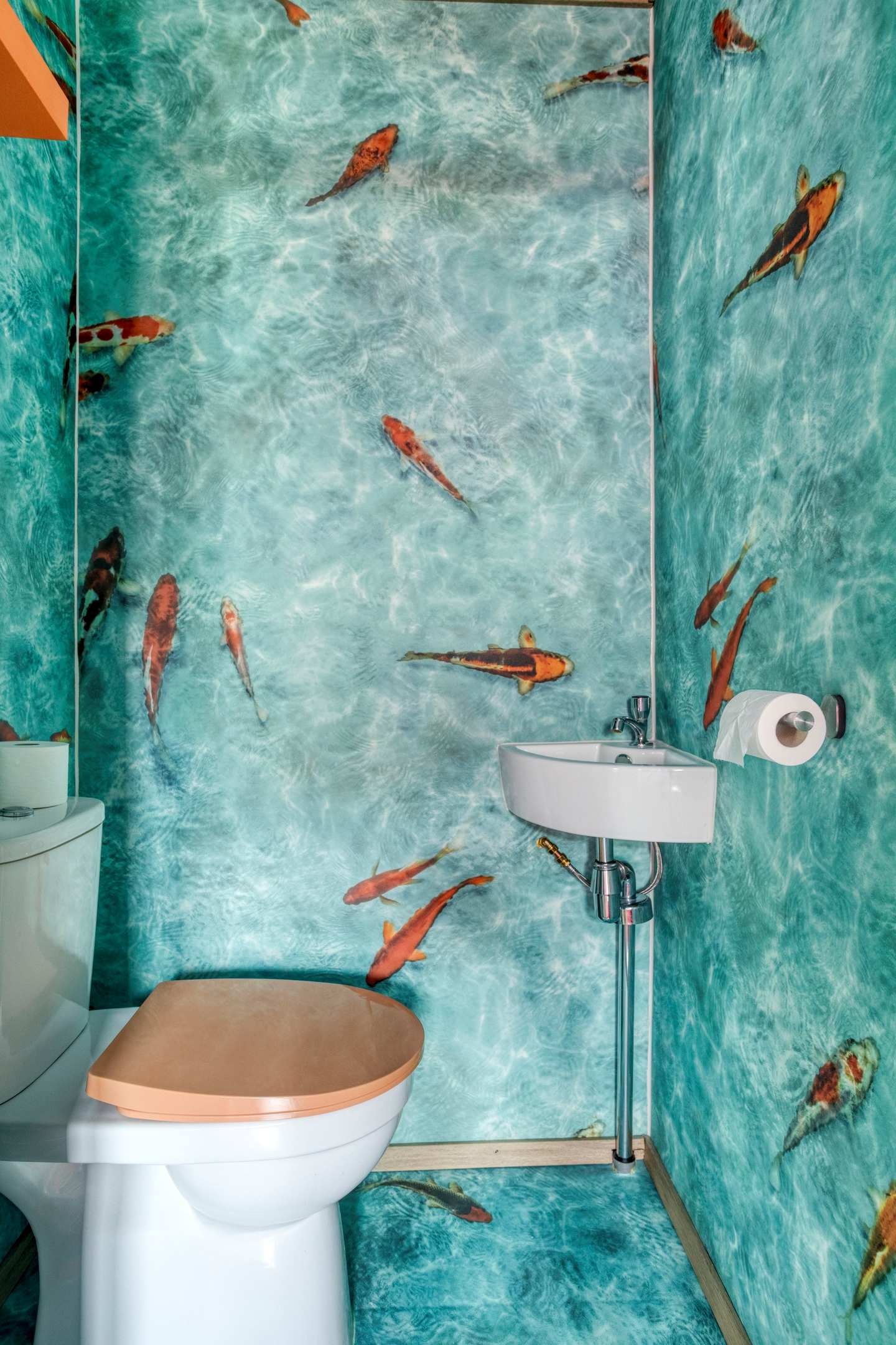 Het toilet is voorzien van een hoekfontein en een originele sfeer.