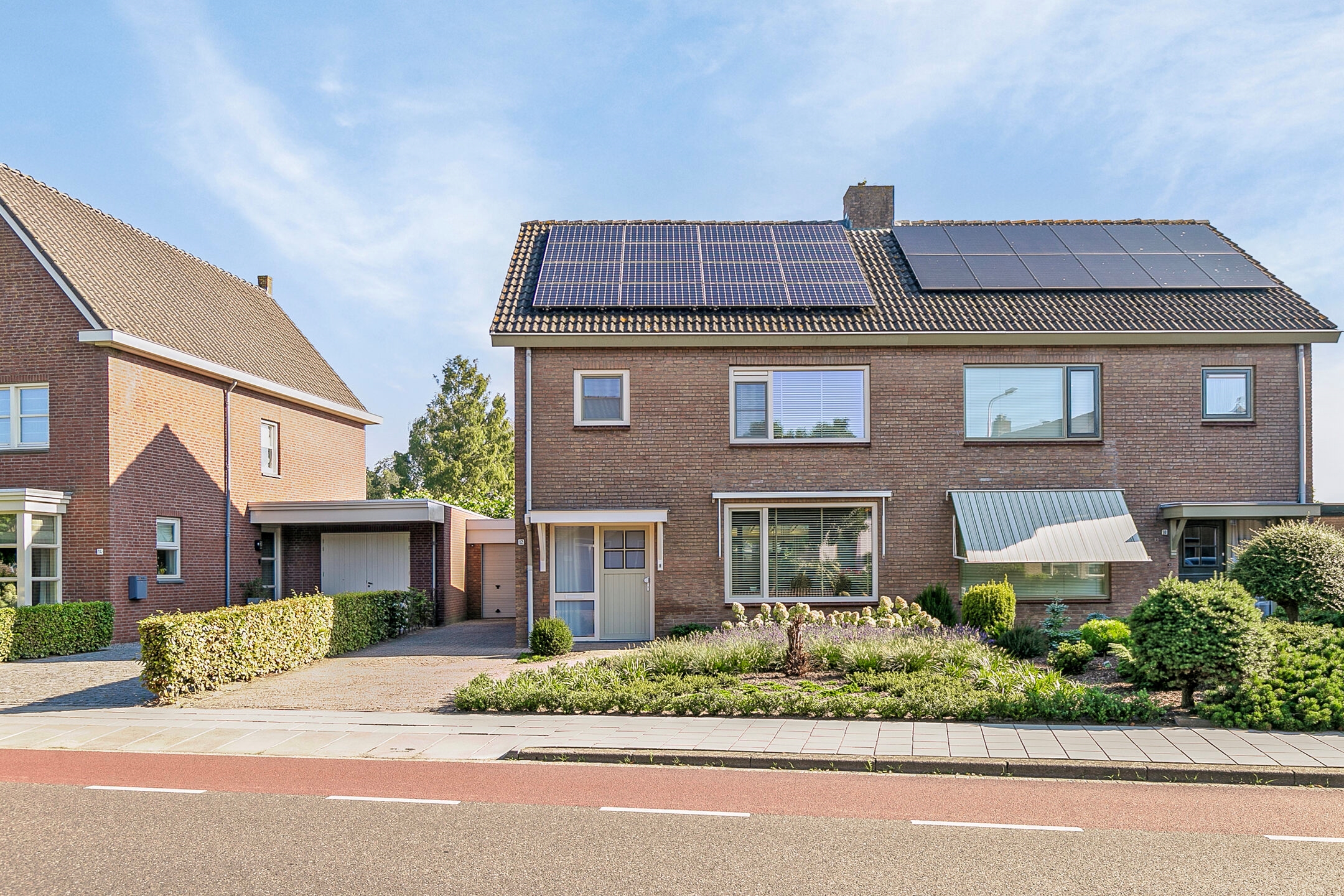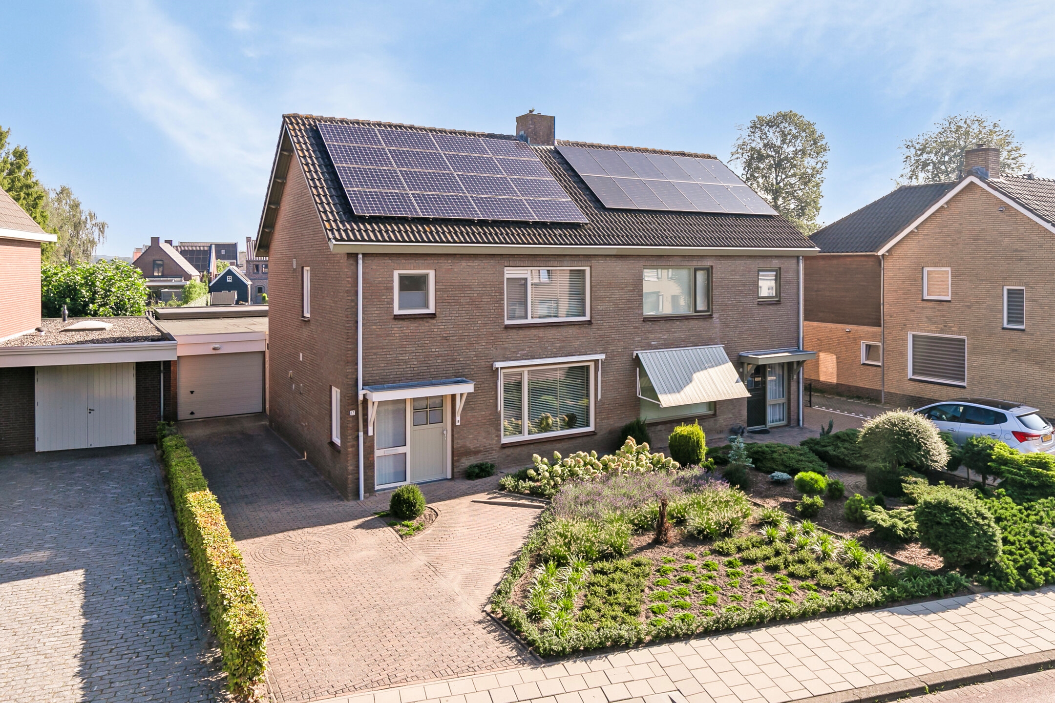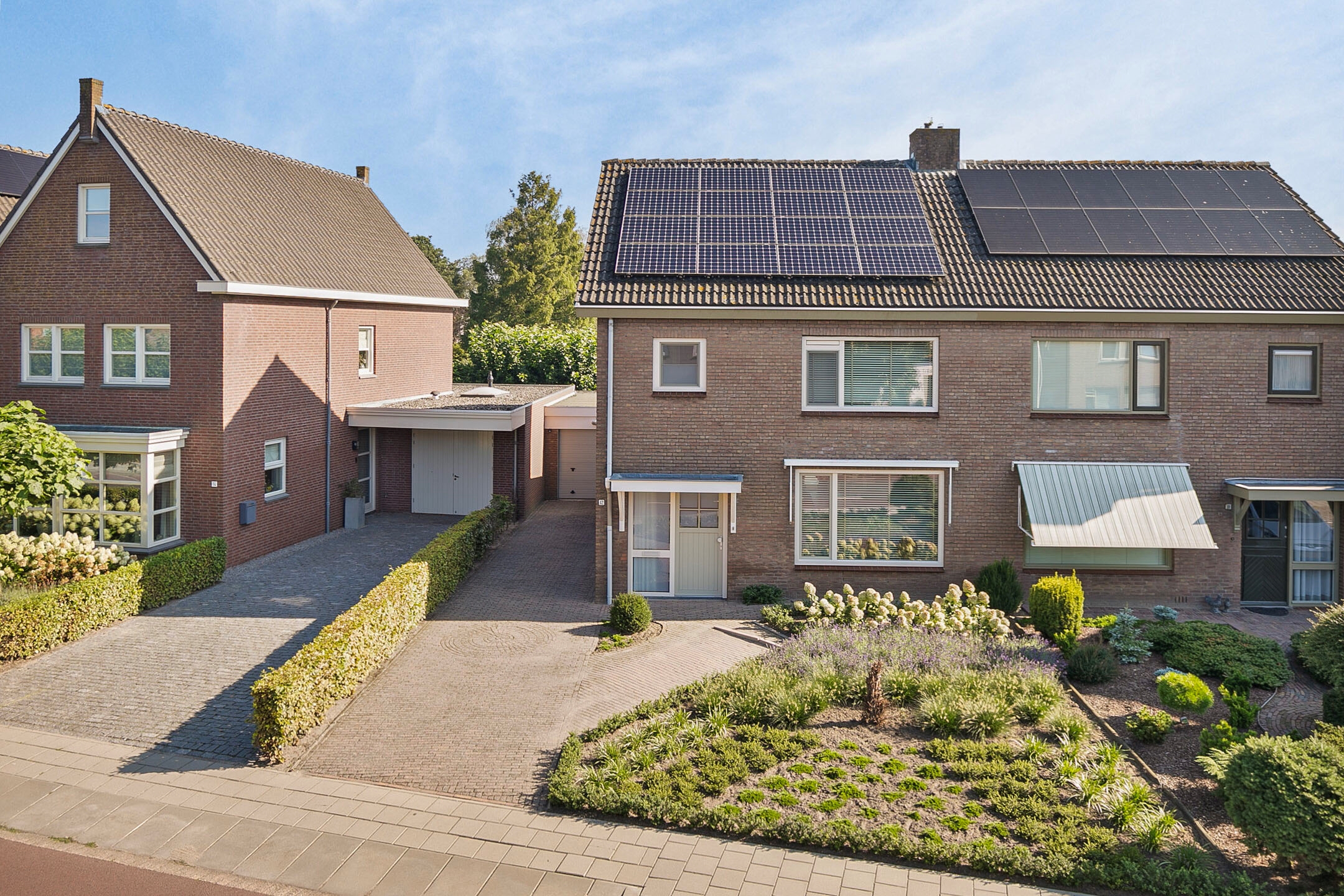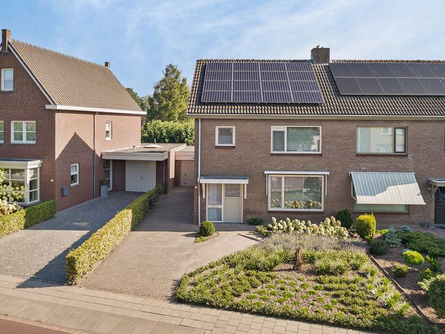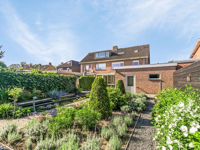 Bij aankomst op de oprit valt direct de verzorgde uitstraling van de woning op, met een keurig aangelegde voortuin, een ruime oprit en de voordeur in het zicht.