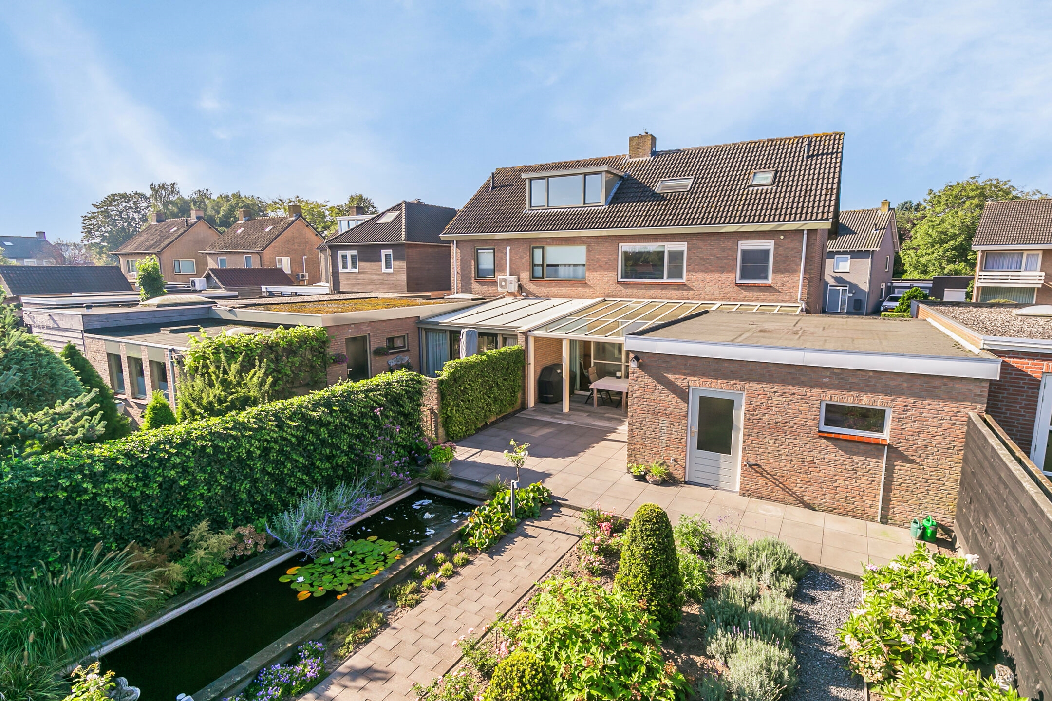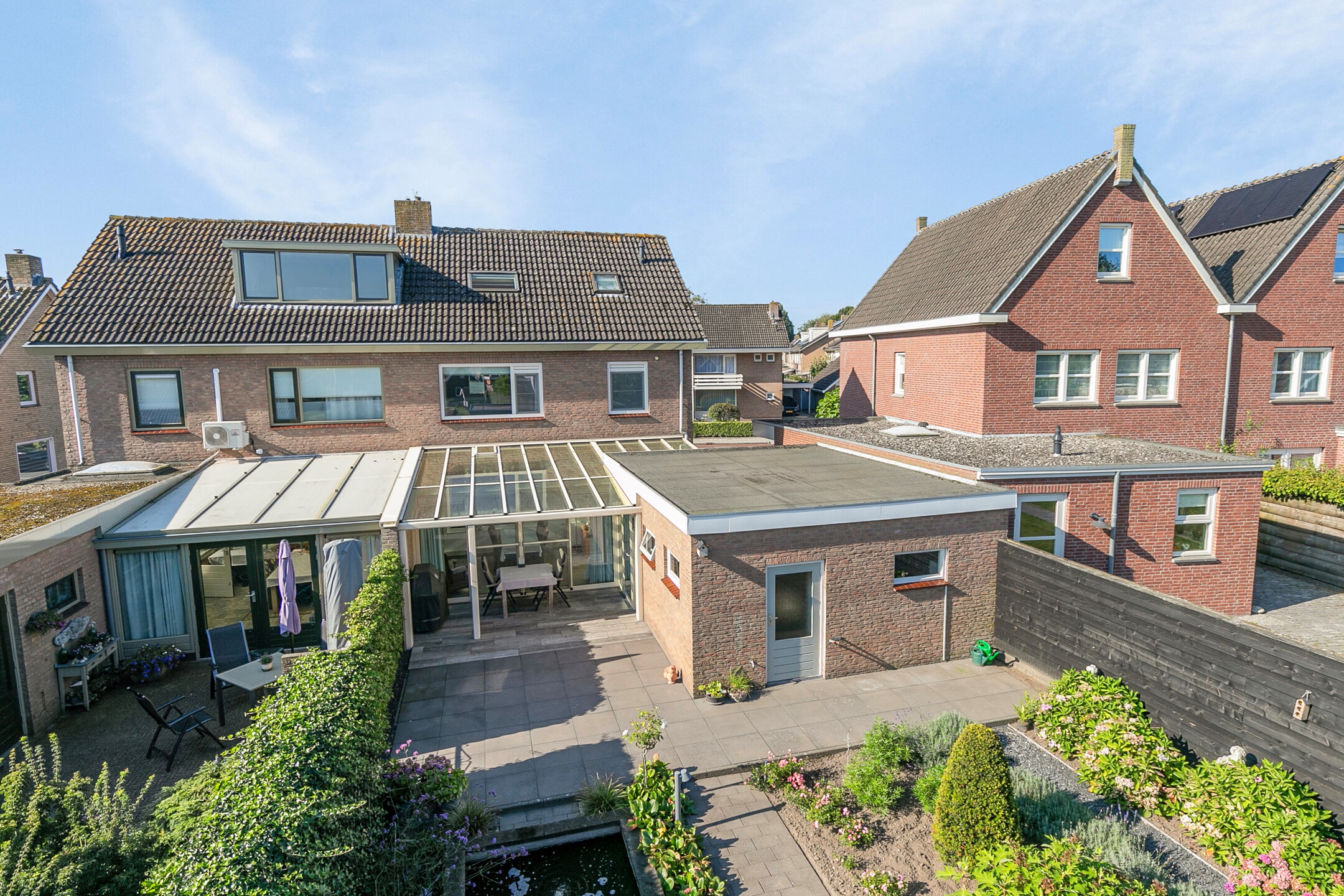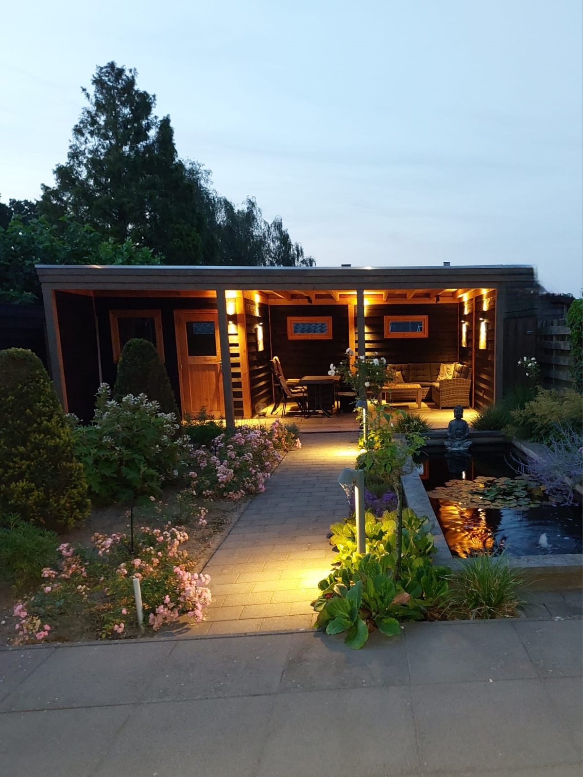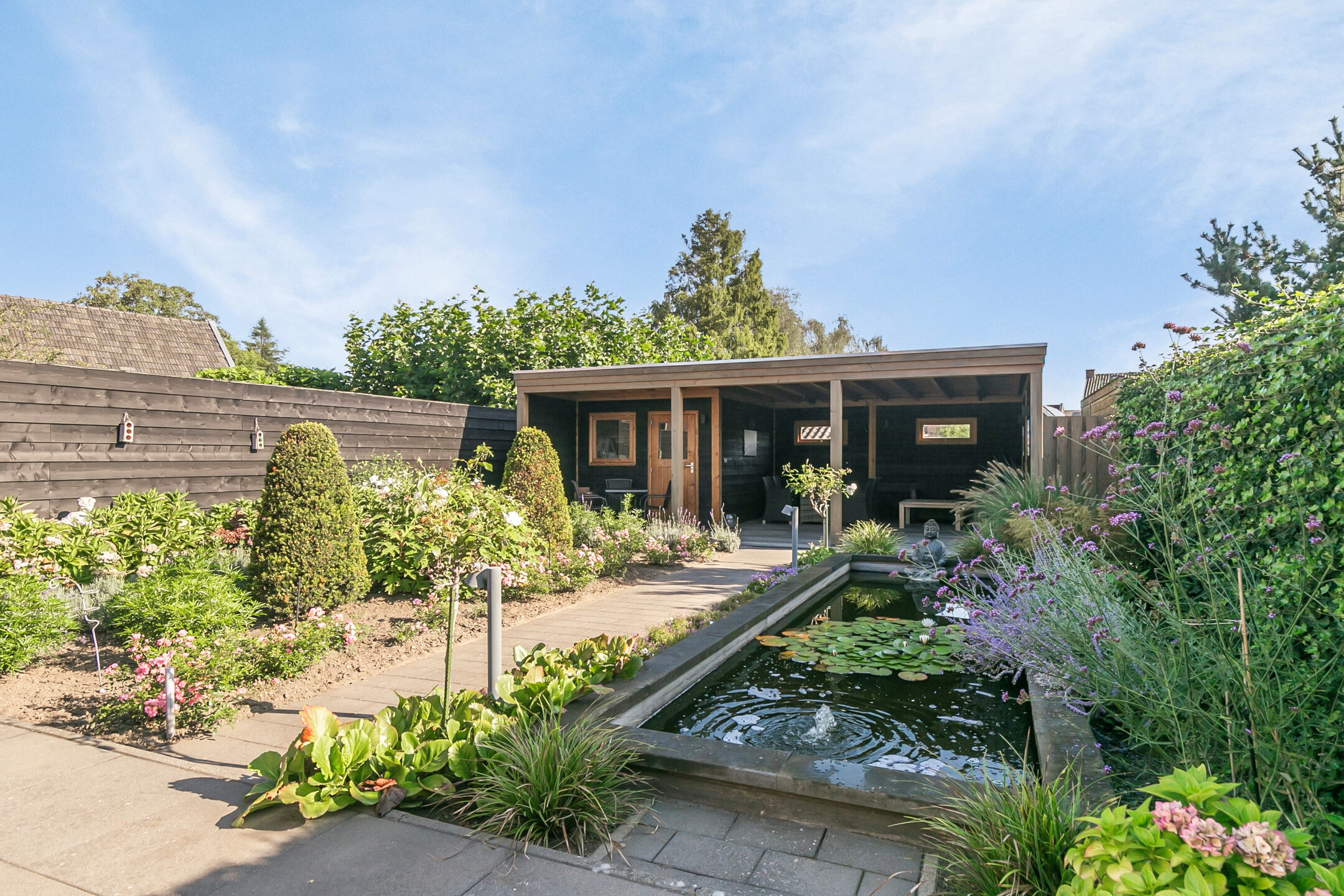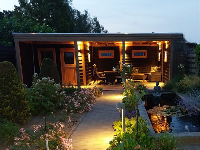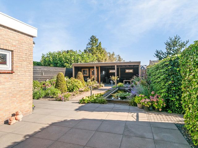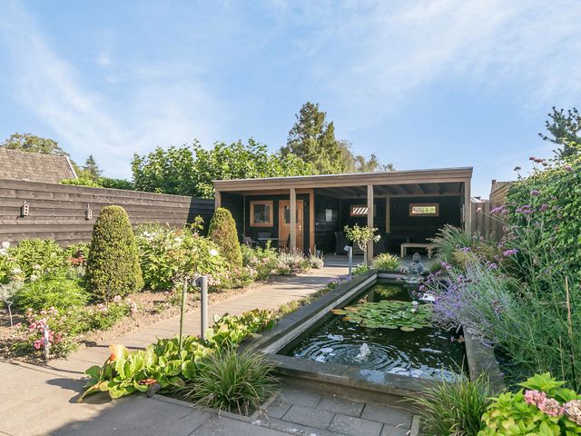 De achtertuin is smaakvol aangelegd met sierbestrating, een vijver en prachtige vaste planten. Deze tuin is voorzien van een sproeisysteem voor het besproeien van de tuin. Onder de overkapping, die is voorzien van sfeervolle verlichting, kun je optimaal genieten van de tuin en ontspannen in alle rust.
