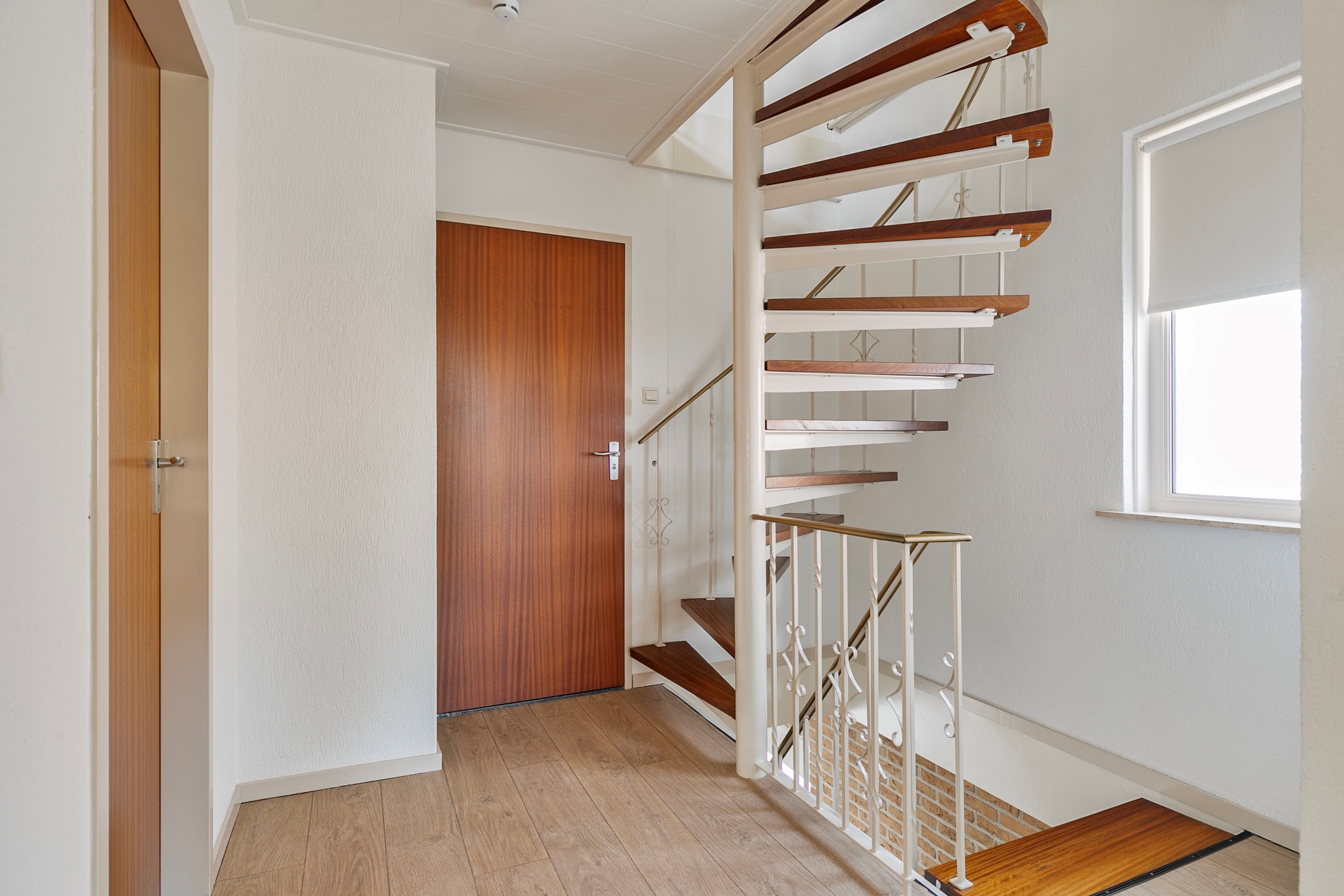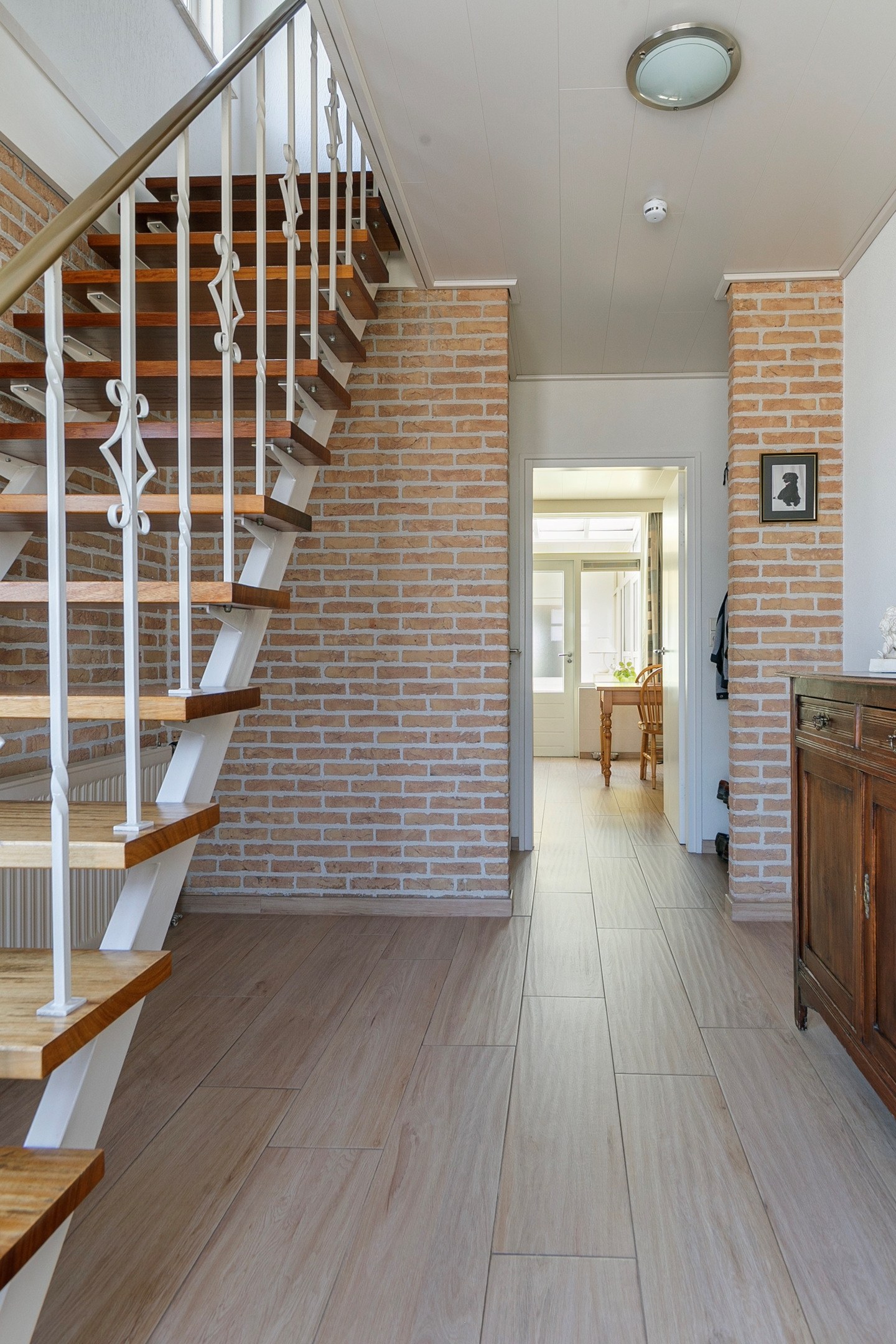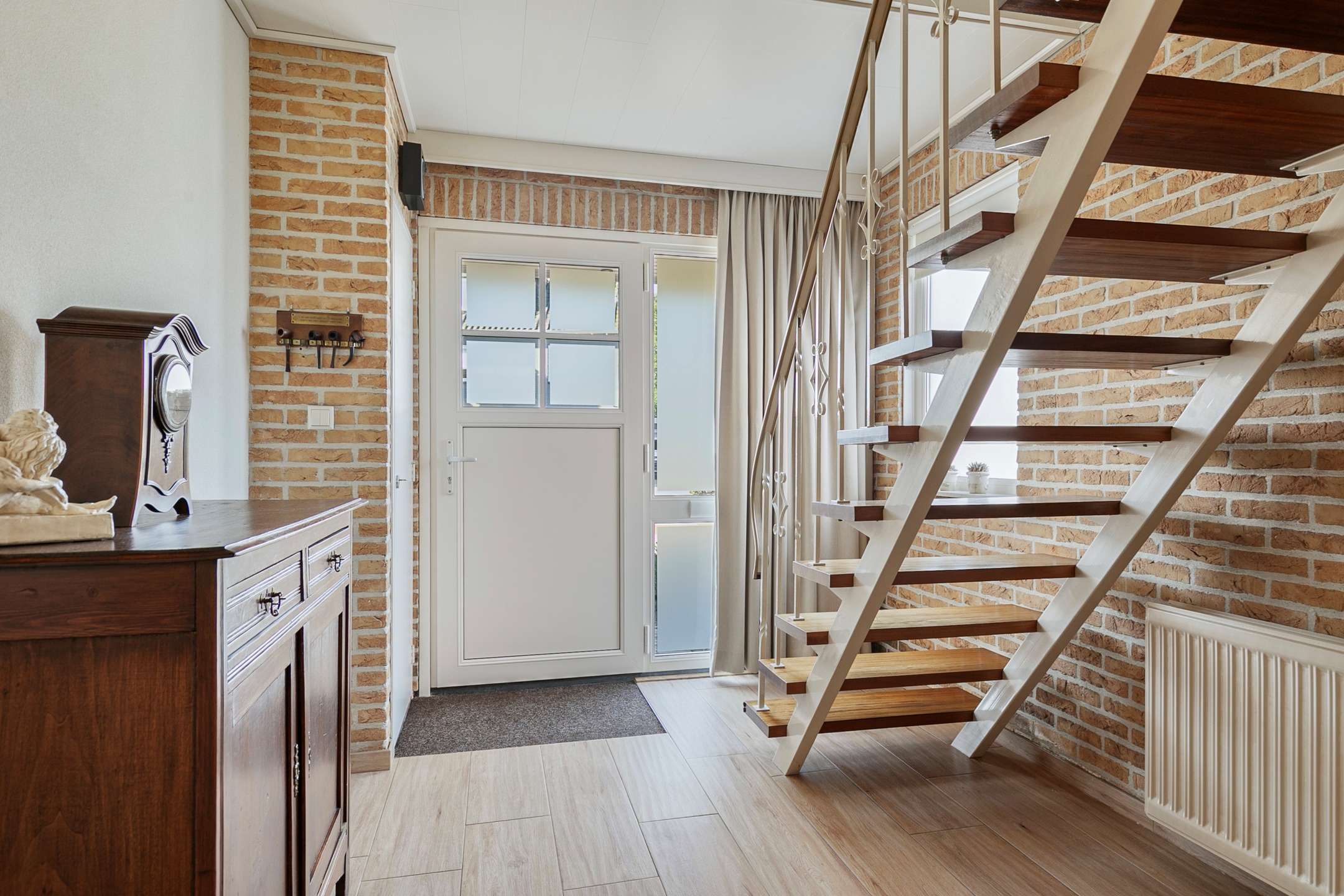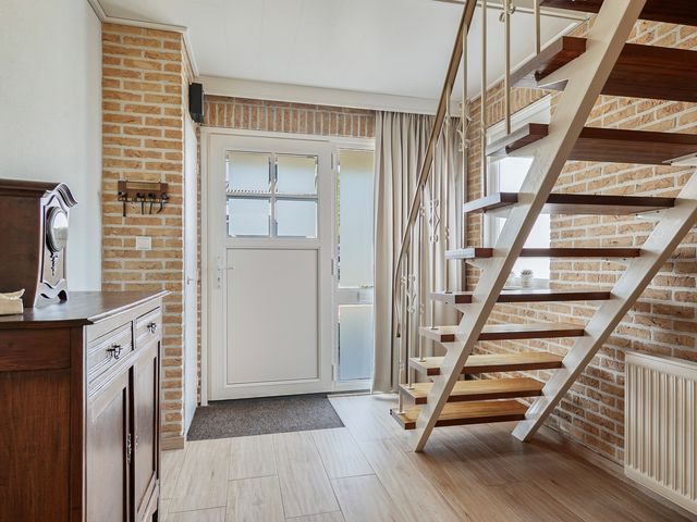 Bij het betreden van de hal word je gelijk verrast door de afwerking, een tegelvloer met een houtlook en een trap die leidt naar de eerste verdieping. Verder is er vanuit de hal toegang tot de keuken, het toilet en de meterkast.