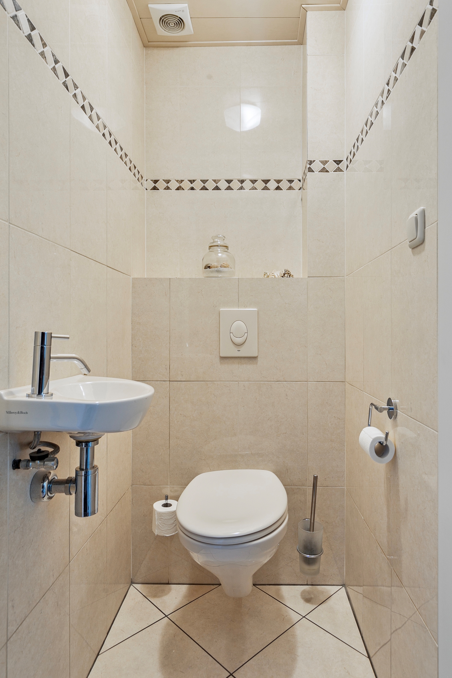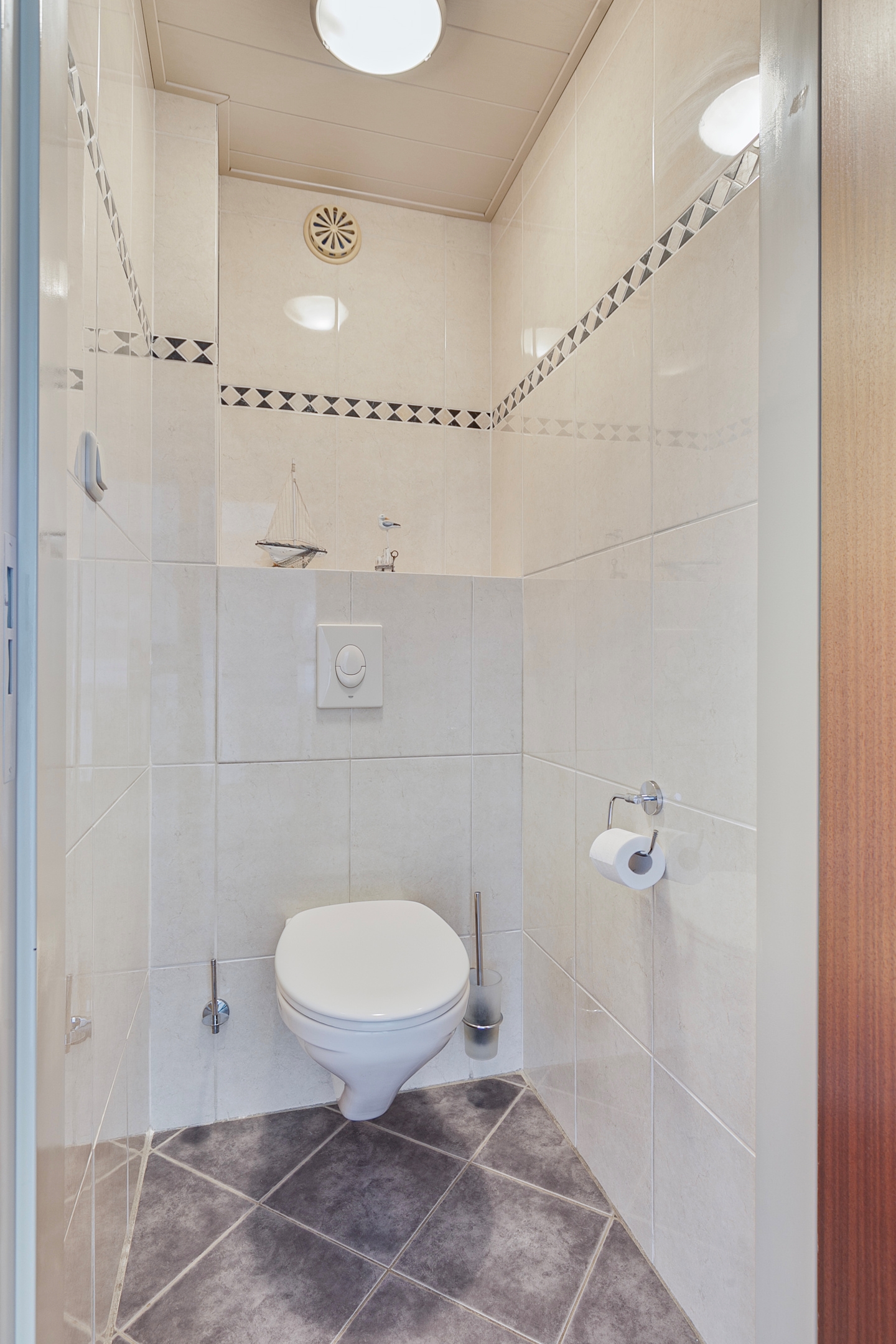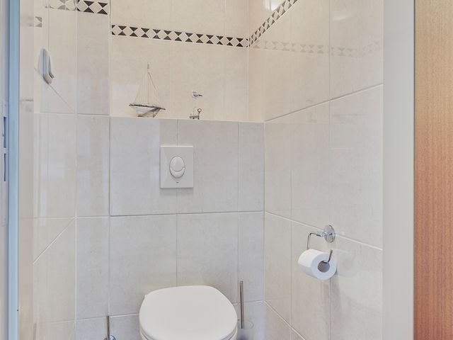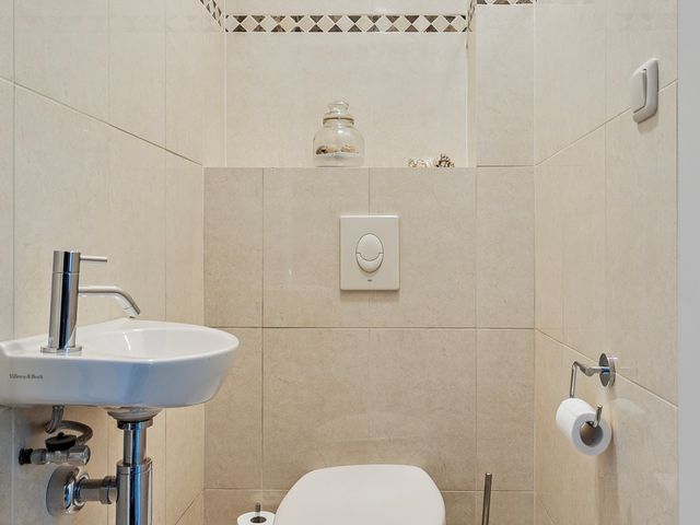 Het toilet is geheel betegeld een voorzien van een wandcloset en een fonteintje.