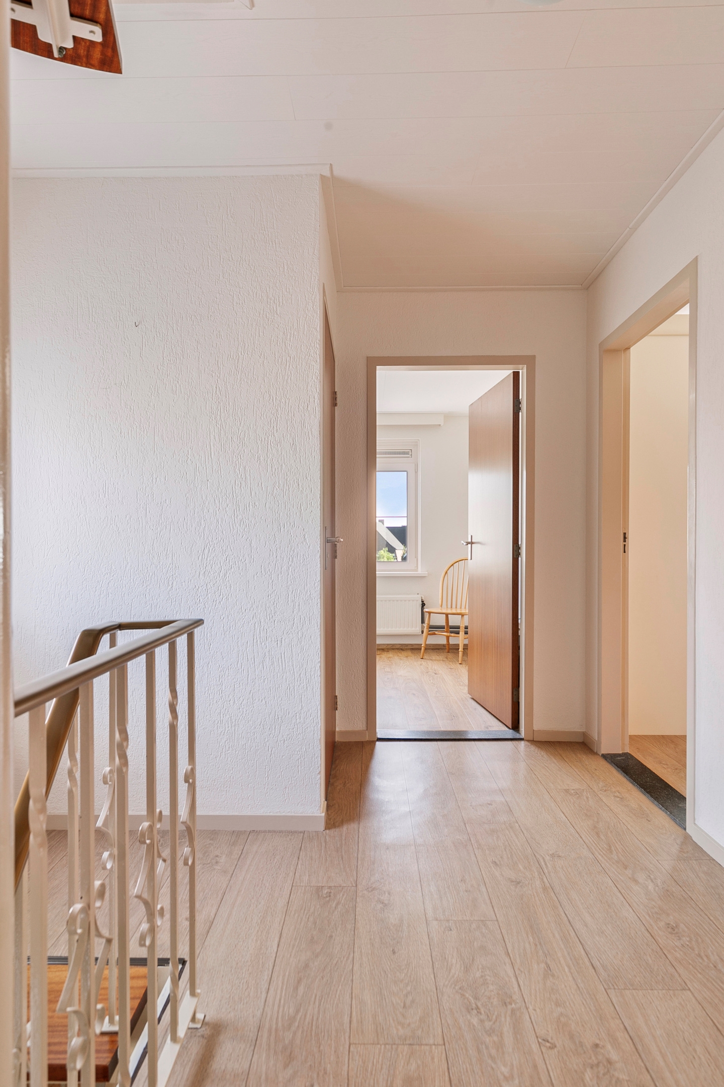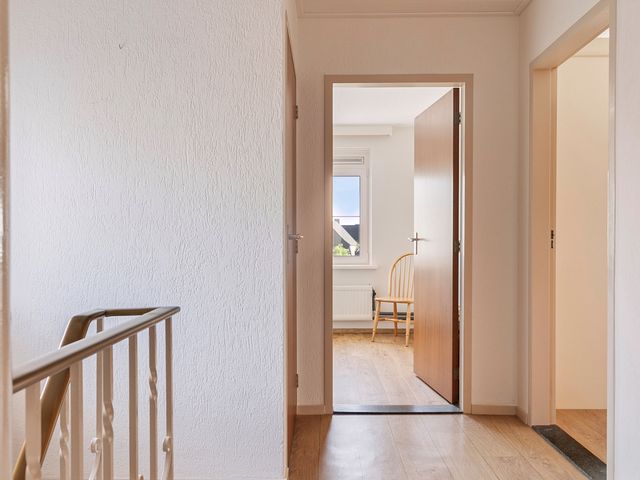 Via de trap in de hal bereik je de ruime overloop op de eerste verdieping. Vanuit hier zijn 3 slaapkamers, de badkamer, separate toiletruimte en de trap naar de zolderverdieping bereikbaar.