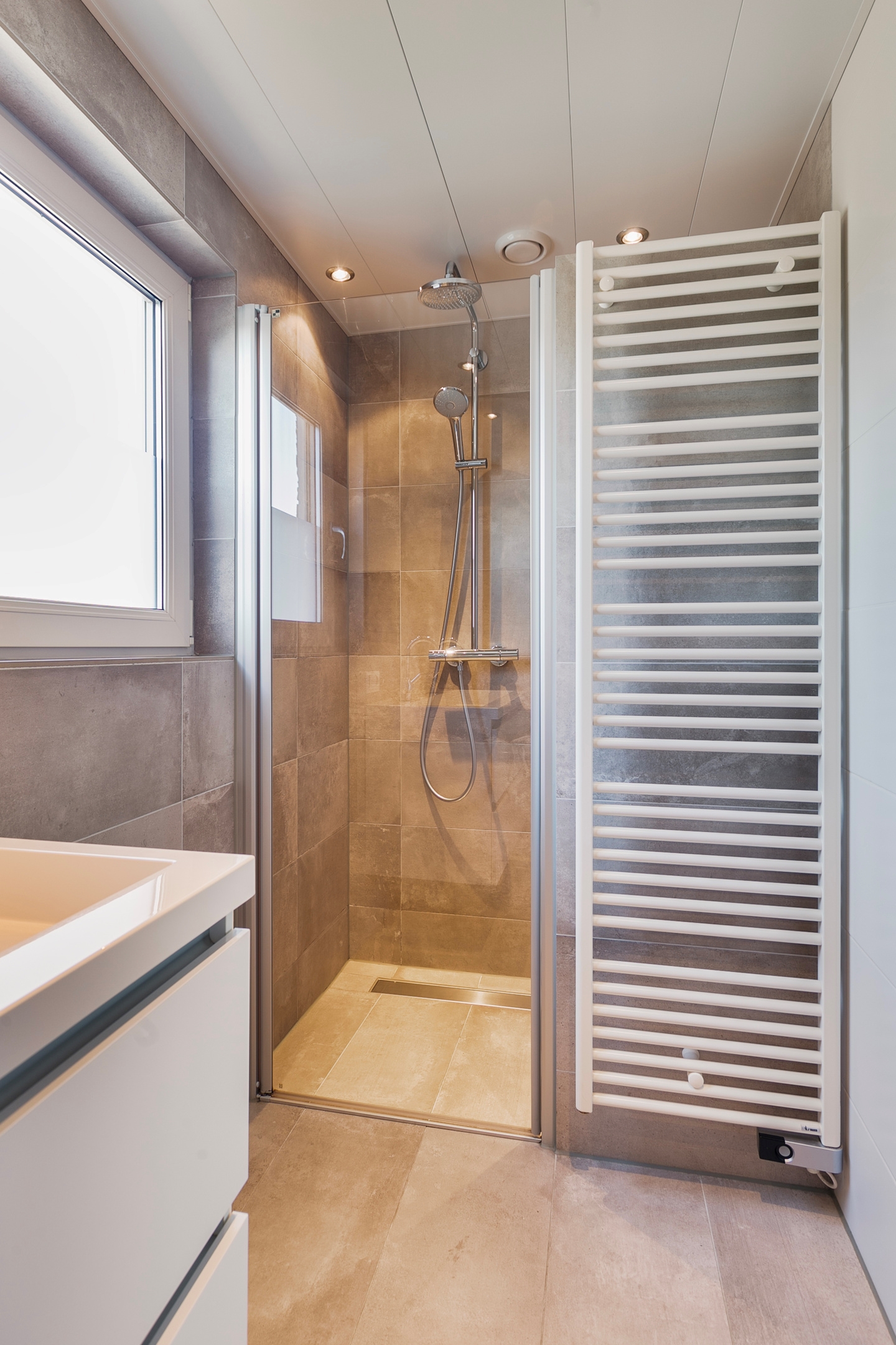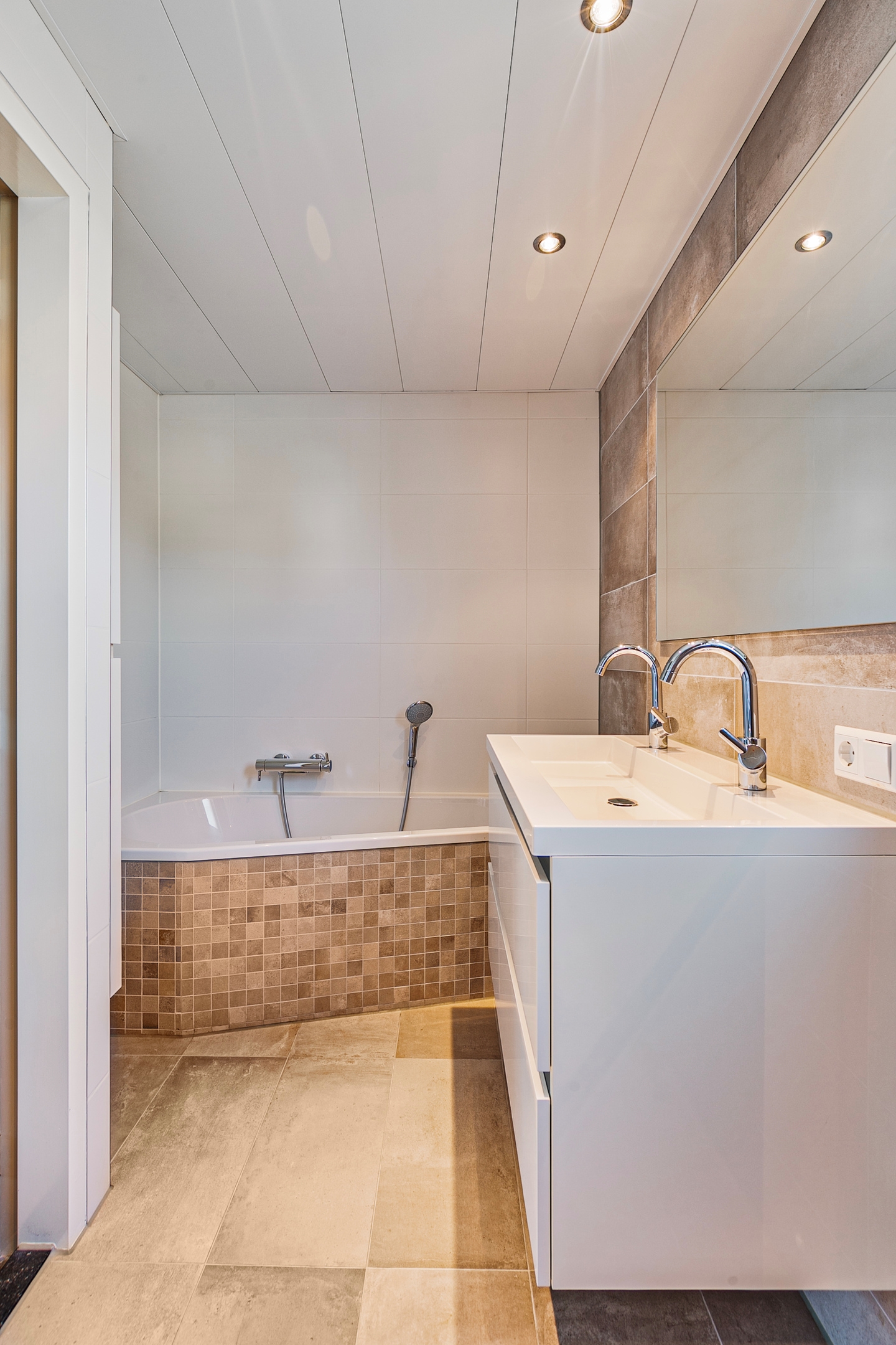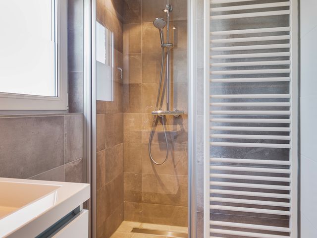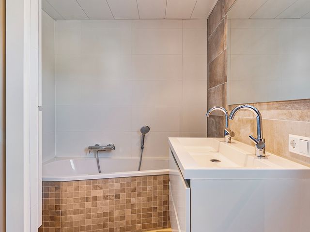 De moderne badkamer is uitgerust met alle benodigde voorzieningen, waaronder een ligbad, een inloopdouche met regen- en handdouche, een dubbele wastafel in een stijlvol badkamermeubel, elektrische verwarming en een verwarmde badkamerspiegel.