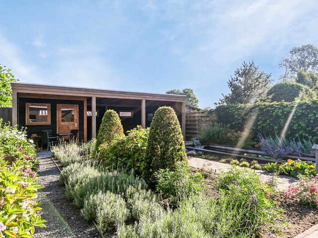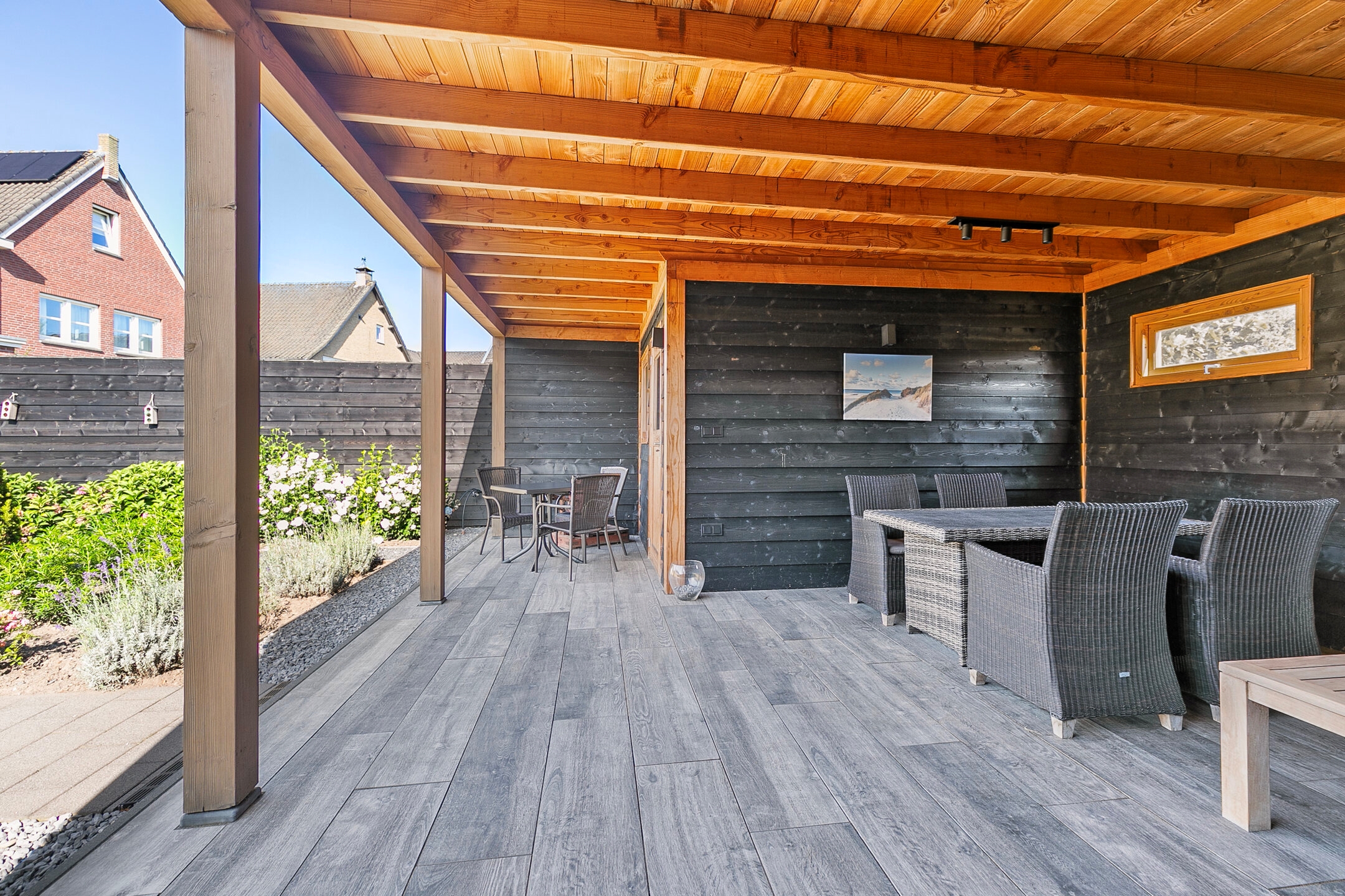 Maar dat is nog niet alles: in de prachtige achtertuin is een ruime en sfeervolle overkapping met berging geplaatst.